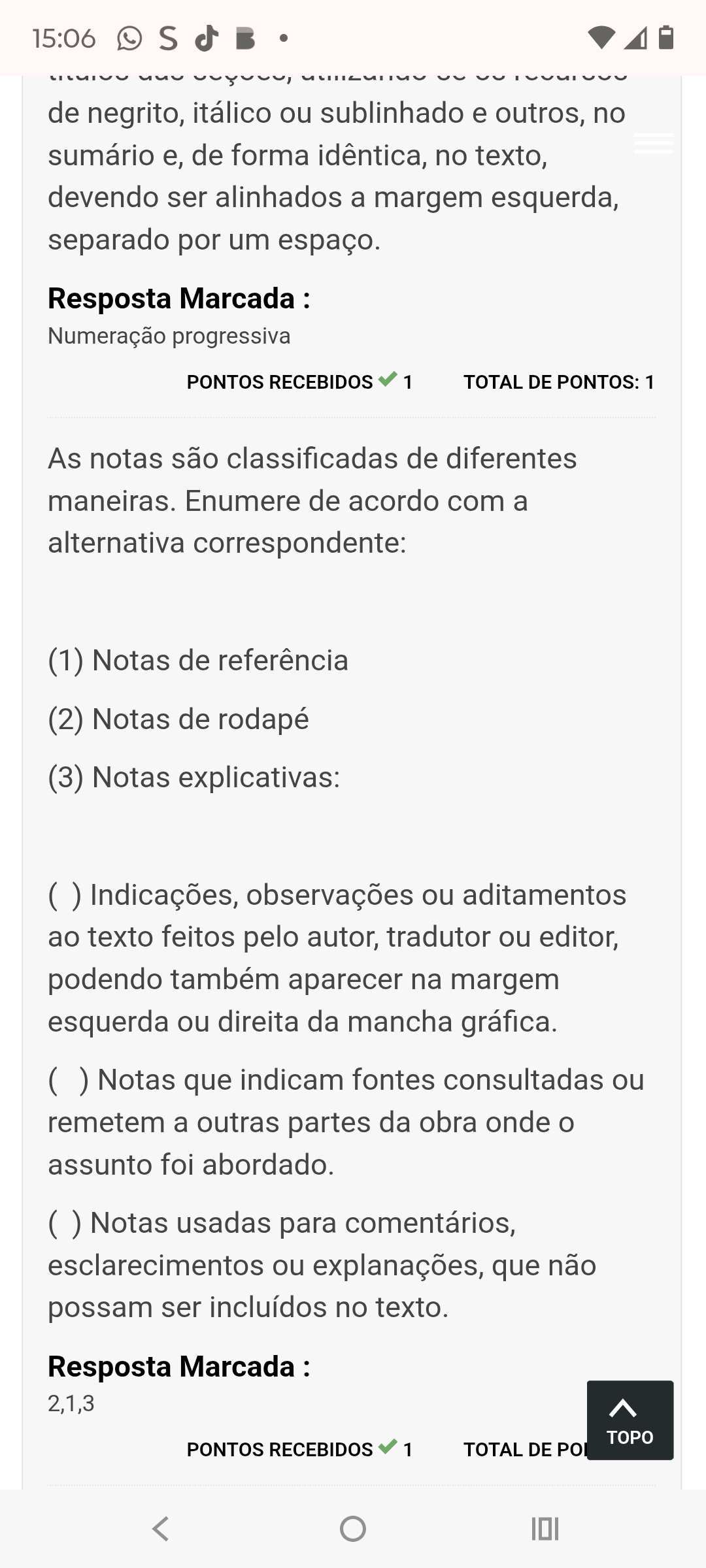 15:06 S de negrito, itálico ou sublinhado e outros, no sumário e, de forma idêntica, no texto, devendo ser alinhados a margem esquerda, separado por um espaço. Resposta Marcada : Numeração progressiva PONTOS RECEBIDOS 1 TOTAL DE PONTOS: 1 As notas são classificadas de diferentes maneiras. Enumere de acordo com a alternativa correspondente: (1) Notas de referência (2) Notas de rodapé (3) Notas explicativas: Indicações, observações ou aditamentos ao texto feitos pelo autor, tradutor ou editor, podendo também aparecer na margem esquerda ou direita da mancha gráfica. ( ) Notas que indicam fontes consultadas ou remetem a outras partes da obra onde o assunto foi abordado. Notas usadas para comentários, esclarecimentos ou explanações, que não possam ser incluídos no texto. Resposta Marcada : 2,1,3 TOPO PONTOS RECEBIDOS 1 TOTAL DE POI