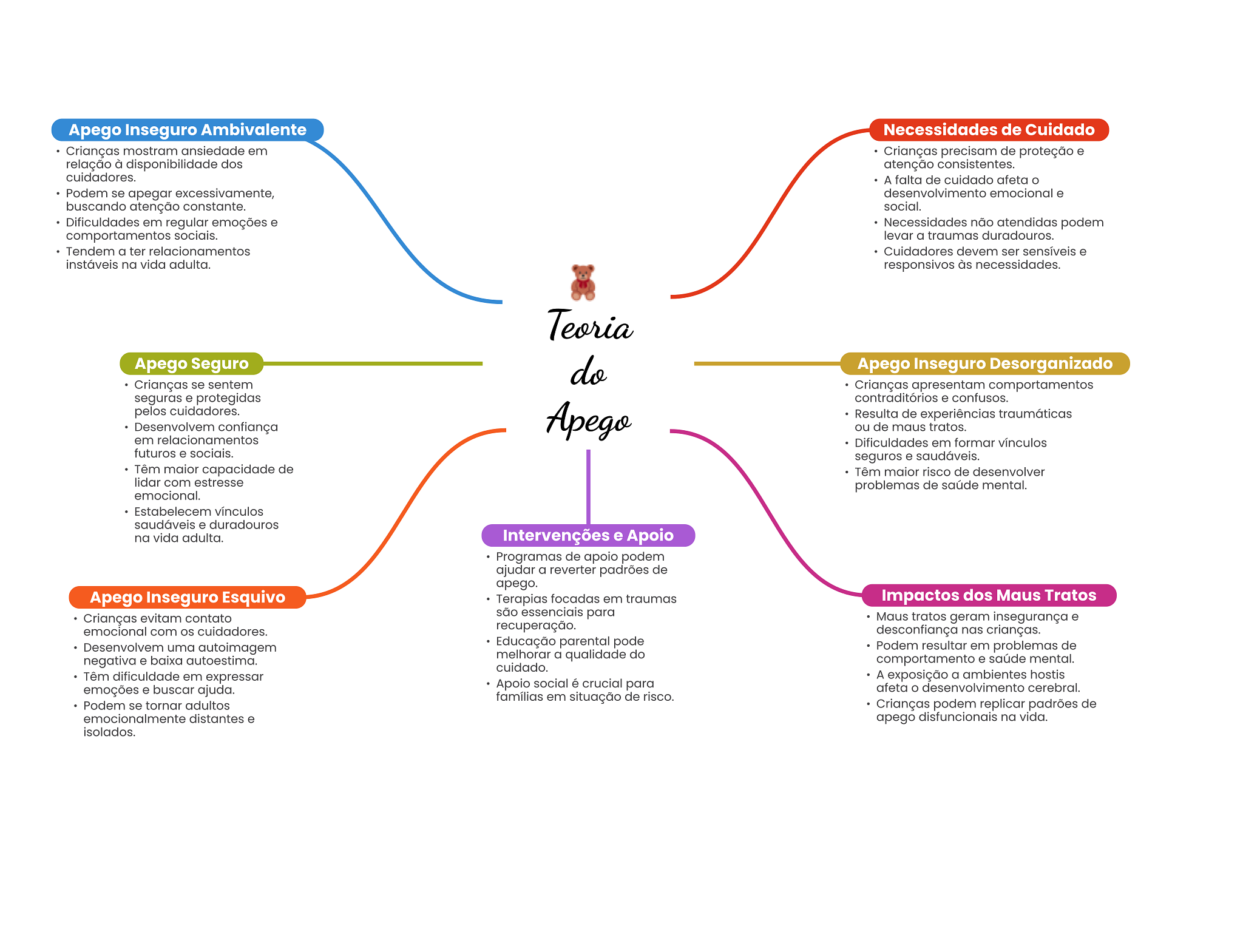 Apego Inseguro Ambivalente Necessidades de Cuidado Crianças mostram ansiedade em Crianças precisam de proteção e relação à disponibilidade dos atenção consistentes. cuidadores. A falta de cuidado afeta Podem se apegar excessivamente, desenvolvimento emocional e buscando atenção constante. social. Dificuldades em regular emoções e Necessidades não atendidas podem comportamentos sociais. levar a traumas duradouros. Tendem a ter relacionamentos Cuidadores devem ser sensíveis e instáveis na vida adulta. responsivos às necessidades. Teoria Apego Seguro do Apego Inseguro Desorganizado Crianças se sentem Crianças apresentam comportamentos seguras e protegidas contraditórios e confusos. pelos cuidadores. Desenvolvem confiança Apego Resulta de experiências traumáticas ou de maus tratos. em relacionamentos Dificuldades em formar vínculos futuros e sociais. seguros e saudáveis. Têm maior capacidade de Têm maior risco de desenvolver lidar com estresse problemas de saúde mental. emocional. Estabelecem vínculos saudáveis e duradouros na vida adulta. Intervenções e Apoio Programas de apoio podem ajudar a reverter padrões de apego. Apego Inseguro Esquivo Terapias focadas em traumas Impactos dos Maus Tratos Crianças evitam contato são essenciais para Maus tratos geram insegurança e emocional com cuidadores. recuperação. desconfiança nas crianças. Desenvolvem uma autoimagem Educação parental pode Podem resultar em problemas de negativa e baixa autoestima. melhorar a qualidade do comportamento e saúde mental. cuidado. Têm dificuldade em expressar A exposição a ambientes hostis emoções e buscar ajuda. Apoio social é crucial para afeta O desenvolvimento cerebral. famílias em situação de risco. Podem se tornar adultos Crianças podem replicar padrões de emocionalmente distantes e apego disfuncionais na vida. isolados.