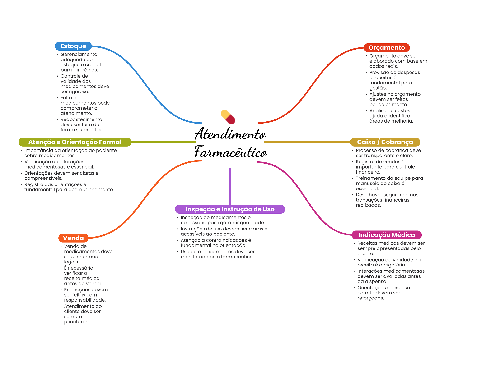 Estoque Orçamento Gerenciamento Orçamento deve ser adequado do elaborado com base em estoque é crucial dados reais. para farmácias. Previsão de despesas Controle de e receitas é validade dos fundamental para medicamentos deve gestão. ser rigoroso. Ajustes no orçamento Falta de devem ser feitos medicamentos pode periodicamente. comprometer Análise de custos atendimento. ajuda a identificar áreas de melhoria. deve ser feito de forma sistemática. Atendimento Atenção e Orientação Formal Caixa / Cobrança Importância da orientação ao paciente Farmacêutico Processo de cobrança deve sobre medicamentos. ser transparente e claro. Verificação de interações Registro de vendas é medicamentosas é essencial. importante para controle Orientações devem ser claras e financeiro. compreensíveis. Treinamento da equipe para Registro das orientações é manuseio do caixa é fundamental para acompanhamento. essencial. Deve haver segurança nas transações financeiras realizadas. Inspeção e Instrução de Uso Inspeção de medicamentos é necessária para garantir qualidade. Instruções de uso devem ser claras e acessíveis ao paciente. Venda Indicação Médica Atenção a contraindicações é Receitas médicas devem ser Venda de fundamental na orientação. sempre apresentadas pelo medicamentos deve Uso de medicamentos deve ser cliente. seguir normas monitorado pelo farmacêutico. legais. Verificação da validade da É necessário receita é obrigatória. verificar a Interações medicamentosas receita médica devem ser avaliadas antes antes da venda. da dispensa. Promoções devem Orientações sobre uso ser feitas com correto devem ser responsabilidade. reforçadas. Atendimento ao cliente deve ser sempre prioritário.