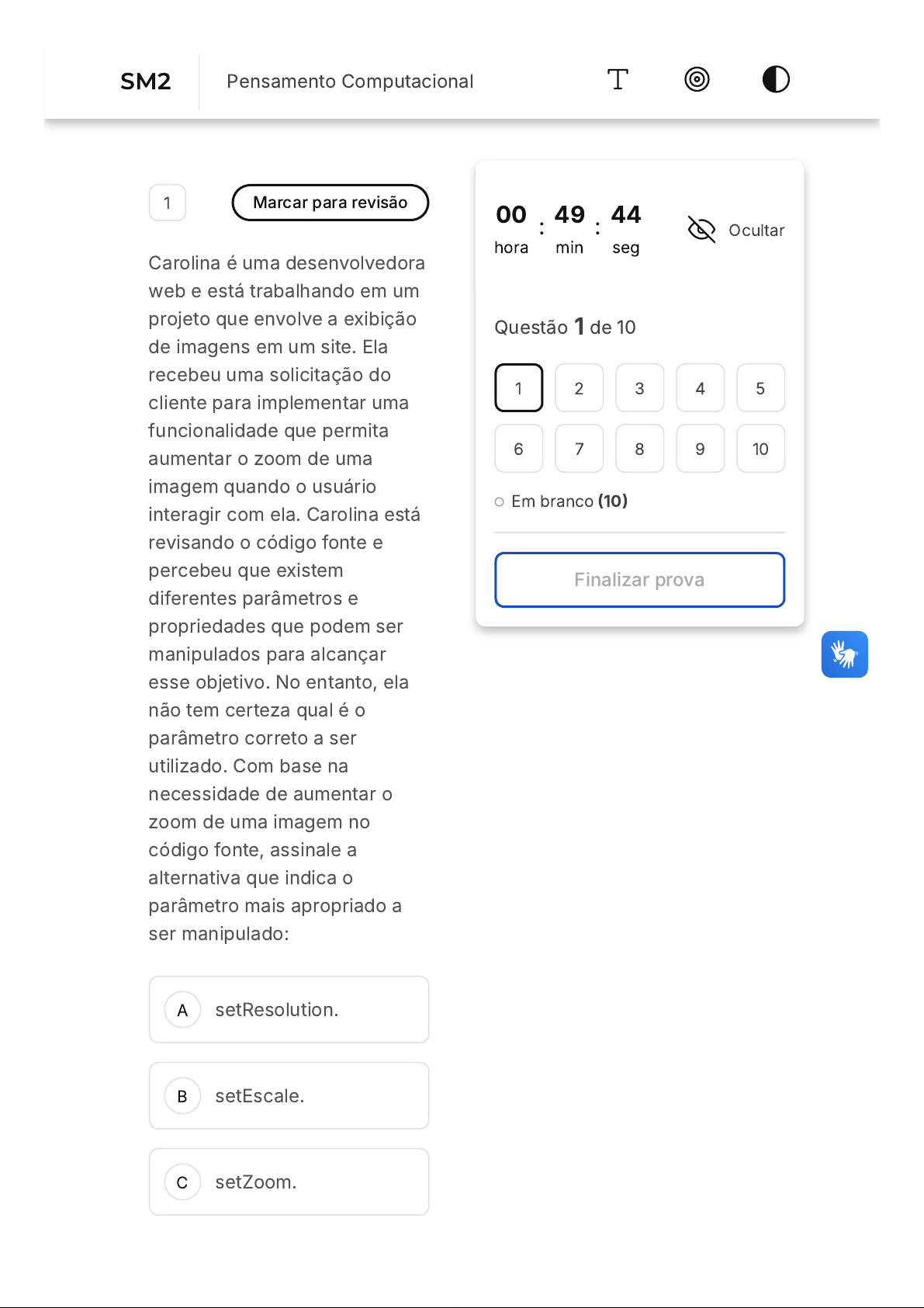 A B C 1 Marcar para revisão Carolina é uma desenvolvedora web e está trabalhando em um projeto que envolve a exibição de imagens em um site. Ela recebeu uma solicitação do cliente para implementar uma funcionalidade que permita aumentar o zoom de uma imagem quando o usuário interagir com ela. Carolina está revisando o código fonte e percebeu que existem diferentes parâmetros e propriedades que podem ser manipulados para alcançar esse objetivo. No entanto, ela não tem certeza qual é o parâmetro correto a ser utilizado. Com base na necessidade de aumentar o zoom de uma imagem no código fonte, assinale a alternativa que indica o parâmetro mais apropriado a ser manipulado: setResolution. setEscale. setZoom. 00 hora : 49 min : 44 seg Ocultar Questão 1 de 10 Em branco (10) Finalizar prova 1 2 3 4 5 6 7 8 9 10 SM2 Pensamento Computacional D E A B C D E setOpacity. setSize. 2 Marcar para revisão No pensamento computacional, qual é o conceito fundamental que envolve a capacidade de simplificar um problema complexo por meio da identificação de características essenciais e ignorando detalhes irrelevantes? Decomposição. Algoritmo. Iteração. Abstração. Padrões. 3 Marcar para revisão No pensamento computacional, qual é o conceito fundamental que envolve a capacidade de A B C D E escrever soluções na forma de instruções que o computador é capaz de seguir automaticamente para chegar ao resultado desejado? Fatoração. Automação. Iteração. Imaginação. Padrões. 4 Marcar para revisão Um hospital utiliza imagens para diagnosticar doenças. Recentemente, eles decidiram implementar um sistema de processamento de imagens para analisar raios-X e tomografias. Por que o hospital deve usar imagens em grayscale para este sistema? A B C D E Para melhorar a fidelidade das cores das imagens Para reduzir o tempo e a complexidade do processamento das imagens Para criar imagens artísticas dos exames médicos Para facilitar a impressão colorida dos relatórios médicos Para garantir que todas as imagens tenham a mesma resolução 5 Marcar para revisão Uma agência de design gráfico está trabalhando em um projeto que exige a criação de gráficos digitais e ilustrações com uma paleta de cores rica e diversificada. Por que a agência deve utilizar o modelo RGB para este projeto? A B C D E Para simplificar a estrutura de dados dos gráficos Para reduzir o tempo de processamento das imagens Para permitir a criação de uma vasta gama de cores Para facilitar a conversão das imagens para grayscale Para reduzir a quantidade de dados armazenados 6 Marcar para revisão Considere uma grade bidimensional de pixels onde o sistema de coordenadas tem origem no canto superior esquerdo, adotando o formato (coluna, linha) e iniciando em (0,0). A linha é incrementada para baixo, e a coluna é incrementada para a direita. Qual das afirmativas abaixo é correta? A B C D E O pixel localizado em (0,5) está na sexta coluna e na primeira linha. O pixel localizado em (3,0) está na quarta linha e na primeira coluna. O pixel (2,4) está na terceira coluna e na quinta linha. O pixel (1,1) está na segunda coluna e na segunda linha, mas está posicionado exatamente no centro da grade. O pixel (5,2) está na quinta coluna e na terceira linha. 7 Marcar para revisão Uma empresa de tecnologia está desenvolvendo um sistema de visão computacional para reconhecimento facial em tempo real. Por que a empresa deve utilizar imagens em A B C D E grayscale para o sistema de visão computacional? Para aumentar o uso de memória do sistema Para simplificar a identificação de áreas homogêneas Para melhorar a qualidade visual das imagens de reconhecimento Para permitir a criação de gráficos coloridos Para garantir a consistência das cores nas imagens 8 Marcar para revisão Um departamento de RH utiliza uma IA para triar currículos para uma vaga de liderança. A IA foi treinada com o histórico de contratações da empresa dos últimos 20 anos. Após a triagem, percebe-se que o sistema descartou a maioria das candidatas mulheres, A B C mesmo as com qualificações excelentes. Identifique o risco ético demonstrado pelo comportamento da IA neste cenário. O risco de viés algorítmico, onde preconceitos presentes nos dados de treinamento são aprendidos e amplificados. A "alucinação da IA", na qual a ferramenta inventa motivos para desclassificar as candidatas. A violação da privacidade das candidatas, pois seus currículos foram lidos por um sistema automatizado. D E O limite de processamento da IA, que não conseguiu analisar todos os currículos de forma adequada. Um erro na programação do sistema que o fez interpretar de forma incorreta o critério de qualificação. 9 Marcar para revisão Um profissional de saúde deseja usar uma plataforma de IA gratuita e aberta na internet para resumir o histórico clínico de um paciente, a fim de agilizar a preparação para uma consulta. O histórico contém nome completo, CPF, diagnóstico e resultados de exames. Com base nos princípios de privacidade e na Lei Geral de Proteção de Dados (LGPD), identifique a ação correta que este profissional deve tomar. A B C D E Evitar o compartilhamento de quaisquer dados sensíveis em plataformas abertas, protegendo a privacidade do paciente. Utilizar a ferramenta, pois a IA garante a confidencialidade de todas as informações inseridas pelo usuário. Inserir os dados na plataforma, mas se certificar de apagar o histórico de conversas logo após obter o resumo. Pedir autorização verbal ao paciente para usar a ferramenta, o que é suficiente para cumprir a legislação. Usar o modo de navegação anônima do navegador, pois isso impede que a plataforma armazene os dados. A B C 10 Marcar para revisão A ideia de que a IA pode ser vista como uma "calculadora de ideias": ela organiza, resume e sugere, mas não possui valores, ética ou senso crítico. A decisão final, portanto, deve sempre permanecer nas m