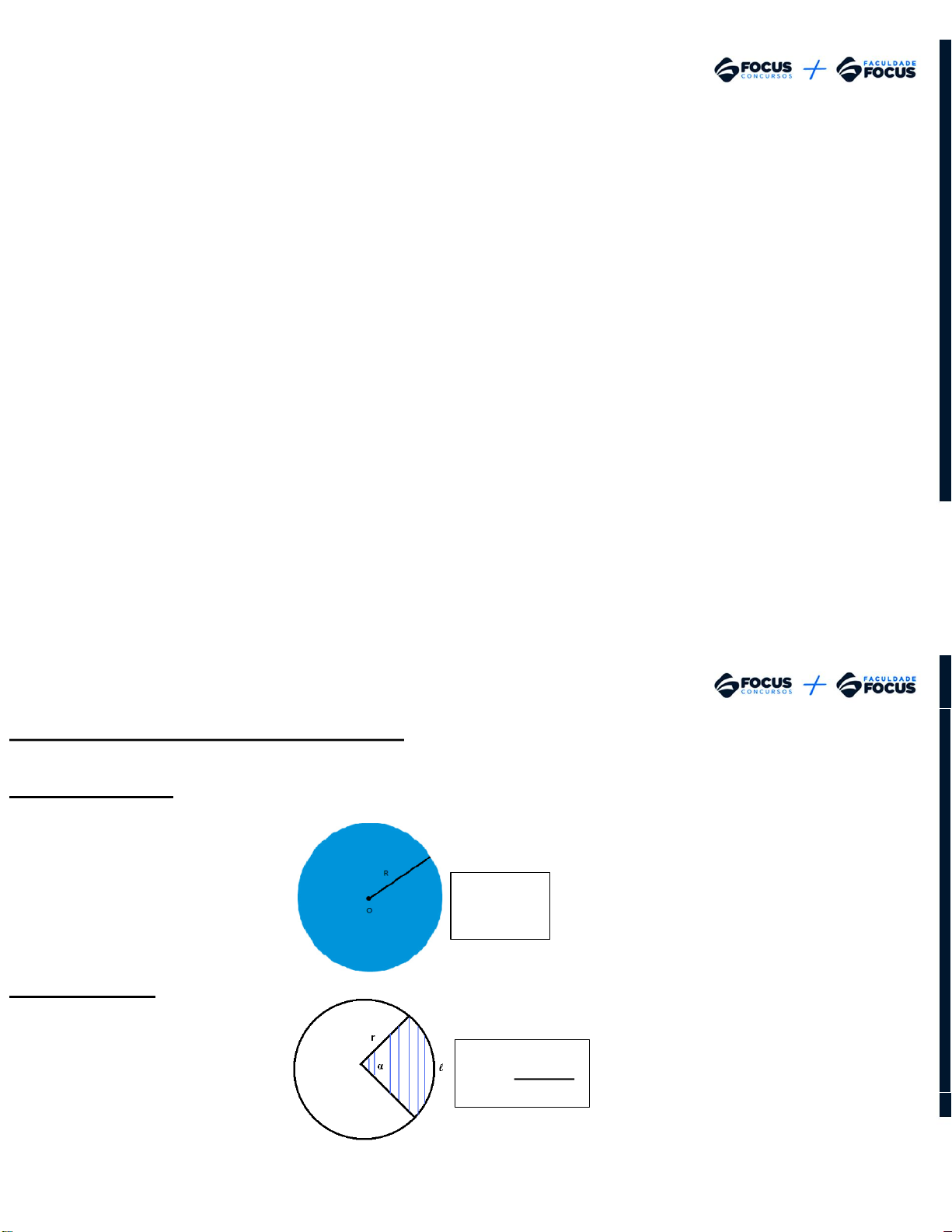TEMA: GEOMETRIA PLANA (forma, perímetro, área e teorema de Pitágoras) ÁREAS DE REGIÕES CIRCULARES Área do Círculo Seja um círculo de raio R sua área será Setor Circular S = πR² 𝑺 = 𝝅𝑹𝟐𝜶 𝟑𝟔𝟎° Uma pista de corrida tem formato circular, com raio equivalente a 1.000 metros. Usando π = 3,14, assinalar a alternativa que apresenta o comprimento total da pista de corrida: A) 3.140 metros. B) 6.280 metros. C) 6.300 metros. D) 7.000 metros. Para delimitar um lote circular recentemente adquirido, o proprietário planeja instalar uma cerca com arame liso. Sabe-se que o lote possui diâmetro de 24 metros e o arame é vendido em rolos com 36 metros cada. Considerando que π = 3,14 e que o proprietário deseja uma cerca com 4 faixas de arame liso, quantas unidades de rolo, no mínimo, ele deverá comprar? A) 7 B) 8 C) 9 D) 10 Quanto mede a circunferência em cm e a área em cm2, nessa ordem, de um círculo cujo diâmetro é 10 cm? (utilize π = 3,14). A) 62,40 e 314. B) 31,40 e 78,5. C) 15,70 e 34,25. D) 7,85 e 17,12. Nas grandes concentrações de pessoas a estimativa dos organizadores nunca bate com as estimativas da Polícia Militar e que na verdade nunca dizem o número exato de participantes. Numa recente manifestação política que lotou uma praça semicircular de 130 m de raio. A Polícia Militar admitiu uma ocupação média de quatro pessoas por m2, qual a melhor estimativa do número de pessoas presentes? A) dez mil. B) cem mil. C) meio milhão. D) um milhão. E) dois milhões. Um irrigador distribui água numa região circular, de raio 13,5 m. Devido a um defeito, esse irrigador precisou ser trocado por outro, que passou a irrigar uma região circular de raio 18 m. Assinale a alternativa que apresenta a área da parte cinza, indicada na figura abaixo, que corresponde à região que passou a ser coberta pelo segundo irrigador, além daquela coberta pelo primeiro. Use: π = 22 7 . A) 346,50 m2. B) 396,00 m2. C) 409,50 m2. D) 445,50 m2. E) 495,00 m2.
