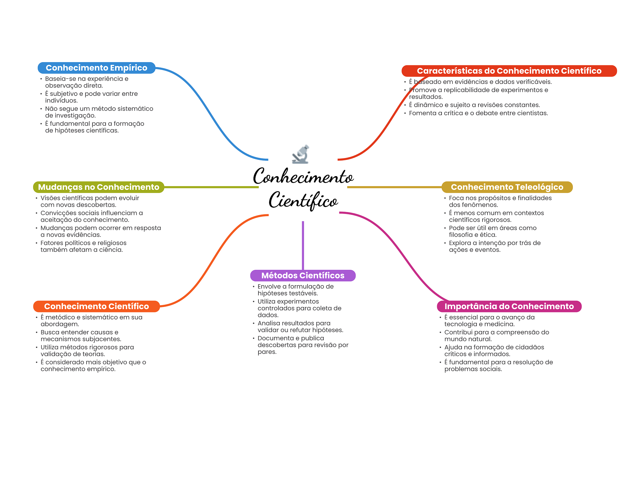 Conhecimento Empírico Características do Conhecimento Científico Baseia-se na experiência e É baseado em evidências e dados verificáveis. observação direta. É subjetivo e pode variar entre romove a replicabilidade de experimentos e resultados. indivíduos. É dinâmico e sujeito a revisões constantes. Não segue um método sistemático de investigação. Fomenta a crítica e debate entre cientistas. É fundamental para a formação de hipóteses científicas. Conhecimento Mudanças no Conhecimento Conhecimento Teleológico Visões científicas podem evoluir Científico Foca nos propósitos e finalidades com novas descobertas. dos fenômenos. sociais influenciam a É menos comum em contextos aceitação do conhecimento. científicos rigorosos. Mudanças podem ocorrer em resposta Pode ser útil em áreas como a novas evidências. filosofia e ética. Fatores políticos e religiosos Explora a intenção por trás de também afetam a ciência. ações e eventos. Métodos Científicos Envolve a formulação de hipóteses testáveis. Utiliza experimentos Conhecimento Científico controlados para coleta de Importância do Conhecimento É metódico e sistemático em sua dados. É essencial para avanço da abordagem. Analisa resultados para tecnologia e medicina. Busca entender causas e validar ou refutar hipóteses. Contribui para a compreensão do mecanismos subjacentes. Documenta e publica mundo natural. Utiliza métodos rigorosos para descobertas para revisão por Ajuda na formação de cidadãos validação de teorias. pares. críticos e informados. É considerado mais objetivo que É fundamental para a resolução de conhecimento empírico. problemas sociais.