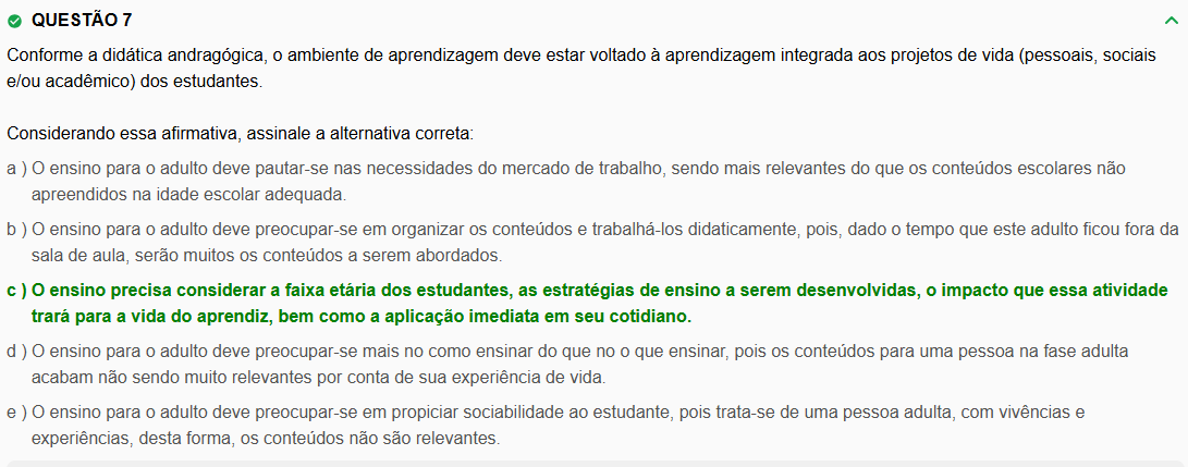 QUESTÃO 7 Conforme a didática andragógica, 0 ambiente de aprendizagem deve estar voltado à aprendizagem integrada aos projetos de vida (pessoais, sociais e/ou acadêmico) dos estudantes. Considerando essa afirmativa, assinale a alternativa correta: a ) ensino para adulto deve pautar-se nas necessidades do mercado de trabalho, sendo mais relevantes do que conteúdos escolares não apreendidos na idade escolar adequada. b) O ensino para O adulto deve preocupar-se em organizar conteúdos e trabalhá-los didaticamente, pois, dado tempo que este adulto ficou fora da sala de aula, serão muitos conteúdos a serem abordados. ) ensino precisa considerar a faixa etária dos estudantes, as estratégias de ensino a serem desenvolvidas, O impacto que essa atividade trará para a vida do aprendiz, bem como a aplicação imediata em seu cotidiano. d) ensino para adulto deve preocupar-se mais no como ensinar do que no 0 que ensinar, pois conteúdos para uma pessoa na fase adulta acabam não sendo muito relevantes por conta de sua experiência de vida. e ) ensino para 0 adulto deve preocupar-se em propiciar sociabilidade ao estudante, pois trata-se de uma pessoa adulta, com vivências e experiências, desta forma, OS conteúdos não são relevantes.