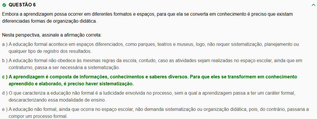 QUESTÃO 6 Embora a aprendizagem possa ocorrer em diferentes formatos e espaços, para que ela se converta em conhecimento é preciso que existam diferenciadas formas de organização didática. Nesta perspectiva, assinale a afirmação correta: a ) A educação formal acontece em espaços diferenciados, como parques, teatros e museus, logo, não requer sistematização, planejamento ou qualquer tipo de registro dos resultados. b) A educação formal não obedece às mesmas regras da escola, contudo, caso as atividades sejam realizadas no espaço escolar, ainda que em contraturno, passa a ser necessária a sistematização. ) A aprendizagem é composta de informações, conhecimentos e saberes diversos. Para que eles se transformem em conhecimento apreendido e elaborado, é preciso haver sistematização. d) que caracteriza a educação não formal é a ludicidade envolvida no processo, sem a qual a aprendizagem passa a ter um caráter formal, essa modalidade de ensino. e ) A educação não formal, ainda que ocorra no espaço escolar, não demanda sistematização ou organização didática, pois, do contrário, passaria a compor um processo formal.