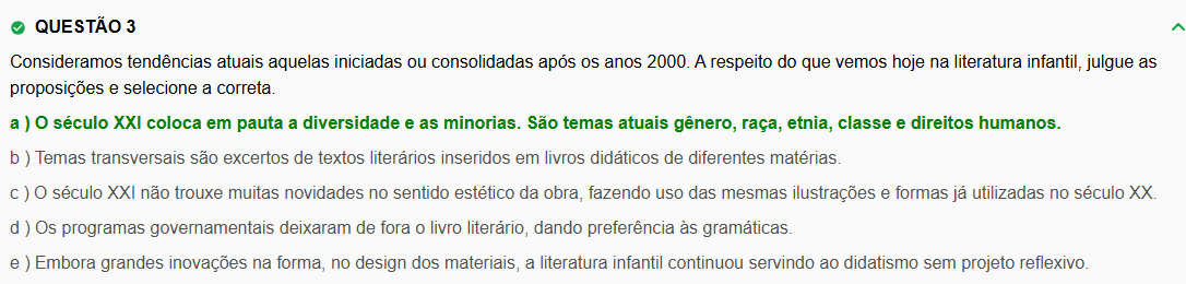 QUESTÃO 3 Consideramos tendências atuais aquelas iniciadas ou consolidadas após anos 2000. A respeito do que vemos hoje na literatura infantil, julgue as proposições e selecione a correta. a ) século XXI coloca em pauta a diversidade e as minorias. São temas atuais gênero, raça, etnia, classe e direitos humanos. b) Temas transversais são excertos de textos literários inseridos em livros didáticos de diferentes matérias. c) século XXI não trouxe muitas novidades no sentido estético da obra, fazendo uso das mesmas ilustrações e formas já utilizadas no século XX. d) Os programas governamentais deixaram de fora livro literário, dando preferência gramáticas. e ) Embora grandes inovações na forma, no design dos materiais, a literatura infantil continuou servindo ao didatismo sem projeto reflexivo.