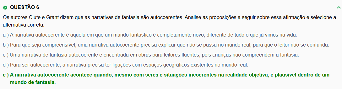 QUESTÃO 6 Os autores Clute e Grant dizem que as narrativas de fantasia são autocoerentes. Analise as proposições a seguir sobre essa afirmação e selecione a alternativa correta. a ) A narrativa autocoerente é aquela em que um mundo fantástico é completamente novo, diferente de tudo que já vimos na vida. b) Para que seja compreensível, uma narrativa autocoerente precisa explicar que não se passa no mundo real, para que leitor não se confunda. c) Uma narrativa de fantasia autocoerente é encontrada em obras para leitores fluentes, pois crianças não compreendem a fantasia. d) Para ser autocoerente, a narrativa precisa ter ligações com espaços geográficos existentes no mundo real. e ) A narrativa autocoerente acontece quando, mesmo com seres e situações incoerentes na realidade objetiva, é plausível dentro de um mundo de fantasia.