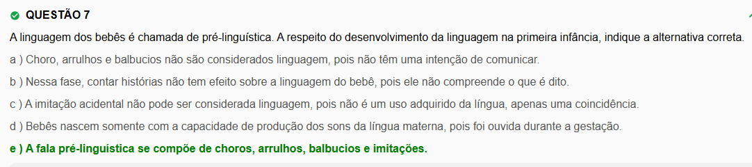 QUESTÃO 7 A linguagem dos é chamada de pré-linguística. A respeito do desenvolvimento da linguagem na primeira infância, indique a alternativa correta. a) Choro, arrulhos e balbucios não são considerados linguagem, pois não têm uma intenção de comunicar. b) Nessa fase, contar histórias não tem efeito sobre a linguagem do bebê, pois ele não compreende que é dito. c) A imitação acidental não pode ser considerada linguagem, pois não é um uso adquirido da língua, apenas uma coincidência. d) Bebês nascem somente com a capacidade de produção dos sons da língua materna, pois foi ouvida durante a gestação. e ) A fala se de choros, arrulhos, balbucios e imitações.