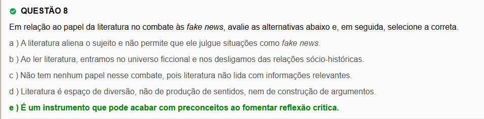 QUESTÃO 8 Em relação ao papel da literatura no combate às fake news, avalie as alternativas abaixo e, em seguida, selecione a correta. a ) A literatura aliena O sujeito e não permite que ele julgue situações como fake news. b) Ao ler literatura, entramos no universo ficcional e nos desligamos das relações sócio-históricas. c) Não tem nenhum papel nesse combate, pois literatura não lida com informações relevantes. d) Literatura é espaço de diversão, não de produção de sentidos, nem de construção de argumentos. e ) É um instrumento que pode acabar com preconceitos ao fomentar reflexão crítica.