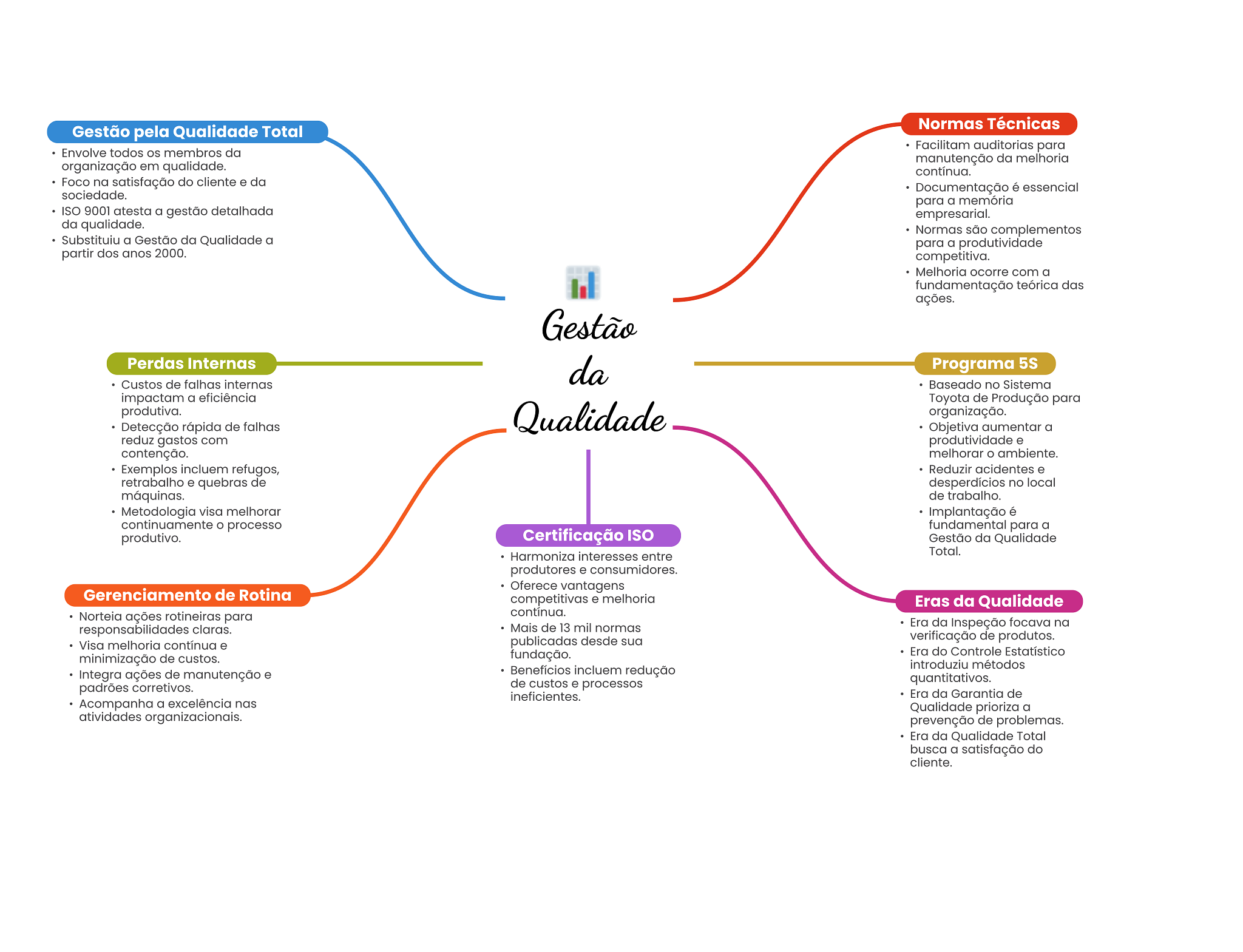Normas Técnicas Gestão pela Qualidade Total Facilitam auditorias para Envolve todos membros da manutenção da melhoria organização em qualidade. contínua. Foco na satisfação do cliente e da Documentação é essencial sociedade. para a memória ISO 9001 atesta a gestão detalhada empresarial. da qualidade. Normas são complementos Substituiu a Gestão da Qualidade a para a produtividade partir dos anos 2000. competitiva. Melhoria ocorre com a fundamentação teórica das ações. Gestão Perdas Internas da Programa 5S Custos de falhas internas Baseado no Sistema impactam a eficiência Toyota de Produção para produtiva. Detecção rápida de falhas Qualidade organização. Objetiva aumentar a reduz gastos com produtividade e contenção. melhorar O ambiente. Exemplos incluem refugos, Reduzir acidentes e retrabalho e quebras de desperdícios no local máquinas. de trabalho. Metodologia visa melhorar Implantação é continuamente processo fundamental para a produtivo. Certificação ISO Gestão da Qualidade Harmoniza interesses entre Total. produtores e consumidores. Oferece vantagens Gerenciamento de Rotina competitivas e melhoria Eras da Qualidade Norteia ações rotineiras para contínua. responsabilidades claras. Mais de 13 mil normas Era da Inspeção focava na publicadas desde sua verificação de produtos. Visa melhoria contínua e fundação. Era do Controle Estatístico minimização de custos. introduziu métodos Integra ações de manutenção e Benefícios incluem redução padrões corretivos. de custos e processos quantitativos. ineficientes. Era da Garantia de Acompanha a excelência nas Qualidade prioriza a atividades organizacionais. prevenção de problemas. Era da Qualidade Total busca a satisfação do cliente.