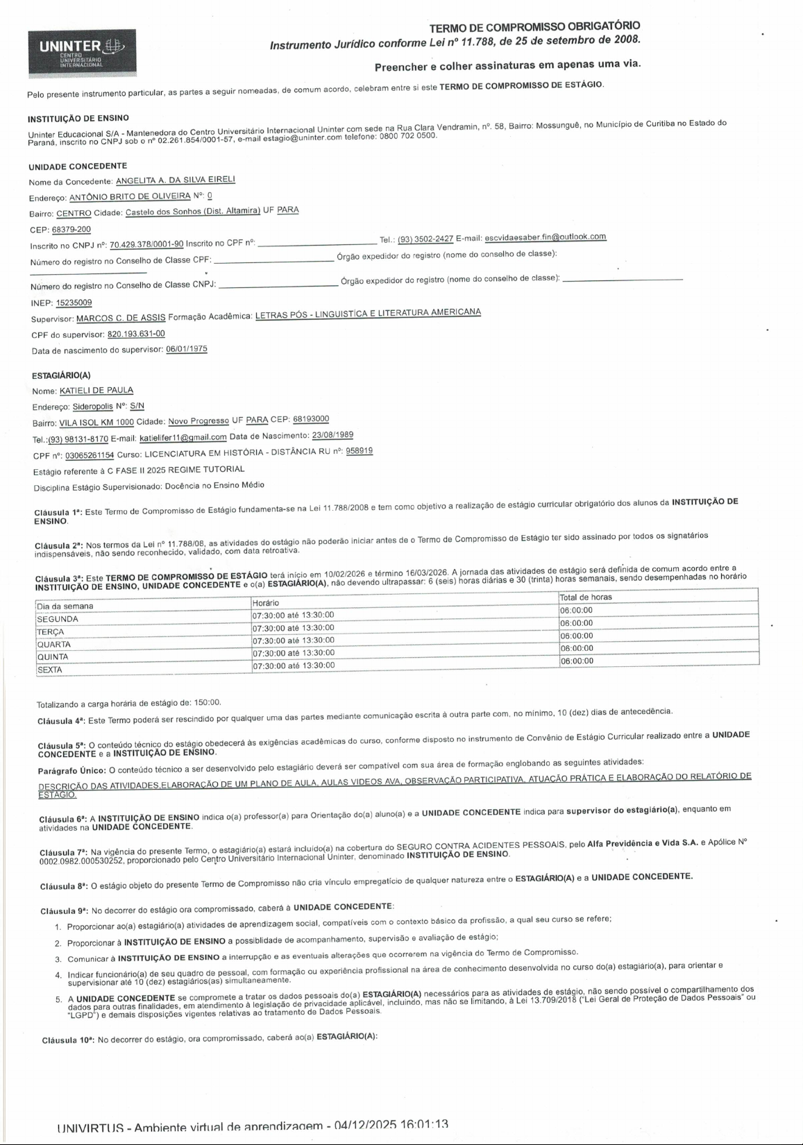 TERMO DE COMPROMISSO OBRIGATÓRIO UNINTER Instrumento Jurídico conforme Lei n° 11.788, de 25 de setembro de 2008. CENTRO UNIVERSITARIO INTERNACIONAL Preencher e colher assinaturas em apenas uma via. Pelo presente instrumento particular, as partes a seguir nomeadas, de comum acordo, celebram entre si este TERMO DE COMPROMISSO DE ESTÁGIO. INSTITUIÇÃO DE ENSINO Uninter Educacional S/A Mantenedora do Centro Universitário Internacional Uninter com sede na Rua Clara 0500. Vendramin, 58, Bairro: Mossunguê, no Município de Curitiba no Estado do Paraná, inscrito no CNPJ sob n° e-mail estagio@uninter.com telefone: 0800 702 UNIDADE CONCEDENTE Nome da Concedente: ANGELITA A. DA SILVA EIRELI Endereço: ANTÔNIO BRITO DE OLIVEIRA 0 Bairro: CENTRO Cidade: Castelo dos Sonhos (Dist. Altamira) UF PARA CEP: 68379-200 Inscrito no CNPJ n°: 70.429.378/0001-90 Inscrito no CPF n°: Tel.: (93) 3502-2427 E-mail: escvidaesaber.fin@outlook.com Número do registro no Conselho de Classe CPF: Órgão expedidor do registro (nome do conselho de classe): Número do registro no Conselho de Classe CNPJ: Órgão expedidor do registro (nome do conselho de classe): INEP: 15235009 Supervisor: MARCOS C. DE ASSIS Formação Acadêmica: LETRAS PÓS LINGUISTÍCA E LITERATURA AMERICANA CPF do supervisor: 820.193.631-00 Data de nascimento do supervisor: 06/01/1975 ESTAGIÁRIO(A) Nome: KATIELI DE PAULA Endereço: Sideropolis S/N Bairro: VILA ISOL 1000 Cidade: Novo Progresso UF PARA CEP: 68193000 98131-8170 E-mail: Data de Nascimento: 23/08/1989 CPF 03065261154 Curso: LICENCIATURA EM HISTÓRIA DISTÂNCIA RU 958919 Estágio referente à C FASE 2025 REGIME TUTORIAL Disciplina Estágio Supervisionado: Docência no Ensino Médio Cláusula Este Termo de Compromisso de Estágio fundamenta-se na Lei 11.788/2008 e tem como objetivo a realização de estágio curricular obrigatório dos alunos da INSTITUIÇÃO DE ENSINO. Cláusula Nos termos da Lei n° 11.788/08, as atividades do estágio não poderão iniciar antes de Termo de Compromisso de Estágio ter sido assinado por todos signatários indispensáveis, não sendo reconhecido, validado, com data retroativa. Cláusula INSTITUIÇÃO DE ENSINO, UNIDADE CONCEDENTE e o(a) ESTAGIÁRIO(A), não devendo ultrapassar: 6 (seis) horas diárias e 30 (trinta) horas semanais, horário Este TERMO DE COMPROMISSO DE ESTÁGIO terá início em 10/02/2026 e término 16/03/2026. A jornada das atividades de estágio será definida sendo de desempenhadas comum acordo no entre a Total de horas Horário Dia da semana 06:00:00 SEGUNDA 07:30:00 até 13:30:00 06:00:00 07:30:00 até 13:30:00 TERÇA 06:00:00 QUARTA 07:30:00 até 13:30:00 06:00:00 QUINTA 07:30:00 até 13:30:00 06:00:00 07:30:00 até 13:30:00 SEXTA Totalizando a carga horária de estágio de: 150:00. Cláusula Este Termo poderá ser rescindido por qualquer uma das partes mediante comunicação escrita à outra parte com, no mínimo, 10 (dez) dias de antecedência. Cláusula conteúdo técnico do estágio obedecerá às exigências acadêmicas do curso, conforme disposto no instrumento de Convênio de Estágio Curricular realizado entre a UNIDADE CONCEDENTE e a INSTITUIÇÃO DE ENSINO. Parágrafo Único: conteúdo técnico a ser desenvolvido pelo estagiário deverá ser com sua área de formação englobando as seguintes atividades: DESCRIÇÃO DAS ATIVIDADES ELABORAÇÃO DE UM PLANO DE AULA, AULAS VIDEOS AVA, OBSERVAÇÃO PARTICIPATIVA, ATUAÇÃO PRÁTICA E ELABORAÇÃO DO RELATÓRIO DE Cláusula A INSTITUIÇÃO DE ENSINO indica o(a) professor(a) para Orientação do(a) aluno(a) e a UNIDADE CONCEDENTE indica para supervisor do estagiário(a), enquanto em atividades na UNIDADE Cláusula Na vigência do presente Termo, estagiário(a) estará incluído(a) na cobertura do SEGURO CONTRA ACIDENTES PESSOAIS, pelo Alfa Previdência e Vida S.A. e Apólice N° 0002.0982.000530252, proporcionado pelo Centro Universitário Internacional Uninter, denominado INSTITUIÇÃO DE ENSINO. Cláusula estágio objeto do presente Termo de Compromisso não cria vínculo empregatício de qualquer natureza entre ESTAGIÁRIO(A) e a UNIDADE CONCEDENTE. Cláusula No decorrer do estágio ora compromissado, caberá à UNIDADE CONCEDENTE: 1. Proporcionar ao(a) estagiário(a) atividades de aprendizagem social, compatíveis com contexto básico da profissão, a qual seu curso se refere; 2. Proporcionar à INSTITUIÇÃO DE ENSINO a possiblidade de acompanhamento, supervisão e avaliação de estágio; 3. Comunicar à INSTITUIÇÃO DE ENSINO a interrupção e as eventuais alterações que ocorrerem na vigência do Termo de Compromisso. 4. Indicar funcionário(a) de seu quadro de pessoal, com formação ou experiência profissional na área de conhecimento desenvolvida no curso do(a) estagiário(a), para orientar e supervisionar até 10 (dez) estagiários(as) simultaneamente. 5. A UNIDADE CONCEDENTE se compromete a tratar dados pessoais do(a) ESTAGIÁRIO(A) necessários para as atividades de estágio, não Geral sendo de possível Proteção de compartilhamento Dados Pessoais" dos ou dados para outras finalidades, em atendimento à legislação de privacidade aplicável, incluindo, mas não se limitando, à Lei 13.709/2018 ("Lei "LGPD") e demais disposições vigentes relativas ao tratamento de Dados Pessoais. Cláusula No decorrer do estágio, ora compromissado, caberá ao(a) ESTAGIÁRIO(A): UNIVIRTUS Ambiente virtual de 04/12/2025 16:01:131. Cumprir com todo empenho e interesse, toda programação estabelecida para seu estágio; 2. Observar e obedecer às normas internas da UNIDADE 3. Elaborar e entregar para análise da INSTITUIÇÃO DE ENSINO, relatório(s) sobre seu estágio, na forma, prazo e padrões estabelecidos; 4. Informar à INSTITUIÇÃO DE ENSINO qualquer fato relevante sobre seu estágio; 5. O(A) ESTAGIÁRIO(A)está ciente que a INSTITUIÇÃO podendo realizar DE ENSINO compartilhamento realiza tratamento de dados das com informações agentes relativas de integraç