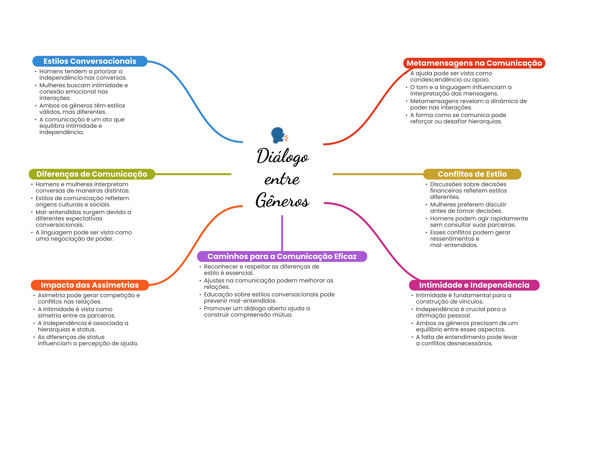 Estilos Conversacionais Metamensagens na Comunicação Homens tendem a priorizar a A ajuda pode ser vista como independência nas conversas. condescendência ou apoio. Mulheres buscam intimidade e tom e a linguagem influenciam a conexão emocional nas interpretação das mensagens. interações. Metamensagens revelam a dinâmica de Ambos gêneros têm estilos poder nas interações. válidos, mas diferentes. A forma como se comunica pode A comunicação é um ato que reforçar ou desafiar hierarquias. equilibra intimidade e independência. Diálogo Diferenças de Comunicação entre Conflitos de Estilo Homens e mulheres interpretam Discussões sobre decisões conversas de maneiras distintas. financeiras refletem estilos Estilos de comunicação refletem Gêneros diferentes. origens culturais e sociais. Mulheres preferem discutir Mal-entendidos surgem devido a antes de tomar decisões. diferentes expectativas Homens podem agir rapidamente conversacionais. sem consultar suas parceiras. A linguagem pode ser vista como Esses conflitos podem gerar uma negociação de poder. ressentimentos e mal-entendidos. Caminhos para a Comunicação Eficaz Reconhecer e respeitar as diferenças de estilo é essencial. Ajustes na comunicação podem melhorar as Impacto das Assimetrias relações. Intimidade e Independência Asimetria pode gerar competição e Educação sobre estilos conversacionais pode Intimidade é fundamental para a conflitos nas relações. prevenir construção de vínculos. A intimidade é vista como Promover um diálogo aberto ajuda a Independência é crucial para a simetria entre parceiros. construir compreensão mútua. afirmação pessoal. A independência é associada a Ambos gêneros precisam de um hierarquias e status. equilíbrio entre esses aspectos. As diferenças de status A falta de entendimento pode levar influenciam a percepção de ajuda. a conflitos desnecessários.