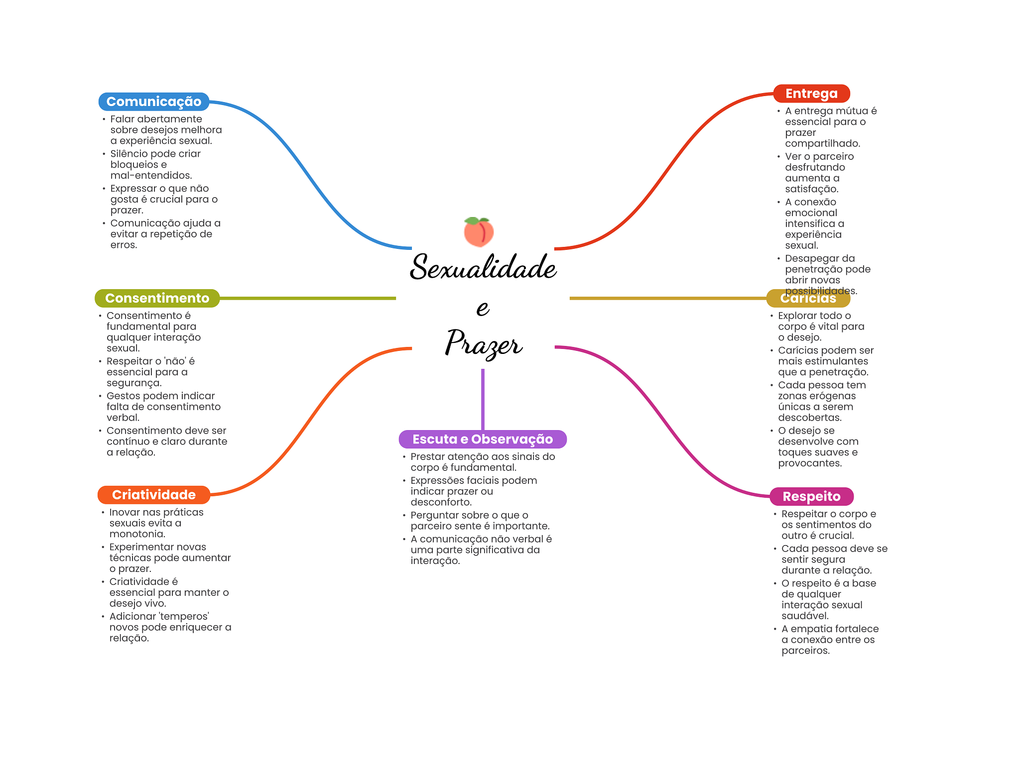 Entrega Comunicação A entrega mútua é Falar abertamente essencial para sobre desejos melhora prazer a experiência sexual. compartilhado. Silêncio pode criar Ver parceiro bloqueios e desfrutando mal-entendidos. aumenta a Expressar que não satisfação. gosta é crucial para A conexão prazer. emocional Comunicação ajuda a intensifica a evitar a repetição de experiência erros. sexual. Sexualidade Desapegar da penetração pode abrir novas possibilidades. Consentimento Caricias e Consentimento é Explorar todo fundamental para corpo é vital para qualquer interação sexual. Prazer desejo. Carícias podem ser Respeitar 'não' é mais estimulantes essencial para a que a penetração. segurança. Cada pessoa tem Gestos podem indicar zonas erógenas falta de consentimento únicas a serem verbal. descobertas. Consentimento deve ser desejo se contínuo e claro durante Escuta e Observação desenvolve com a relação. Prestar atenção aos sinais do toques suaves e corpo é fundamental. provocantes. Expressões faciais podem Criatividade indicar prazer ou desconforto. Respeito Inovar nas práticas Perguntar sobre que Respeitar corpo e sexuais evita a parceiro sente é importante. sentimentos do monotonia. A comunicação não verbal é outro é crucial. Experimentar novas uma parte significativa da Cada pessoa deve se técnicas pode aumentar interação. sentir segura prazer. durante a relação. Criatividade é respeito é a base essencial para manter de qualquer desejo vivo. interação sexual Adicionar 'temperos' saudável. novos pode enriquecer a A empatia fortalece relação. a conexão entre parceiros.