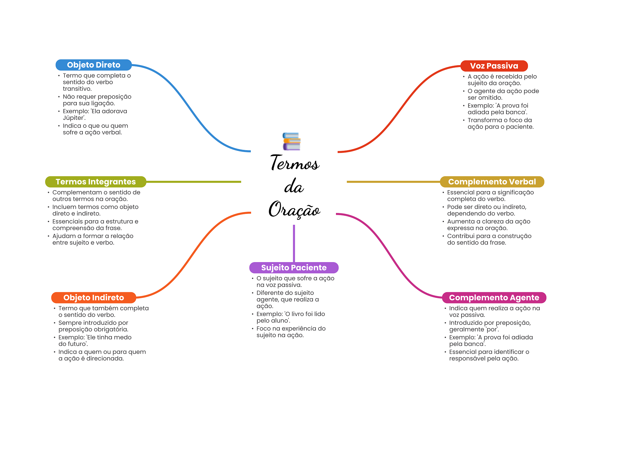 Objeto Direto Voz Passiva Termo que completa A é recebida pelo sentido do verbo sujeito da oração. transitivo. agente da ação pode Não requer preposição ser omitido. para sua ligação. Exemplo: prova foi Exemplo: 'Ela adorava adiada pela banca'. Transforma foco da Indica que ou quem ação para paciente. sofre a ação verbal. Termos Termos Integrantes da Complemento Verbal Complementam sentido de Essencial para a significação outros termos na oração. completa do verbo. Incluem termos como objeto Oração Pode ser direto ou indireto, direto e indireto. dependendo do verbo. Essenciais para a estrutura e Aumenta a clareza da ação compreensão da frase. expressa na oração. Ajudam a formar a relação Contribui para a construção entre sujeito e verbo. do sentido da frase. Sujeito Paciente sujeito que sofre a ação na passiva. Diferente do sujeito Objeto Indireto agente, que realiza a Complemento Agente Termo que também completa ação. Indica quem realiza a ação na sentido do verbo. Exemplo: 'O livro foi lido passiva. Sempre introduzido por pelo aluno'. Introduzido por preposição, preposição obrigatória. Foco na experiência do geralmente 'por'. Exemplo: 'Ele tinha medo sujeito na ação. Exemplo: prova foi adiada do futuro'. pela banca'. Indica a quem ou para quem Essencial para identificar a ação é direcionada. responsável pela ação.