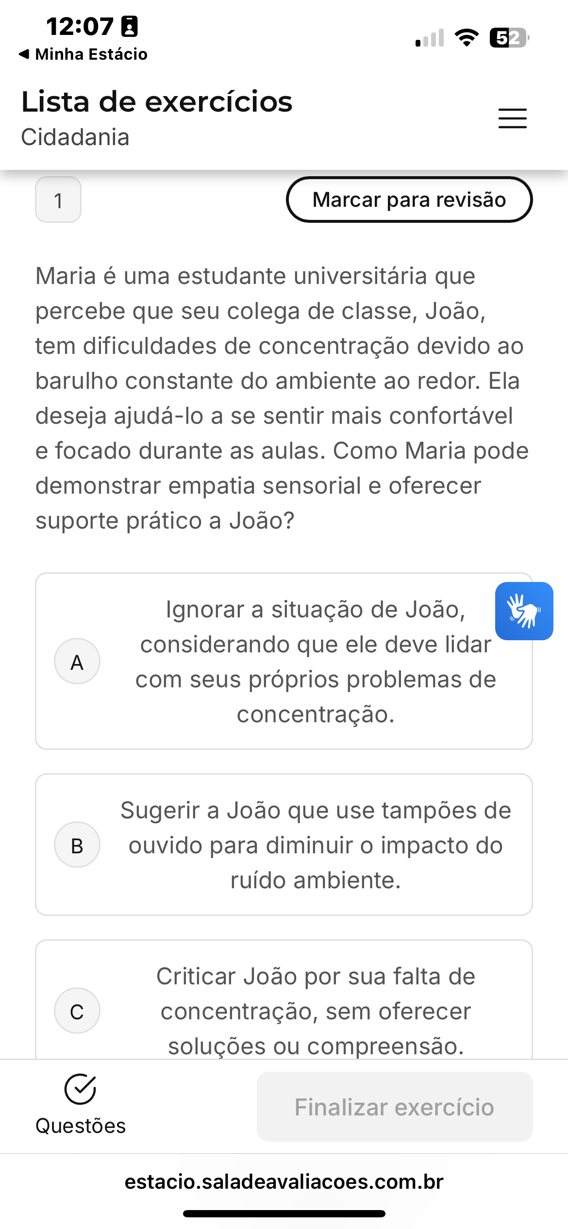 12:07 52 Minha Estácio Lista de exercícios Cidadania 1 Marcar para revisão Maria é uma estudante universitária que percebe que seu colega de classe, João, tem dificuldades de concentração devido ao barulho constante do ambiente ao redor. Ela deseja ajudá-lo a se sentir mais confortável e focado durante as aulas. Como Maria pode demonstrar empatia sensorial e oferecer suporte prático a João? Ignorar a situação de João, considerando que ele deve lidar A com seus próprios problemas de concentração. Sugerir a João que use tampões de ouvido para diminuir impacto do ruído ambiente. Criticar João por sua falta de c concentração, sem oferecer soluções ou compreensão. Finalizar exercício Questões estacio.saladeavaliacoes.com.br