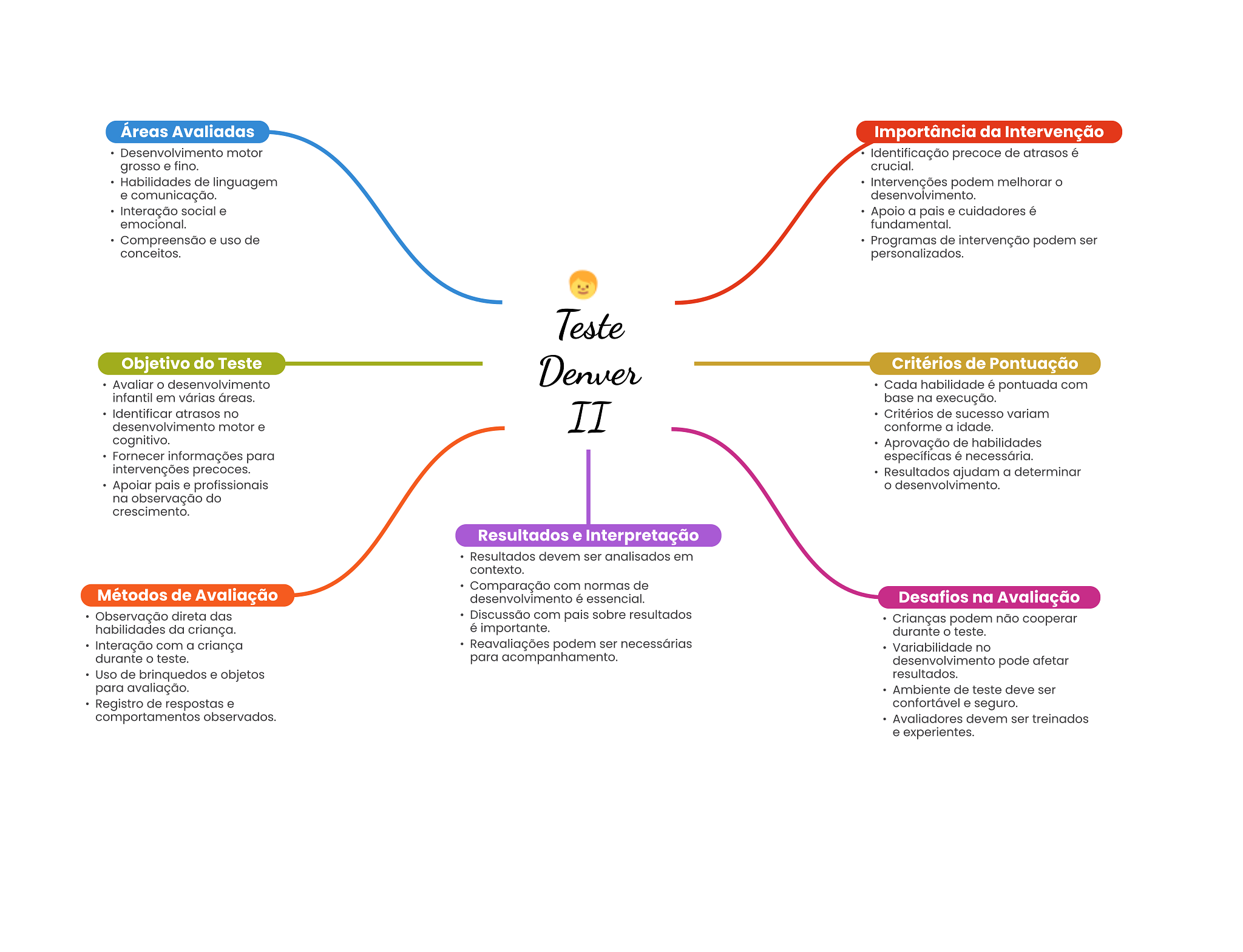 Áreas Avaliadas Importância da Intervenção Desenvolvimento motor Identificação precoce de atrasos é grosso e fino. crucial. Habilidades de linguagem Intervenções podem melhorar e comunicação. desenvolvimento. Interação social e Apoio a pais e cuidadores é emocional. fundamental. Compreensão e uso de Programas de intervenção podem ser conceitos. personalizados. Teste Objetivo do Teste Denver Critérios de Pontuação Avaliar desenvolvimento Cada habilidade é pontuada com infantil em várias áreas. base na execução. Identificar atrasos no desenvolvimento motor e II Critérios de sucesso variam conforme a idade. cognitivo. Aprovação de habilidades Fornecer informações para específicas é necessária. intervenções precoces. Resultados ajudam a determinar Apoiar pais e profissionais O desenvolvimento. na observação do crescimento. Resultados e Interpretação Resultados devem ser analisados em contexto. Comparação com normas de Métodos de Avaliação desenvolvimento é essencial. Desafios na Avaliação Observação direta das Discussão com pais sobre resultados Crianças podem não cooperar habilidades da criança. é importante. durante teste. Interação com a criança Reavaliações podem ser necessárias Variabilidade no durante teste. para acompanhamento. desenvolvimento pode afetar Uso de brinquedos e objetos resultados. para avaliação. Ambiente de teste deve ser Registro de respostas e confortável e seguro. comportamentos observados. Avaliadores devem ser treinados e experientes.