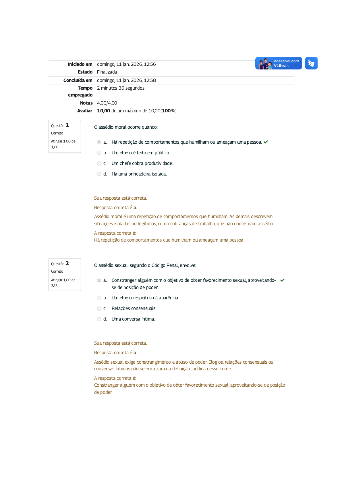 Questão 1 Correto Atingiu 1,00 de 1,00 Questão 2 Correto Atingiu 1,00 de 1,00 Iniciado em domingo, 11 jan. 2026, 12:56 Estado Finalizada Concluída em domingo, 11 jan. 2026, 12:58 Tempo empregado 2 minutos 36 segundos Notas 4,00/4,00 Avaliar 10,00 de um máximo de 10,00(100%) O assédio moral ocorre quando: a. Há repetição de comportamentos que humilham ou ameaçam uma pessoa. b. Um elogio é feito em público. c. Um chefe cobra produtividade. d. Há uma brincadeira isolada. Sua resposta está correta. Resposta correta é a. Assédio moral é uma repetição de comportamentos que humilham. As demais descrevem situações isoladas ou legítimas, como cobranças de trabalho, que não configuram assédio. A resposta correta é: Há repetição de comportamentos que humilham ou ameaçam uma pessoa. O assédio sexual, segundo o Código Penal, envolve: a. Constranger alguém com o objetivo de obter favorecimento sexual, aproveitando- se de posição de poder. b. Um elogio respeitoso à aparência. c. Relações consensuais. d. Uma conversa íntima. Sua resposta está correta. Resposta correta é a. Assédio sexual exige constrangimento e abuso de poder. Elogios, relações consensuais ou conversas íntimas não se encaixam na definição jurídica desse crime. A resposta correta é: Constranger alguém com o objetivo de obter favorecimento sexual, aproveitando-se de posição de poder. Questão 3 Correto Atingiu 1,00 de 1,00 Questão 4 Correto Atingiu 1,00 de 1,00 O que é importunação sexual? a. Um crime leve sem punição. b. Ato de conotação sexual sem consentimento, mesmo sem violência ou grave ameaça. c. Um tipo de assédio verbal. d. Uma conversa provocadora. Sua resposta está correta. Resposta correta é b. Importunação sexual é qualquer ato sexual sem consentimento, mesmo sem violência. As demais alternativas reduzem o crime a algo leve, verbal ou meramente provocador, o que não corresponde à lei. A resposta correta é: Ato de conotação sexual sem consentimento, mesmo sem violência ou grave ameaça. Um exemplo de microagressão no trabalho é: a. Interromper uma colega várias vezes durante uma reunião. b. Ouvir atentamente o que ela diz. c. Ajudar quando solicitado. d. Dividir as tarefas de forma justa. Sua resposta está correta. Resposta correta é a. Interromper repetidamente uma colega é microagressão porque deslegitima sua participação. As outras atitudes são respeitosas ou colaborativas, não ofensivas. A resposta correta é: Interromper uma colega várias vezes durante uma reunião. ◄ Conteúdo do módulo 4 Seguir para... Conteúdo do módulo 5 ► https://mooc41.escolavirtual.gov.br/mod/url/view.php?id=322324&forceview=1 https://mooc41.escolavirtual.gov.br/mod/url/view.php?id=322326&forceview=1