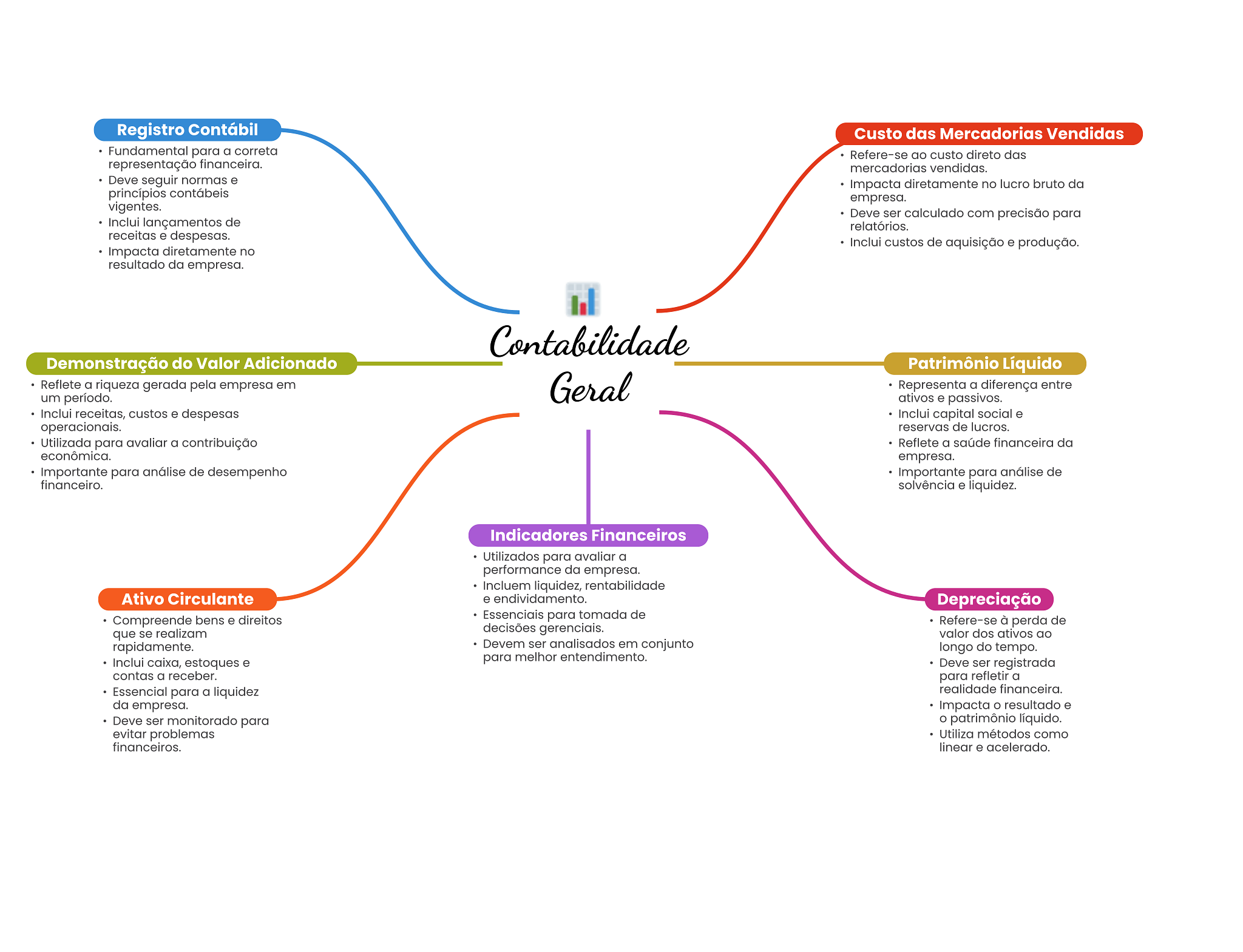 Registro Contábil Custo das Mercadorias Vendidas Fundamental para a correta Refere-se ao custo direto das representação financeira. mercadorias vendidas. Deve seguir normas e Impacta diretamente no lucro bruto da princípios contábeis empresa. vigentes. Deve ser calculado com precisão para Inclui lançamentos de relatórios. receitas e despesas. Inclui custos de aquisição e produção. Impacta diretamente no resultado da empresa. Contabilidade Demonstração do Valor Adicionado Patrimônio Líquido Reflete a riqueza gerada pela empresa em Geral Representa a diferença entre um período. ativos e passivos. Inclui receitas, custos e despesas Inclui capital social e operacionais. reservas de lucros. Utilizada para avaliar a contribuição Reflete a saúde financeira da econômica. empresa. Importante para análise de desempenho Importante para análise de financeiro. solvência e liquidez. Indicadores Financeiros Utilizados para avaliar a performance da empresa. Incluem liquidez, rentabilidade Ativo Circulante e endividamento. Depreciação Compreende bens e direitos Essenciais para tomada de Refere-se à perda de que se realizam decisões gerenciais. valor dos ativos ao rapidamente. Devem ser analisados em conjunto longo do tempo. Inclui caixa, estoques e para melhor entendimento. Deve ser registrada contas a receber. para refletir a Essencial para a liquidez realidade financeira. da empresa. Impacta resultado e Deve ser monitorado para patrimônio líquido. evitar problemas Utiliza métodos como financeiros. linear e acelerado.
