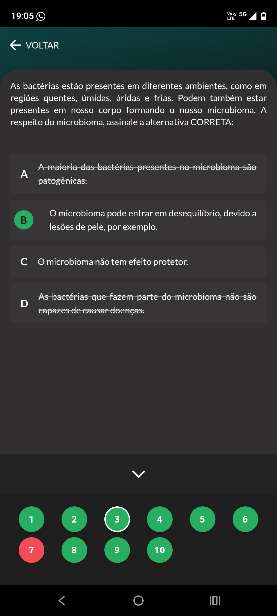 19:05 5G LTE VOLTAR As bactérias estão presentes em diferentes ambientes, como em regiões quentes, úmidas, áridas e frias. Podem também estar presentes em nosso corpo formando nosso microbioma. A respeito do microbioma, assinale a alternativa CORRETA: A maioria das bactérias presentes no microbioma são patogênicas. microbioma pode entrar em desequilíbrio, devido a lesões de pele, por exemplo. c microbioma não tem efeito protetor. As bactérias que fazem parte do microbioma não são D capazes de causar doenças. 1 2 3 4 5 6 7 8 9 10
