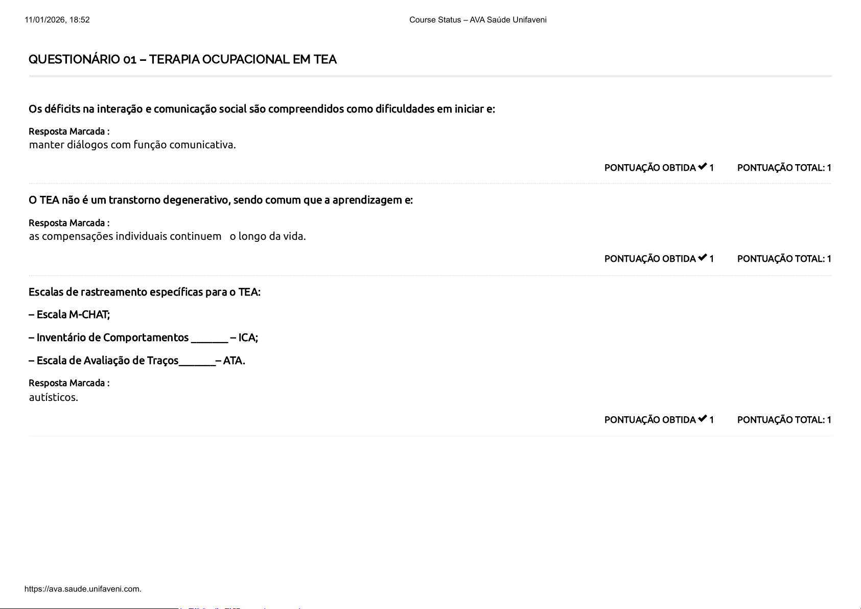 QUESTIONÁRIO 01 – TERAPIA OCUPACIONAL EM TEA PONTUAÇÃO TOTAL: 1PONTUAÇÃO OBTIDA 1 Os déficits na interação e comunicação social são compreendidos como dificuldades em iniciar e: Resposta Marcada : manter diálogos com função comunicativa. PONTUAÇÃO TOTAL: 1PONTUAÇÃO OBTIDA 1 O TEA não é um transtorno degenerativo, sendo comum que a aprendizagem e: Resposta Marcada : as compensações individuais continuem ao longo da vida. PONTUAÇÃO TOTAL: 1PONTUAÇÃO OBTIDA 1 Escalas de rastreamento específicas para o TEA: – Escala M-CHAT; – Inventário de Comportamentos _______ – ICA; – Escala de Avaliação de Traços_______– ATA. Resposta Marcada : autísticos. 11/01/2026, 18:52 Course Status – AVA Saúde Unifaveni https://ava.saude.unifaveni.com.br/course-status/ 1/2 5 / 5 PONTUAÇÃO TOTAL: 1PONTUAÇÃO OBTIDA 1 Diante do contexto apresentado, recomenda-se a adoção de instrumentos _________ por profissionais da atenção básica de saúde, professores da rede regular de ensino, pais e cuidadores, de forma a auxiliar na triagem e garantir o diagnóstico e a intervenção precoces da pessoa com TEA. Resposta Marcada : de rastreamento. PONTUAÇÃO TOTAL: 1PONTUAÇÃO OBTIDA 1 Ainda não há pesquisas sobre a incidência do TEA no Brasil, mas dados estatísticos do Centers for Disease Control and Prevention – CDC (2017) apontam a incidência, nos Estados Unidos, de um (01) caso para cada __ nascimentos. Resposta Marcada : 68. Total de Pontos 11/01/2026, 18:52 Course Status – AVA Saúde Unifaveni https://ava.saude.unifaveni.com.br/course-status/ 2/2