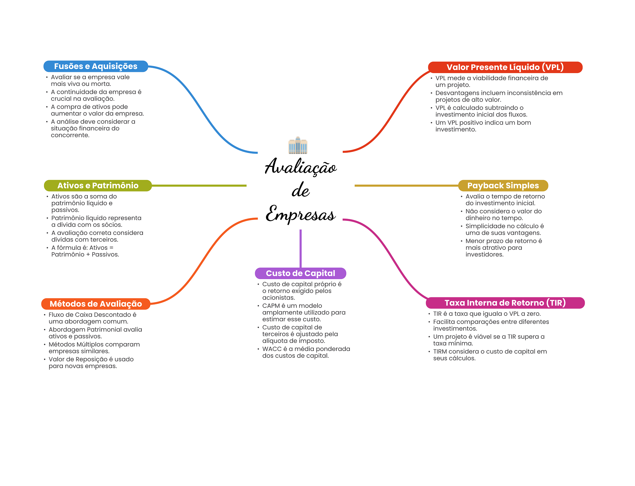 Fusões e Aquisições Valor Presente Líquido (VPL) Avaliar se a empresa vale VPL mede a viabilidade financeira de mais viva ou morta. um projeto. A continuidade da empresa é Desvantagens incluem inconsistência em crucial na avaliação. projetos de alto valor. A compra de ativos pode VPL é calculado subtraindo aumentar valor da empresa. investimento inicial dos fluxos. A análise deve considerar a Um VPL positivo indica um bom situação financeira do investimento. concorrente. Avaliação Ativos e Patrimônio de Payback Simples Ativos são a soma do Avalia O tempo de retorno patrimônio líquido e do investimento inicial. passivos. Empresas Não considera valor do Patrimônio líquido representa dinheiro no tempo. a dívida com OS sócios. Simplicidade no cálculo é A avaliação correta considera uma de suas vantagens. dívidas com terceiros. Menor prazo de retorno é A fórmula é: Ativos = mais atrativo para Patrimônio + Passivos. investidores. Custo de Capital Custo de capital próprio é O retorno exigido pelos acionistas. Métodos de Avaliação CAPM é um modelo Taxa Interna de Retorno (TIR) Fluxo de Caixa Descontado é amplamente utilizado para TIR é a taxa que iguala O VPL a zero. uma abordagem comum. estimar esse custo. Facilita comparações entre diferentes Abordagem Patrimonial avalia Custo de capital de investimentos. ativos e passivos. terceiros é ajustado pela Um projeto é viável se a TIR supera a Métodos Múltiplos comparam alíquota de imposto. taxa mínima. empresas similares. WACC é a média ponderada TIRM considera custo de capital em dos custos de capital. Valor de Reposição é usado seus cálculos. para novas empresas.