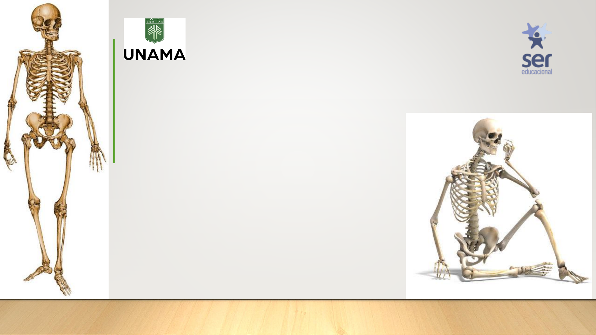 Sistema Esquelético PROFª ME. MILENA MAGALHÃES Conceito • Ossos são órgãos vivos originados das células osteoblásticas. • Apresentam cor esbranquiçada; são rígidos e unem-se entre si, por intermédio das junturas ou articulações. • Sua principal característica é a mineralização de sua matriz óssea, representada pela deposição de cálcio sobre a matriz orgânica. • O corpo contém 206 ossos. Função • Suporte – formam a estrutura que suporta o peso do corpo e suas partes, como músculo, vasos, nervos, e órgãos viscerais. • Movimento – os músculos se fixam-se aos ossos pelos tendões e utilizam- nos como alavancas para poder movimentar as diferentes partes do corpo. • Proteção – de órgãos vitais, como cérebro (ossos do crânio), a medula espinal (vértebras), o coração e os pulmões (caixa torácica) Função • Depósito mineral – reservatório de minerais, como os íons cálcio e fosfato • Formação das células sanguíneas ( na medula óssea vermelha) e estoque de energia (na medula óssea amarela, que armazena gordura) – a medula vermelha e a medula amarela ficam no interior dos ossos longos. • Metabolismo – os osteoblastos ( células de produção óssea) secretam osteocalcina, um hormônio que influencia a regulação de glicerina. Divisão do corpo humano • Esqueleto axial – Cabeça – Pescoço – Tronco • Esqueleto apendicular – Membros Superiores – Membros Inferiores • União do esqueleto axial e apendicular- cintura escapular e pélvica Classificação anatômica dos ossos Ossos longos: têm forma alongada, ou seja, podemos ver que o comprimento é maior do que a largura e a espessura. Ex.: clavícula Úmero Rádio Ulna Fêmur Tíbia Fíbula Metatarsais Falanges Classificação anatômica dos ossos Ossos curtos: têm forma semelhante a um cubo. Ex.: Carpo Tarso Tálus Classificação anatômica dos ossos Ossos planos ou laminar: Têm forma achatado, são finos e ligeiramente curvados e costumam exercer a função protetora. Por exemplo, o ilíaco e os ossos do crânio Ossos planos: Protegem estruturas internas e oferecem superfícies amplas para inserção muscular. Ex.: Ilíaco Escápula Classificação anatômica dos ossos Ossos sesamoides: estão presentes no interior de alguns tendões em há considerável fricção e tensão, como as palmas e plantas. Ex.: Patela Classificação anatômica dos ossos Ossos irregulares: Apresenta uma morfologia complexa que não encontra correspondência em formas geométricas conhecidas. Consiste em osso esponjoso com uma fina superfície exterior de osso compacto Ossos irregulares: desempenham várias funções como, sustentação do peso, dissipação de cargas, proteção da medula espinhal, contribuição para os movimentos e locais para inserção muscular Ex.: Vértebras Classificação anatômica dos ossos OBS.: Alguns ossos do Crânio são chamados pneumáticos, ou seja, apresentam espaços aéreos (seios ou células aéreas) entre as tábuas ósseas. Apresentam a função de reduzir o peso dos ossos e são recobertos pelo mesmo tecido da cavidade nasal, como continuação dela. – Osso frontal (seio frontal) – Maxila (seio maxilar) – Esfenoide (seio esfenoidal) – Etmoide (células aéreas etmoidais) OBS.: Ossos alongados são ossos longos, porém achatados e não apresentam canal central. Exemplo: Costelas. Estrutura do osso Osso compacto: Cama da externa densa, que parece lisa e sólida a olho nu. Osso esponjoso: parte interna trabéculada, ou seja, com aspecto de um favo de mel. Os espaços entre as trabéculas são preenchidos por medula óssea vermelha ou amarela. Estrutura do osso • Diáfise: forma um eixo longitudinal de um osso longo. • Epífise: são extremidades ósseas. A superfície de articulação de cada epífise de cada epífise é coberta com a cartilagem articular. • Lâmina Epifisária: fica entre a diáfise e a epífise de uma osso longo adulto, que é o resto da placa epifisária, um disco de cartilagem hialina que cresce durante a infância, para alongar o osso. Estrutura do osso • Vasos sanguíneos: os vasos principais que nutrem a diáfise são uma artéria nutrícia e uma veia nutrícia. • Cavidade medular: é o centro da diáfise que não contêm tecido ósseo, que em adultos é preenchida por medula óssea. Estrutura do osso • Membranas- recobre todas as estruturas do esqueleto –Periósteo –Pericôndrio –Endósteo Estrutura do osso • Periósteo – Circunda o exterior dos ossos – Apresenta células de depósito de osso (osteoblastos) e células destruidoras de osso (osteoclastos). Essas remodelam as superfícies ósseas ao longo do tempo. – Ricamente suprido por nervos e vasos sanguíneos. – Fornece pontos de inserção para tendões e ligamentos que se unem a um osso. Estrutura do osso • Pericôndrio – Circunda o exterior da cartilagem • Endósteo – tecido conjuntivo muito fino que recobre as superfícies interna, que também contêm osteoblastos e osteoclastos. Acidentes Ósseos ou marcações ósseas • São locais de inserção de ligamentos, tendões e fáscias, locais de passagem de vasos e nervos e em locais de articulações. – Proeminências: crista, côndilo, epicôndilo, cabeça, ramo, tuberosidade, tubérculo, trocanter, processo, espinha. –Cavidades: fissura, fossas, fóveas, meatos, sulco. – Perfurações: faces ou facetas. Acidentes Ósseos ou marcações ósseas • Proeminências: –Crista: margem proeminente, porém estreita. Acidentes Ósseos ou marcações ósseas –Côndilo: proeminência grande e arredondada que forma uma juntura. Acidentes Ósseos ou marcações ósseas – Epicôndilo: projeção próximo ao côndilo, mas que não faz parte da juntura. Acidentes Ósseos ou marcações ósseas –Cabeça: proeminência grande e arredondada que forma uma juntura e, é sustentada na porção constrita, ou colo, do osso adjacente Acidentes Ósseos ou marcações 