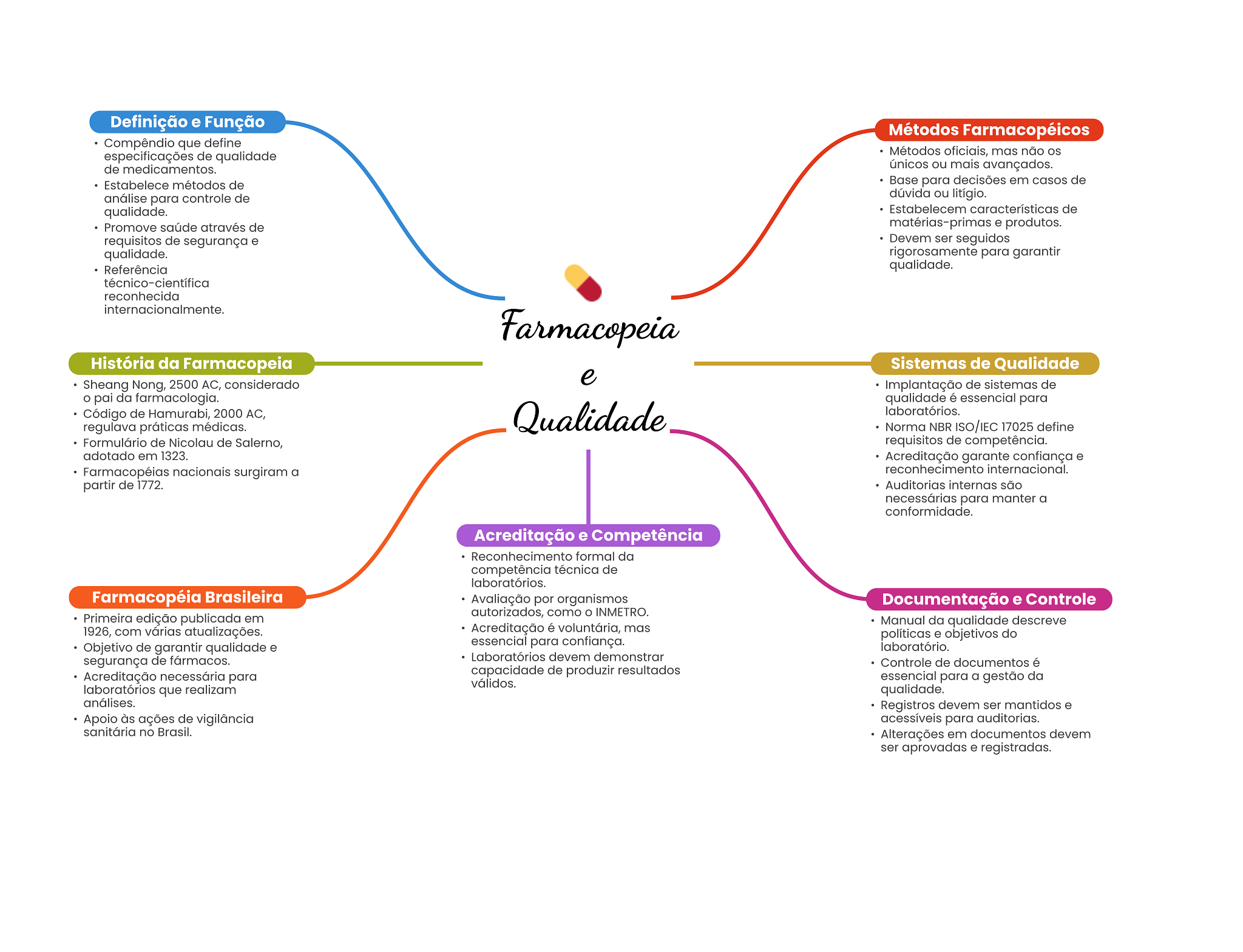 Definição e Função Métodos Farmacopéicos Compêndio que define especificações de qualidade Métodos oficiais, mas não os de medicamentos. únicos ou mais avançados. Estabelece métodos de Base para decisões em casos de análise para controle de dúvida ou litígio. qualidade. Estabelecem características de Promove saúde através de matérias-primas e produtos. requisitos de segurança e Devem ser seguidos qualidade. rigorosamente para garantir Referência qualidade. técnico-científica reconhecida internacionalmente. Farmacopeia História da Farmacopeia Sistemas de Qualidade e Sheang Nong, 2500 considerado Implantação de sistemas de O pai da farmacologia. qualidade é essencial para Código de Hamurabi, 2000 Qualidade laboratórios. regulava práticas médicas. Norma NBR ISO/IEC 17025 define Formulário de Nicolau de Salerno, requisitos de competência. adotado em 1323. Acreditação garante confiança e Farmacopéias nacionais surgiram a reconhecimento internacional. partir de 1772. Auditorias internas são necessárias para manter a conformidade. Acreditação e Competência Reconhecimento formal da competência técnica de laboratórios. Farmacopéia Brasileira Avaliação por organismos Documentação e Controle Primeira edição publicada em autorizados, como INMETRO. Manual da qualidade descreve 1926, com várias atualizações. Acreditação é voluntária, mas políticas e objetivos do Objetivo de garantir qualidade e essencial para confiança. laboratório. segurança de fármacos. Laboratórios devem demonstrar Controle de documentos é Acreditação necessária para capacidade de produzir resultados válidos. essencial para a gestão da laboratórios que realizam qualidade. análises. Registros devem ser mantidos e Apoio às ações de vigilância acessíveis para auditorias. sanitária no Brasil. Alterações em documentos devem ser aprovadas e registradas.