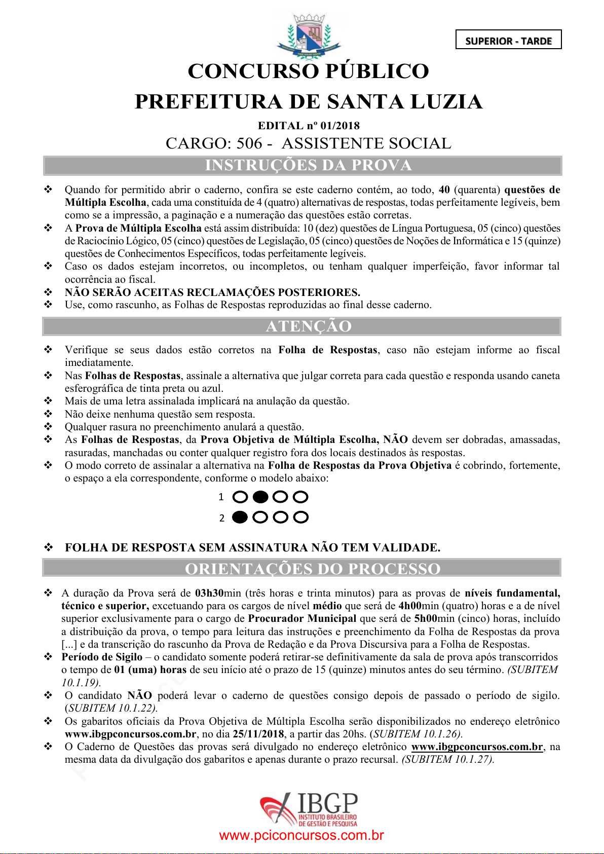 pcimarkpci MjgwNDowMTRjOjAyMjg6ODQ1ZDplMGFjOjhmMGY6MjVkNDo3NGFi:TW9uLCAxMiBKYW4gMjAyNiAwODozMToyNCAtMDMwMA== www.pciconcursos.com.br 1 q CONCURSO PÚBLICO PREFEITURA DE SANTA LUZIA EDITAL nº 01/2018 CARGO: 506 - ASSISTENTE SOCIAL INSTRUÇÕES DA PROVA Quando for permitido abrir o caderno, confira se este caderno contém, ao todo, 40 (quarenta) questões de Múltipla Escolha, cada uma constituída de 4 (quatro) alternativas de respostas, todas perfeitamente legíveis, bem como se a impressão, a paginação e a numeração das questões estão corretas. A Prova de Múltipla Escolha está assim distribuída: 10 (dez) questões de Língua Portuguesa, 05 (cinco) questões de Raciocínio Lógico, 05 (cinco) questões de Legislação, 05 (cinco) questões de Noções de Informática e 15 (quinze) questões de Conhecimentos Específicos, todas perfeitamente legíveis. Caso os dados estejam incorretos, ou incompletos, ou tenham qualquer imperfeição, favor informar tal ocorrência ao fiscal. NÃO SERÃO ACEITAS RECLAMAÇÕES POSTERIORES. Use, como rascunho, as Folhas de Respostas reproduzidas ao final desse caderno. ATENÇÃO Verifique se seus dados estão corretos na Folha de Respostas, caso não estejam informe ao fiscal imediatamente. Nas Folhas de Respostas, assinale a alternativa que julgar correta para cada questão e responda usando caneta esferográfica de tinta preta ou azul. Mais de uma letra assinalada implicará na anulação da questão. Não deixe nenhuma questão sem resposta. Qualquer rasura no preenchimento anulará a questão. As Folhas de Respostas, da Prova Objetiva de Múltipla Escolha, NÃO devem ser dobradas, amassadas, rasuradas, manchadas ou conter qualquer registro fora dos locais destinados às respostas. O modo correto de assinalar a alternativa na Folha de Respostas da Prova Objetiva é cobrindo, fortemente, o espaço a ela correspondente, conforme o modelo abaixo: FOLHA DE RESPOSTA SEM ASSINATURA NÃO TEM VALIDADE. ORIENTAÇÕES DO PROCESSO A duração da Prova será de 03h30min (três horas e trinta minutos) para as provas de níveis fundamental, técnico e superior, excetuando para os cargos de nível médio que será de 4h00min (quatro) horas e a de nível superior exclusivamente para o cargo de Procurador Municipal que será de 5h00min (cinco) horas, incluído a distribuição da prova, o tempo para leitura das instruções e preenchimento da Folha de Respostas da prova [...] e da transcrição do rascunho da Prova de Redação e da Prova Discursiva para a Folha de Respostas. Período de Sigilo – o candidato somente poderá retirar-se definitivamente da sala de prova após transcorridos o tempo de 01 (uma) horas de seu início até o prazo de 15 (quinze) minutos antes do seu término. (SUBITEM 10.1.19). O candidato NÃO poderá levar o caderno de questões consigo depois de passado o período de sigilo. (SUBITEM 10.1.22). Os gabaritos oficiais da Prova Objetiva de Múltipla Escolha serão disponibilizados no endereço eletrônico www.ibgpconcursos.com.br, no dia 25/11/2018, a partir das 20hs. (SUBITEM 10.1.26). O Caderno de Questões das provas será divulgado no endereço eletrônico www.ibgpconcursos.com.br, na mesma data da divulgação dos gabaritos e apenas durante o prazo recursal. (SUBITEM 10.1.27). SUPERIOR - TARDE 1 2 www.pciconcursos.com.br pcimarkpci MjgwNDowMTRjOjAyMjg6ODQ1ZDplMGFjOjhmMGY6MjVkNDo3NGFi:TW9uLCAxMiBKYW4gMjAyNiAwODozMToyNCAtMDMwMA== www.pciconcursos.com.br 2 www.pciconcursos.com.br pcimarkpci MjgwNDowMTRjOjAyMjg6ODQ1ZDplMGFjOjhmMGY6MjVkNDo3NGFi:TW9uLCAxMiBKYW4gMjAyNiAwODozMToyNCAtMDMwMA== www.pciconcursos.com.br 3 PORTUGUÊS Leia o texto 1 para responder as questões de 1 a 4 “Não haverá paz neste planeta enquanto, algures no mundo, os direitos humanos forem violados.” Neste Dia Internacional da Paz, as palavras de René Cassin, um dos artesãos da Declaração Universal dos Direitos Humanos, em 1948, relembram-nos que a paz continua a ser um ideal inalcançável enquanto os direitos humanos fundamentais não forem respeitados. São, pois, a condição primordial de uma sociedade pacífica em que a dignidade de todos os indivíduos é respeitada e onde todos podem usufruir de direitos iguais e inalienáveis. Estas palavras também nos relembram do nosso dever de solidariedade para com os nossos semelhantes; a paz é imperfeita e frágil se não beneficiar a todos e a todas. Os direitos humanos ou são universais ou não são. Esta ligação intrínseca entre paz e respeito pelos direitos fundamentais constitui o tema desta nova edição do Dia Internacional da Paz, no momento em que se celebra o 70º aniversário da Declaração Universal dos Direitos Humanos. Os ideais de paz e de direitos universais são, todos os dias, contestados e violados. Existem vários obstáculos para a sua realização. A nossa capacidade em edificarmos um mundo feito de harmonia, de compreensão e de coexistência pacífica é posta à prova pelos mais diversos desafios: desigualdades sociais e econômicas que causam sofrimento e pobreza; alterações climáticas que geram novos conflitos; explosão demográfica que cria novas tensões… Por outro lado, propagam-se também novas formas de populismo e de extremismo em todo o mundo. Para vencermos estes desafios, temos de agir de forma coletiva e construir, passo a passo, o edifício da paz. Este é o objetivo do Programa da Agenda 2030 para o Desenvolvimento Sustentável, que apela a uma ação concentrada para alcançarmos os 17 objetivos de desenvolvimento sustentável do milênio, que contribuem para um mundo mais justo e mais pacífico – luta contra a pobreza, contra a fome, contra as desigualdades de gênero, promoção da educação, defesa da justiça, compromisso em favor de um ambiente saudável… Todos os dias, a UNESCO, através dos seus programas e das suas ações em campo, reafirma o seu compromisso original, consagrado no seu Ato Constitutivo: erguer os baluartes da paz no espírit