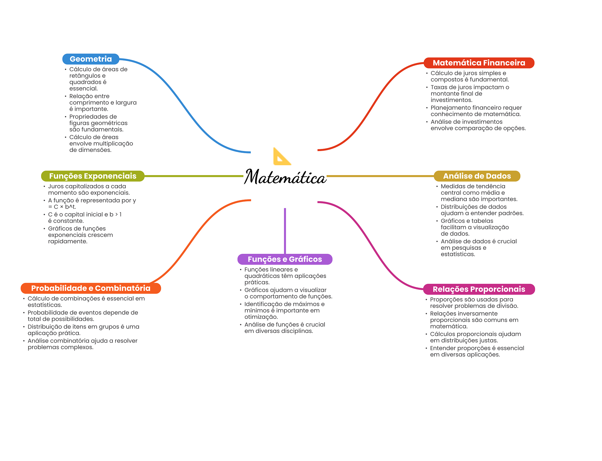 Geometria Matemática Financeira Cálculo de áreas de retângulos e Cálculo de juros simples e quadrados é compostos é fundamental. essencial. Taxas de juros impactam o Relação entre montante final de investimentos. comprimento e largura é importante. Planejamento financeiro requer Propriedades de conhecimento de matemática. figuras geométricas Análise de investimentos são fundamentais. envolve comparação de opções. Cálculo de áreas envolve multiplicação de dimensões. Funções Exponenciais Matemática Análise de Dados Juros capitalizados a cada Medidas de tendência momento são exponenciais. central como média e A função é representada por y mediana são importantes. = b^t. Distribuições de dados é capital inicial e b > 1 ajudam a entender padrões. é constante. Gráficos e tabelas Gráficos de funções facilitam a visualização exponenciais crescem de dados. rapidamente. Análise de dados é crucial em pesquisas e estatísticas. Funções e Gráficos Funções lineares e quadráticas têm aplicações práticas. Probabilidade e Combinatória Gráficos ajudam a visualizar Relações Proporcionais Cálculo de combinações é essencial em comportamento de funções. Proporções são usadas para estatísticas. Identificação de máximos e resolver problemas de divisão. Probabilidade de eventos depende de mínimos é importante em otimização. Relações inversamente total de possibilidades. proporcionais são comuns em Distribuição de itens em grupos é uma Análise de funções é crucial matemática. aplicação prática. em diversas disciplinas. Cálculos proporcionais ajudam Análise combinatória ajuda a resolver em distribuições justas. problemas complexos. Entender proporções é essencial em diversas aplicações.