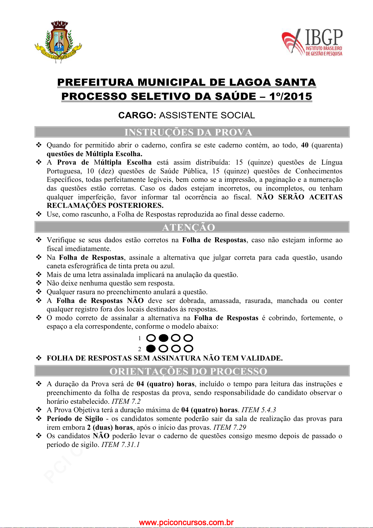 pcimarkpci MjgwNDowMTRjOjAyMjg6ODQ1ZDplMGFjOjhmMGY6MjVkNDo3NGFi:TW9uLCAxMiBKYW4gMjAyNiAwODozMzoyNSAtMDMwMA== www.pciconcursos.com.brwww.pciconcursos.com.br 1 PREFEITURA MUNICIPAL DE LAGOA SANTA PROCESSO SELETIVO DA SAÚDE – 1º/2015 CARGO: ASSISTENTE SOCIAL INSTRUÇÕES DA PROVA Quando for permitido abrir o caderno, confira se este caderno contém, ao todo, 40 (quarenta) questões de Múltipla Escolha. A Prova de Múltipla Escolha está assim distribuída: 15 (quinze) questões de Língua Portuguesa, 10 (dez) questões de Saúde Pública, 15 (quinze) questões de Conhecimentos Específicos, todas perfeitamente legíveis, bem como se a impressão, a paginação e a numeração das questões estão corretas. Caso os dados estejam incorretos, ou incompletos, ou tenham qualquer imperfeição, favor informar tal ocorrência ao fiscal. NÃO SERÃO ACEITAS RECLAMAÇÕES POSTERIORES. Use, como rascunho, a Folha de Respostas reproduzida ao final desse caderno. ATENÇÃO Verifique se seus dados estão corretos na Folha de Respostas, caso não estejam informe ao fiscal imediatamente. Na Folha de Respostas, assinale a alternativa que julgar correta para cada questão, usando caneta esferográfica de tinta preta ou azul. Mais de uma letra assinalada implicará na anulação da questão. Não deixe nenhuma questão sem resposta. Qualquer rasura no preenchimento anulará a questão. A Folha de Respostas NÃO deve ser dobrada, amassada, rasurada, manchada ou conter qualquer registro fora dos locais destinados às respostas. O modo correto de assinalar a alternativa na Folha de Respostas é cobrindo, fortemente, o espaço a ela correspondente, conforme o modelo abaixo: FOLHA DE RESPOSTAS SEM ASSINATURA NÃO TEM VALIDADE. ORIENTAÇÕES DO PROCESSO A duração da Prova será de 04 (quatro) horas, incluído o tempo para leitura das instruções e preenchimento da folha de respostas da prova, sendo responsabilidade do candidato observar o horário estabelecido. ITEM 7.2 A Prova Objetiva terá a duração máxima de 04 (quatro) horas. ITEM 5.4.3 Período de Sigilo - os candidatos somente poderão sair da sala de realização das provas para irem embora 2 (duas) horas, após o início das provas. ITEM 7.29 Os candidatos NÃO poderão levar o caderno de questões consigo mesmo depois de passado o período de sigilo. ITEM 7.31.1 1 2 pcimarkpci MjgwNDowMTRjOjAyMjg6ODQ1ZDplMGFjOjhmMGY6MjVkNDo3NGFi:TW9uLCAxMiBKYW4gMjAyNiAwODozMzoyNSAtMDMwMA== www.pciconcursos.com.brwww.pciconcursos.com.br 2 pcimarkpci MjgwNDowMTRjOjAyMjg6ODQ1ZDplMGFjOjhmMGY6MjVkNDo3NGFi:TW9uLCAxMiBKYW4gMjAyNiAwODozMzoyNSAtMDMwMA== www.pciconcursos.com.brwww.pciconcursos.com.br 3 LÍNGUA PORTUGUESA E LITERATURA Instrução: Leia o texto 1, a seguir, para responder às questões 1 a 10. TEXTO I Casa segura para idosos (Por Marco Antônio Veado* [1º§] O desenvolvimento de vacinas, a maior conscientização a respeito de uma boa alimentação e da prática regular de exercícios físicos e, principalmente, os avanços tecnológicos da medicina levaram ao aumento da longevidade da população brasileira, o que faz com que, cada vez mais, tenhamos a oportunidade de tratar o idoso em nossos hospitais. No Brasil, os idosos correspondiam a 4,2% da população em 1950; já no ano de 2000, representavam 8,6% e, em 2020, deverão corresponder a 14%. Comumente os idosos chegam para nosso atendimento principalmente como vítimas de quedas. A osteoporose, tão comum nessa etapa da vida, facilita sobremaneira a ocorrência de fraturas, mesmo nos traumas triviais, acontecidos em suas próprias residências. São comuns as fraturas ao nível do ombro, punho, coluna e fêmur, que necessitam, muitas vezes, de tratamento cirúrgico, com suas previstas e sérias complicações. Em 2011, desenvolvemos um trabalho sobre as fraturas do fêmur do idoso, que mostrou a importância dessa fratura, associada com alta mortalidade (25%) e perda funcional (30%) em um ano, com apenas 40% dos idosos ficando totalmente independentes nas atividades de vida diária após a fratura. [2º§] O idoso atual tem um perfil bem diferente do idoso do passado. Aquela pessoa que ficava em casa de pijama e chinelos não mais representa o idoso atual, felizmente, hoje, mais envolvido em atividades físicas e sociais. Mas, apesar de todo esse avanço, continua grande a preocupação com as quedas nesse grupo etário. São várias as situações em que o idoso corre o risco de quedas. A tonteira ao se levantar devido à hipotensão postural é um exemplo: nunca se deve levantar rapidamente, é melhor permanecer sentado na cama por alguns segundos antes de ficar de pé. O déficit visual, a fraqueza muscular, calçados inadequados, tapetes escorregadios e mobílias mal posicionadas são outras causas comuns de quedas. Além dessas causas, também é frequente a perda do equilíbrio, devido ao efeito de medicamentos usados para dormir e aos ambientes mal iluminados. [3º§] A Sociedade Brasileira de Ortopedia publicou, algum tempo atrás, um manual com importantes recomendações e detalhada especificação do mobiliário, para aumentar a segurança e o conforto do idoso dentro da sua própria casa. Importante reforçar que o idoso nunca deve estar sozinho, pois uma situação emergencial pode ocorrer a qualquer momento. [4º§] A casa deve ser bem iluminada, evitando-se o piso liso e apresentando marcações nos caminhos, inclusive na parte externa. A sala de jantar e de visitas devem ser pintadas com cores claras e sempre com muita luz. Poltronas e sofás são extremamente importantes, por serem lugares onde o idoso vai passar a maior parte do seu tempo. Devem ser confortáveis, fáceis de levantar e de sentar, com assento firme e com braços. Normalmente, devem-se evitar tapetes e fios de telefone soltos pela casa nas áreas de passagem. Extremamente perigoso é andar de meia, fato comum no ambiente doméstico. Sempre se deve optar por pisos antiderrapantes e luz noturna nas áreas de circulaç