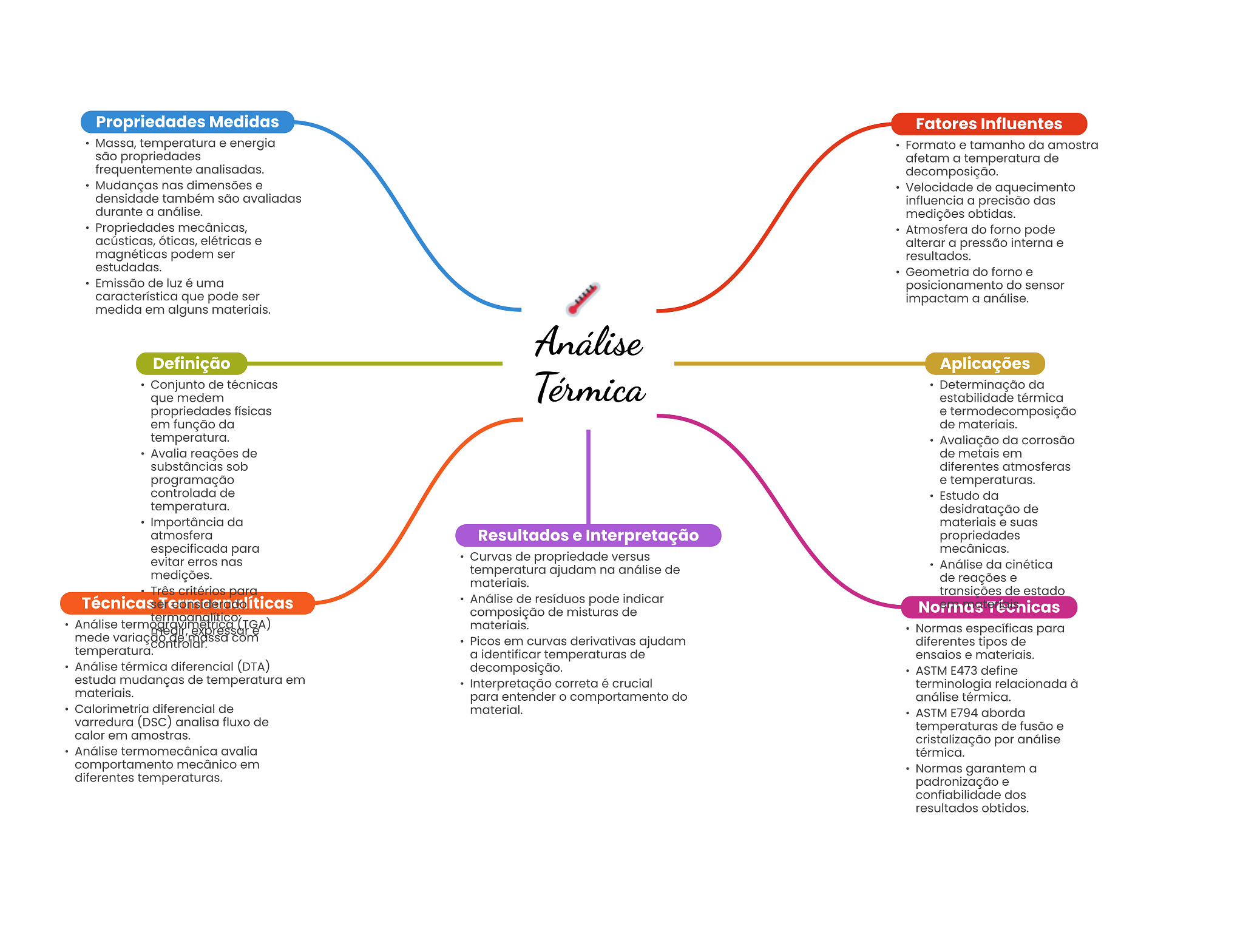 Propriedades Medidas Fatores Influentes Massa, temperatura e energia Formato e tamanho da amostra são propriedades afetam a temperatura de frequentemente analisadas. decomposição. Mudanças nas dimensões e Velocidade de aquecimento densidade também são avaliadas influencia a precisão das durante a análise. medições obtidas. Propriedades mecânicas, Atmosfera do forno pode acústicas, óticas, elétricas e alterar a pressão interna e magnéticas podem ser resultados. estudadas. Geometria do forno e Emissão de luz é uma posicionamento do sensor característica que pode ser impactam a análise. medida em alguns materiais. Análise Definição Aplicações Conjunto de técnicas Térmica Determinação da que medem estabilidade térmica propriedades físicas e termodecomposição em função da de materiais. temperatura. Avaliação da corrosão Avalia reações de de metais em substâncias sob diferentes atmosferas programação e temperaturas. controlada de Estudo da temperatura. desidratação de Importância da materiais e suas atmosfera Resultados e Interpretação propriedades especificada para mecânicas. evitar erros nas Curvas de propriedade versus Análise da cinética medições. temperatura ajudam na análise de materiais. de reações e Três critérios para transições de estado Técnicas Análise de resíduos pode indicar composição de misturas de Normas Técnicas Análise materiais. Normas específicas para mede variação massa com Picos em curvas derivativas ajudam diferentes tipos de temperatura. a identificar temperaturas de ensaios e materiais. Análise térmica diferencial (DTA) decomposição. ASTM E473 define estuda mudanças de temperatura em Interpretação correta é crucial terminologia relacionada à materiais. para entender comportamento do análise térmica. Calorimetria diferencial de material. ASTM E794 aborda varredura (DSC) analisa fluxo de temperaturas de fusão e calor em amostras. cristalização por análise Análise termomecânica avalia térmica. comportamento mecânico em Normas garantem a diferentes temperaturas. padronização e confiabilidade dos resultados obtidos.