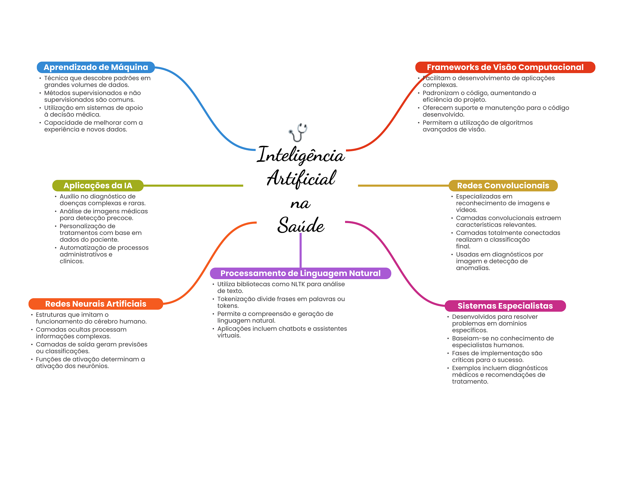 Aprendizado de Máquina Frameworks de Visão Computacional Técnica que descobre padrões em acilitam desenvolvimento de aplicações grandes volumes de dados. complexas. Métodos supervisionados e não Padronizam código, aumentando a supervisionados são comuns. eficiência do projeto. Utilização em sistemas de apoio Oferecem suporte e manutenção para código à decisão médica. desenvolvido. Capacidade de melhorar com a Permitem a utilização de algoritmos experiência e novos dados. avançados de visão. Inteligência Aplicações da IA Artificial Redes Convolucionais Auxílio no diagnóstico de Especializadas em doenças complexas e raras. na reconhecimento de imagens e Análise de imagens médicas vídeos. para detecção precoce. Camadas convolucionais extraem Personalização de Saúde características relevantes. tratamentos com base em Camadas totalmente conectadas dados do paciente. realizam a classificação Automatização de processos final. administrativos e Usadas em diagnósticos por clínicos. imagem e detecção de anomalias. Processamento de Linguagem Natural Utiliza bibliotecas como NLTK para análise de texto. Tokenização divide frases em palavras ou Redes Neurais Artificiais tokens. Sistemas Especialistas Estruturas que imitam Permite a compreensão e geração de Desenvolvidos para resolver funcionamento do cérebro humano. linguagem natural. problemas em domínios Camadas ocultas processam Aplicações incluem chatbots e assistentes específicos. informações complexas. virtuais. Baseiam-se no conhecimento de Camadas de saída geram previsões especialistas humanos. ou classificações. Fases de implementação são Funções de ativação determinam a críticas para sucesso. ativação dos neurônios. Exemplos incluem diagnósticos médicos e recomendações de tratamento.