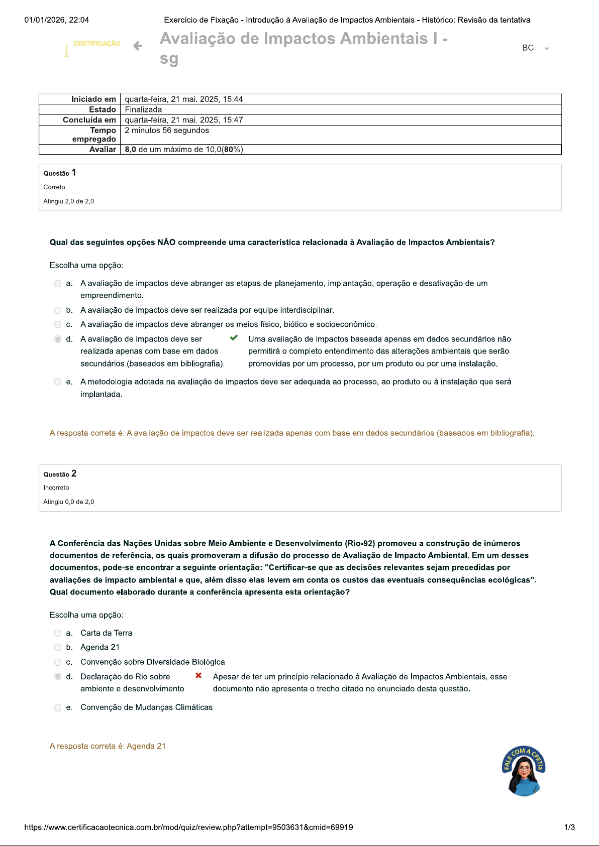 01/01/2026, 22:04 Exercício de Fixação Introdução à Avaliação de Impactos Ambientais Histórico: Revisão da tentativa CERTIFICAÇÃO Avaliação de Impactos Ambientais - BC sg Iniciado em quarta-feira, 21 mai. 2025, 15:44 Estado Finalizada Concluída em quarta-feira, 21 mai. 2025, 15:47 Tempo 2 minutos 56 segundos empregado Avaliar 8,0 de um máximo de 10,0(80%) Questão 1 Correto Atingiu 2,0 de 2,0 Qual das seguintes opções NÃO compreende uma característica relacionada à Avaliação de Impactos Ambientais? Escolha uma opção: a. A avaliação de impactos deve abranger as etapas de planejamento, implantação, operação e desativação de um empreendimento. b. A avaliação de impactos deve ser realizada por equipe interdisciplinar. A avaliação de impactos deve abranger os meios físico, biótico e socioeconômico. d. A avaliação de impactos deve ser Uma avaliação de impactos baseada apenas em dados secundários não realizada apenas com base em dados permitirá o completo entendimento das alterações ambientais que serão secundários (baseados em bibliografia). promovidas por um processo, por um produto ou por uma instalação. e. A metodologia adotada na avaliação de impactos deve ser adequada ao processo, ao produto ou à instalação que será implantada. A resposta correta é: A avaliação de impactos deve ser realizada apenas com base em dados secundários (baseados em bibliografia). Questão 2 Incorreto Atingiu 0,0 de 2,0 A Conferência das Nações Unidas sobre Meio Ambiente e Desenvolvimento (Rio-92) promoveu a construção de inúmeros documentos de referência, os quais promoveram a difusão do processo de Avaliação de Impacto Ambiental. Em um desses documentos, pode-se encontrar a seguinte orientação: "Certificar-se que as decisões relevantes sejam precedidas por avaliações de impacto ambiental e que, além disso elas levem em conta os custos das eventuais consequências ecológicas". Qual documento elaborado durante a conferência apresenta esta orientação? Escolha uma opção: a. Carta da Terra b. Agenda 21 Convenção sobre Diversidade Biológica d. Declaração do Rio sobre Apesar de ter um princípio relacionado à Avaliação de Impactos Ambientais, esse ambiente e desenvolvimento documento não apresenta trecho citado no enunciado desta questão. e. Convenção de Mudanças Climáticas A resposta correta é: Agenda 21 A 1/301/01/2026, 22:04 Exercício de Fixação Introdução à Avaliação de Impactos Ambientais Histórico: Revisão da tentativa CERTIFICAÇÃO Avaliação de Impactos Ambientais I - BC sg Atingiu 2,0 de 2,0 Em que década as avaliações de impactos ambientais ganharam caráter legal nos Estados Unidos? Escolha uma opção: a. 1970 No dia 1° de Janeiro de 1970, a Política Nacional de Meio Ambiente dos Estados Unidos entrou em vigor, tornando obrigatória a realização de Avaliação de Impactos Ambientais. b. 1960 1980 d. 1950 e. 1990 A resposta correta é: 1970 Questão 4 Correto Atingiu 2,0 de 2,0 Qual das opções a seguir não compreende um agente promotor da institucionalização da Avaliação de Impactos Ambientais? Escolha uma opção: a. Exigência de organismos multilaterais de financiamento b. Crescimento da conscientização ambiental Exigência da população devido à preocupação com a crescente ocorrência de acidentes ambientais d. Agilidade em processos de A obtenção de maior agilidade nos processos de licenciamento não representa um agente licenciamento ambiental motivador para a institucionalização da Avaliação de Impactos Ambientais. e. Criação de legislação específica A resposta correta é: Agilidade em processos de licenciamento ambiental A 2/301/01/2026, 22:04 Exercício de Fixação Introdução à Avaliação de Impactos Ambientais Histórico: Revisão da tentativa CERTIFICAÇÃO Avaliação de Impactos Ambientais BC sg Atingiu 2,0 de 2,0 Não há uma única metodologia adotada para a execução de uma Avaliação de Impactos Ambientais. Esta constatação deve-se a qual das seguintes características? Escolha uma opção: a. Formação diversificada de profissionais capazes de realizar uma avaliação de impactos ambientais. b. Avaliação de impactos realizada durante as etapas de planejamento, implantação, operação e desativação de um empreendimento. Muitas das ações impactantes ocorrem em razão de Uma única metodologia de avaliação de impactos não seria capaz projetos que são propostos para ambientes de realizar, de maneira efetiva, a identificação e a mensuração de diferentes, gerando uma relação única de causa e impactos gerados por empreendimentos diferentes. efeito. d. Avaliação de impactos deve abranger diferentes ambientes, ultrapassando a divisão política de municípios, estados ou países. e. Utilização de dados primários e secundários. A resposta correta é: Muitas das ações impactantes ocorrem em razão de projetos que são propostos para ambientes diferentes, gerando uma relação única de causa e efeito. Anterior Próximo A 3/3