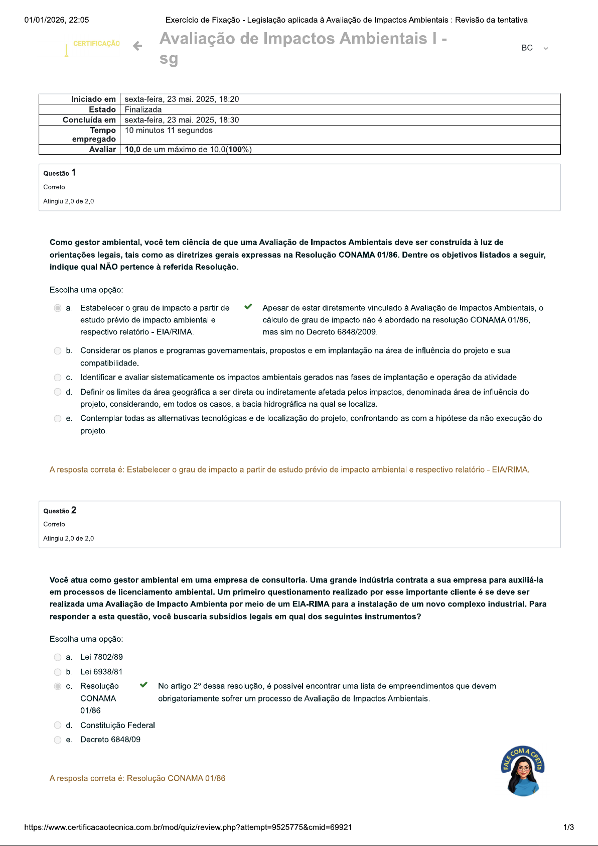 01/01/2026, 22:05 Exercício de Fixação Legislação aplicada à Avaliação de Impactos Ambientais Revisão da tentativa CERTIFICAÇÃO Avaliação de Impactos Ambientais - BC sg Iniciado em sexta-feira, 23 mai. 2025, 18:20 Estado Finalizada Concluída em sexta-feira, 23 mai. 2025, 18:30 Tempo 10 minutos 11 segundos empregado Avaliar 10,0 de um máximo de 10,0(100%) Questão 1 Correto Atingiu 2,0 de 2,0 Como gestor ambiental, você tem ciência de que uma Avaliação de Impactos Ambientais deve ser construída à luz de orientações legais, tais como as diretrizes gerais expressas na Resolução CONAMA 01/86. Dentre os objetivos listados a seguir, indique qual NÃO pertence à referida Resolução. Escolha uma opção: a. Estabelecer o grau de impacto a partir de Apesar de estar diretamente vinculado à Avaliação de Impactos Ambientais, o estudo prévio de impacto ambiental e cálculo de grau de impacto não é abordado na resolução CONAMA 01/86, respectivo relatório EIA/RIMA. mas sim no Decreto 6848/2009. b. Considerar os planos e programas governamentais, propostos e em implantação na área de influência do projeto e sua compatibilidade. Identificar e avaliar sistematicamente os impactos ambientais gerados nas fases de implantação e operação da atividade. d. Definir os limites da área geográfica a ser direta ou indiretamente afetada pelos impactos, denominada área de influência do projeto, considerando, em todos os casos, a bacia hidrográfica na qual se localiza. e. Contemplar todas as alternativas tecnológicas e de localização do projeto, confrontando-as com a hipótese da não execução do projeto. A resposta correta é: Estabelecer grau de impacto a partir de estudo prévio de impacto ambiental e respectivo relatório EIA/RIMA. Questão 2 Correto Atingiu 2,0 de 2,0 Você atua como gestor ambiental em uma empresa de consultoria. Uma grande indústria contrata a sua empresa para auxiliá-la em processos de licenciamento ambiental. Um primeiro questionamento realizado por esse importante cliente é se deve ser realizada uma Avaliação de Impacto Ambienta por meio de um EIA-RIMA para a instalação de um novo complexo industrial. Para responder a esta questão, você buscaria subsídios legais em qual dos seguintes instrumentos? Escolha uma opção: a. Lei 7802/89 b. Lei 6938/81 Resolução No artigo 2° dessa resolução, é possível encontrar uma lista de empreendimentos que devem CONAMA obrigatoriamente sofrer um processo de Avaliação de Impactos Ambientais. 01/86 d. Constituição Federal e. Decreto 6848/09 A A resposta correta é: Resolução CONAMA 01/86 1/301/01/2026, 22:05 Exercício de Fixação Legislação aplicada à Avaliação de Impactos Ambientais Revisão da tentativa CERTIFICAÇÃO Avaliação de Impactos Ambientais - BC sg Atingiu 2,0 de 2,0 Durante um processo de Avaliação de Impactos Ambientais, deve-se definir a área de influência destes impactos. Segundo a Resolução CONAMA 01/86, que sempre deve ser levado em consideração durante esta definição? Escolha uma opção: a. A capacidade do ambiente em minimizar os impactos. b. A disponibilidade de mão de obra para a implantação do empreendimento. A inexistência de um órgão ambiental local que possa realizar a análise da Avaliação de Impactos Ambientais. d. Os limites do município onde se localiza o empreendimento. e. A bacia hidrográfica onde Segundo a Resolução CONAMA 01/86, a bacia hidrográfica compreende algo que deve ser se localiza o levado em consideração durante a definição da área de influência do empreendimento. empreendimento. A resposta correta é: A bacia hidrográfica onde se localiza o empreendimento. Questão 4 Correto Atingiu 2,0 de 2,0 Como gestor ambiental de uma grande empresa, você tem a responsabilidade de acompanhar os processos de licenciamento necessários para a implantação de novas unidades. Em um processo de licenciamento, IBAMA lhe questiona sobre cálculo de grau de impacto do empreendimento. Segundo decreto 6848/09, cálculo do grau de impacto é fundamental para: Escolha uma opção: a. definir a magnitude dos impactos gerados pelo empreendimento. b. Definir impacto sobre a biodiversidade. Definir o índice de temporalidade dos impactos gerados pelo empreendimento. d. Definir a compensação ambiental necessária cálculo de grau de impacto permite ao órgão licenciador definir o valor para a implantação do empreendimento. que será destinado para compensação ambiental. e. definir a abrangência dos impactos gerados pelo empreendimento. A resposta correta é: Definir a compensação ambiental necessária para a implantação do empreendimento. A 2/301/01/2026, 22:05 Exercício de Fixação Legislação aplicada à Avaliação de Impactos Ambientais : Revisão da tentativa CERTIFICAÇÃO Avaliação de Impactos Ambientais - BC sg Atingiu 2,0 de 2,0 A empresa onde você atua como gestor ambiental demandou a realização de uma Avaliação de Impacto Ambiental para implantação de uma estação de tratamento de efluentes. Para isso, você realiza a contratação de uma empresa capaz de realizar tal avaliação. Quem será tecnicamente responsável pela elaboração dessa Avaliação de Impactos Ambientais? Escolha uma opção: a. A equipe multidisciplinar habilitada que Recairá sobre a equipe técnica a responsabilidade pelas informações atua na empresa contratada. apresentadas no processo de avaliação de impactos ambientais. b. órgão licenciador (federal, estadual ou municipal). engenheiro responsável pelo projeto da estação de tratamento de efluentes. d. proponente do projeto de instalação da estação de tratamento de efluentes. e. gestor ambiental. A resposta correta é: A equipe multidisciplinar habilitada que atua na empresa contratada. Anterior Próximo A 3/3
