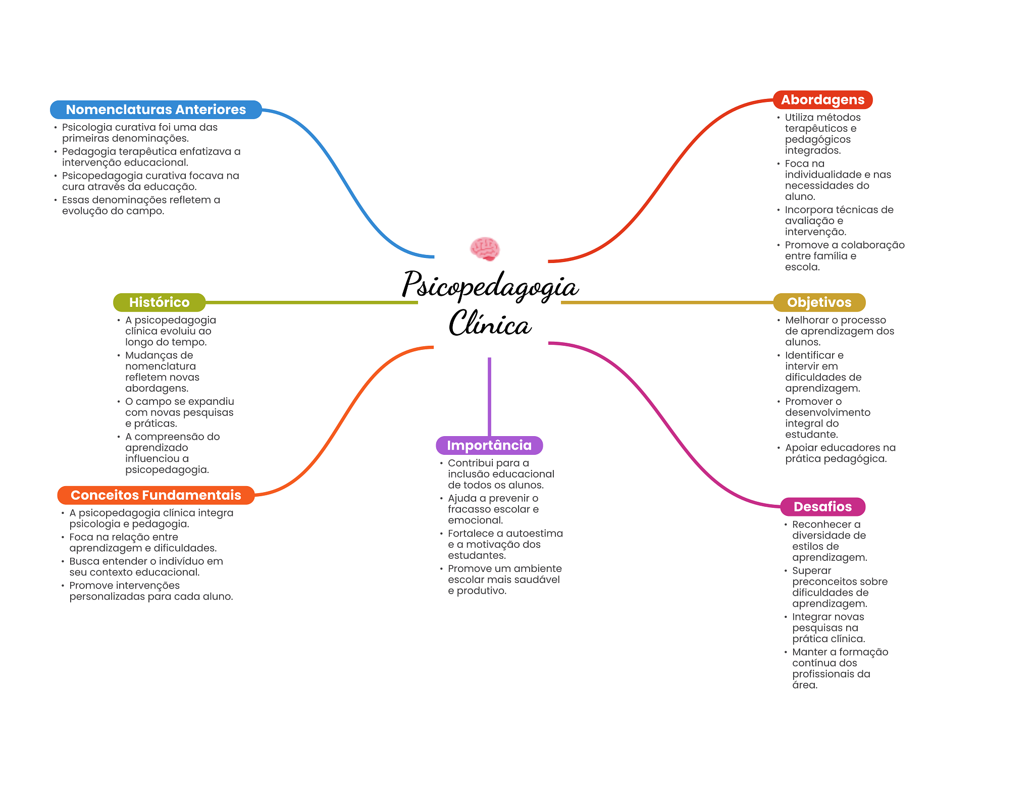 Abordagens Nomenclaturas Anteriores Utiliza métodos Psicologia curativa foi uma das terapêuticos e primeiras denominações. pedagógicos Pedagogia terapêutica enfatizava a integrados. intervenção educacional. Foca na Psicopedagogia curativa focava na individualidade e nas cura através da educação. necessidades do Essas denominações refletem a evolução do campo. Incorpora técnicas de avaliação e intervenção. Promove a colaboração entre família e escola. Psicopedagogia Histórico Objetivos A psicopedagogia Clínica Melhorar processo clínica evoluiu ao de aprendizagem dos longo do tempo. alunos. Mudanças de Identificar e nomenclatura intervir em refletem novas dificuldades de abordagens. aprendizagem. O campo se expandiu Promover com novas pesquisas desenvolvimento e práticas. integral do A compreensão do estudante. aprendizado Importância Apoiar educadores na influenciou a Contribui para a prática pedagógica. psicopedagogia. inclusão educacional de todos OS alunos. Conceitos Fundamentais Ajuda a prevenir O A psicopedagogia clínica integra fracasso escolar e Desafios psicologia e pedagogia. emocional. Reconhecer a Foca na relação entre Fortalece a autoestima diversidade de aprendizagem e dificuldades. e a motivação dos estilos de estudantes. Busca entender indivíduo em aprendizagem. seu contexto educacional. Promove um ambiente Superar escolar mais saudável Promove intervenções preconceitos sobre personalizadas para cada aluno. e produtivo. dificuldades de aprendizagem. Integrar novas pesquisas na prática clínica. Manter a formação contínua dos profissionais da área.