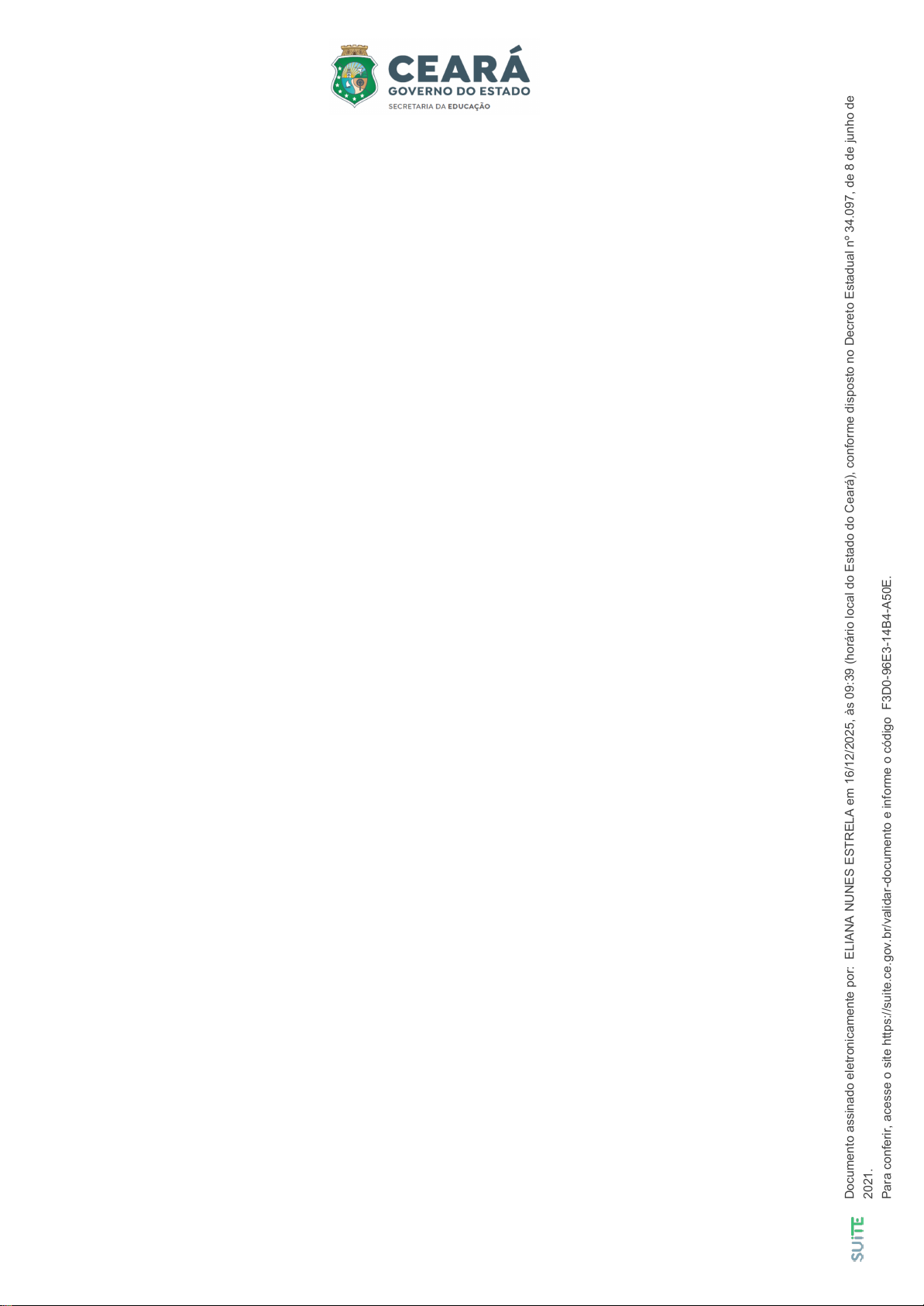 CHAMADA PÚBLICA 2026 SELEÇÃO PARA COMPOSIÇÃO DE BANCO DE BOLSISTAS DO PROGRAMA APRENDIZAGEM NA IDADE CERTA – PAIC Integral A SECRETÁRIA DA EDUCAÇÃO DO ESTADO DO CEARÁ, no uso de suas atribuições, com o objetivo de dar maior transparência aos atos da administração pública, em conformidade com a Lei Nº 14.026, de 17 de dezembro de 2007, e a Lei Nº 15.276, de 28 de dezembro de 2012, que trata de Bolsas de Extensão Tecnológica no âmbito do Programa Aprendizagem na Idade Certa – MAIS PAIC, buscando compor o BANCO DE BOLSISTAS do PAIC Integral nos níveis I, II e III, torna pública a seleção de profissionais para o referido Programa, no Eixo da Gestão Municipal, dos Anos Iniciais (Ciclo de Alfabetização e 3º ao 5º ano) e dos Anos Finais do Ensino Fundamental, conforme a Lei Complementar Nº 297, de 19 de dezembro de 2022, a qual amplia o atendimento do programa às escolas de tempo integral no Estado do Ceará. Dessa forma, o Programa Aprendizagem na Idade Certa – PAIC Integral, objetivando apoiar a universalização do ensino fundamental em tempo integral nas redes públicas do estado do Ceará, tem como intuito realizar ações pedagógicas a partir de formações continuadas de professores e gestores escolares, conforme estabelecido nesta Chamada Pública. Os(As) interessados(as) devem se inscrever para concorrer à Bolsa de Extensão Tecnológica de acordo com a descrição dos perfis detalhados no Anexo I desta Chamada Pública. Os(As) candidatos(as) selecionados(as) farão parte do Banco de Bolsistas do Programa de Aprendizagem na Idade Certa – PAIC Integral, da Secretaria da Educação do Estado do Ceará, e poderão ser convocados(as), conforme a necessidade, a fim de desenvolver e executar as atividades do Programa. 1. OBJETIVOS GERAIS E ESPECÍFICOS DO PROGRAMA PAIC INTEGRAL 1.1. O Programa de Aprendizagem na Idade Certa – PAIC Integral, da Secretaria da Educação do Estado do Ceará, anteriormente chamado de Programa de Alfabetização na Idade Certa – PAIC, validado pela Lei Nº 14.026, de 17 de dezembro de 2007, e ampliado pela Lei Nº 15.921, de 15 de dezembro de 2015, tem por objetivo principal a cooperação entre o Governo do Estado e os 184 (cento e oitenta e quatro) municípios cearenses. O programa estabelece, como finalidade primordial, o apoio técnico, financeiro e pedagógico aos municípios visando ampliar as oportunidades de desenvolvimento da aprendizagem dos alunos do Ensino Fundamental (1º ao 9° ano) e garantindo a qualidade da aprendizagem e a equidade no ensino da rede pública, por meio de um conjunto de ações definidas e organizadas pelo Programa. 1.2. O detalhamento quanto à tipificação e aos valores das Bolsas de Extensão Tecnológica constam no Anexo I desta Chamada Pública, e os(as) interessados(as) podem concorrer apenas a um tipo de Bolsa. 1.3. A Bolsa de Extensão Tecnológica constitui-se em instrumento de apoio à execução do Programa por meio da atuação de profissionais de diversas áreas do conhecimento, com proficiência técnica e/ou científica, com experiências em projetos e ações pedagógicas, visando intercâmbio e aprimoramento do conhecimento utilizado e implementação de D oc um en to a ss in ad o el et ro ni ca m en te p or : E LI A N A N U N E S E S T R E LA e m 1 6/ 12 /2 02 5, à s 09 :3 9 (h or ár io lo ca l d o E st ad o do C ea rá ), c on fo rm e di sp os to n o D ec re to E st ad ua l n º 34 .0 97 , d e 8 de ju nh o de 20 21 . P ar a co nf er ir, a ce ss e o si te h ttp s: //s ui te .c e. go v. br /v al id ar -d oc um en to e in fo rm e o có di go F 3D 0- 96 E 3- 14 B 4- A 50 E . tecnologias educacionais para o desenvolvimento institucional, científico e tecnológico, produção e aprimoramento de materiais instrucionais e realização de formação em serviço das equipes da SEDUC e das Coordenadorias Regionais de Desenvolvimento da Educação – CREDE, além dos técnicos e professores das redes municipais de ensino do Estado do Ceará. 2. DAS CONDIÇÕES DE PARTICIPAÇÃO 2.1. Bolsas de Extensão Tecnológica Níveis I e II – Eixo de Ensino Fundamental I e II: Profissionais do Magistério, com titulação de doutor, mestre ou detentores de amplo conhecimento, conforme Anexo I, nas áreas de Língua Portuguesa, Matemática, Ciências da Natureza, Ciências Humanas e Pedagogia, com proficiência técnica e/ou científica, servidores públicos ou não, com experiência comprovada em contexto escolar ou acadêmico. 2.1.1. Eixos do programa e áreas de atuação Eixo Área de atuação Ciclo de Alfabetização Língua Portuguesa Ciclo de Alfabetização Matemática Anos Iniciais Língua Portuguesa Anos Iniciais Matemática Anos Finais Língua Portuguesa - 6º e 7º ano Anos Finais Matemática - 6º e 7º ano Anos Finais Língua Portuguesa - 8º e 9º ano Anos Finais Matemática - 8º e 9º ano Anos Finais Ciências da Natureza Anos Finais Ciências Humanas 2.2. Bolsas de Extensão Tecnológica Nível III – Eixo de Ensino Fundamental I e II: Profissionais do Magistério, com nível superior, com pós-graduação e/ou detentores de amplo conhecimento, conforme Anexo I, nas áreas de Língua Portuguesa, Matemática, Ciências da Natureza, Ciências Humanas e Pedagogia e/ou áreas afins, com proficiência técnica e/ou científica, servidores públicos ou não, com experiência comprovada em contexto escolar ou acadêmico. D oc um en to a ss in ad o el et ro ni ca m en te p or : E LI A N A N U N E S E S T R E LA e m 1 6/ 12 /2 02 5, à s 09 :3 9 (h or ár io lo ca l d o E st ad o do C ea rá ), c on fo rm e di sp os to n o D ec re to E st ad ua l n º 34 .0 97 , d e 8 de ju nh o de 20 21 . P ar a co nf er ir, a ce ss e o si te h ttp s: //s ui te .c e. go v. br /v al id ar -d oc um en to e in fo rm e o có di go F 3D 0- 96 E 3- 14 B 4- A 50 E . 2.2.1. Eixos do programa e áreas de atuação Eixo Área de atuação Ciclo de Alfabetização Língua Portuguesa Ciclo de Alfabet