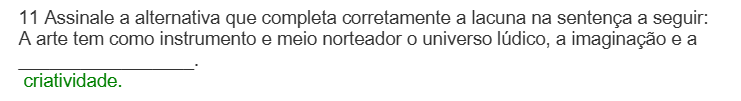 11 Assinale a alternativa que completa corretamente a lacuna na sentença a seguir: A arte tem como instrumento e meio norteador O universo lúdico, a imaginação e a criatividade.