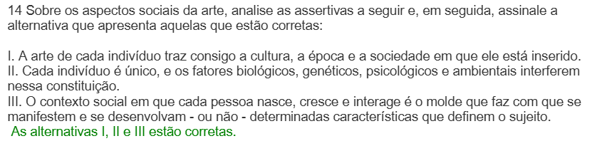 14 Sobre aspectos sociais da arte, analise as assertivas a seguir e, em seguida, assinale a alternativa que apresenta aquelas que estão corretas: I. A arte de cada indivíduo traz consigo a cultura, a época e a sociedade em que ele está inserido. II. Cada indivíduo é único, e OS fatores biológicos, genéticos, psicológicos e ambientais interferem nessa constituição. III. O contexto social em que cada pessoa nasce, cresce e interage é molde que faz com que se manifestem e se desenvolvam ou não determinadas características que definem sujeito. As alternativas I, II e III estão corretas.