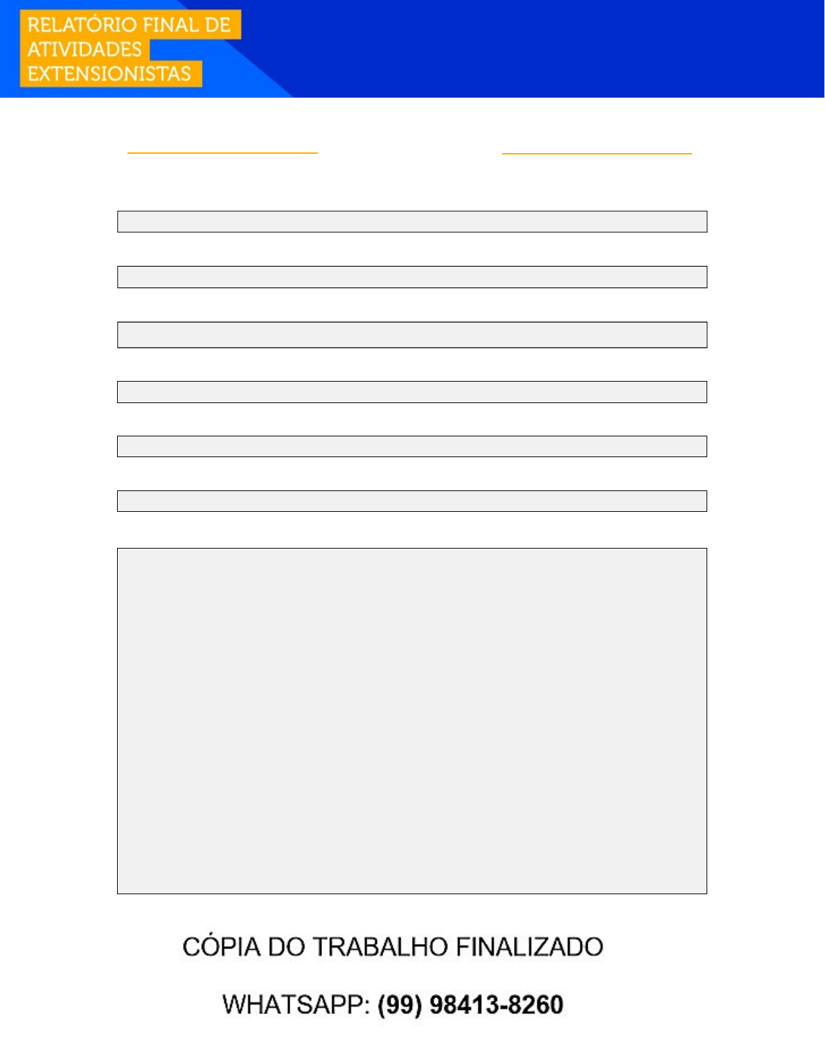 DADOS DO ALUNO Aluno: [Nome completo]*SOLICITE SEU ORÇAMENTO: (99) 98413-8260* RA: [Número do RA do aluno] *MODELOS: CÓPIA OU EXCLUSIVO* POLO / UNIDADE: CURSO: PSICOPEDAGOGIA - BACHARELADO COMPONENTE CURRICULAR: PROJETO DE EXTENSÃO II - PSICOPEDAGOGIA PROGRAMA DE EXTENSÃO: PROGRAMA DE SUSTENTABILIDADE. FINALIDADE E MOTIVAÇÃO: O programa extensionista voltado as ações de Sustentabilidade do curso de Psicopedagogia possui a finalidade de apoiar a comunidade por meio da educação, promovendo condições e reflexões para otimizar a relação da comunidade com o ambiente natural e o ambiente construído, priorizando o cuidado e compreensão do meio ambiente. Tais ações poderão reduzir impactos socioambientais negativos e criar uma cultura regenerativa para gerar impactos positivos que irão refletir no meio ambiente, que são importantes para possibilitar uma continuidade do uso de recursos naturais de forma sustentável. Ao identificar as problemáticas ambientais da comunidade os alunos terão a motivação para efetuar as ações de apoio relacionadas ao curso, pelas quais poderão ser desenvolvidas competências técnicas e soft skills específicas. Os conteúdos programáticos sugeridos para correlacionar as ações são: Fundamentos epistemológicos e sociológicos da educação; Educação Ambiental; Metodologias de ensino; Psicologia da Educação; Educação e diversidade; Pensamento científico. Os locais que poderão contemplar esse projeto são: Escolas; Instituições de Educação Básica; Organizações não governamentais, Associações de bairro, dentre outros. image1.jpeg image2.png