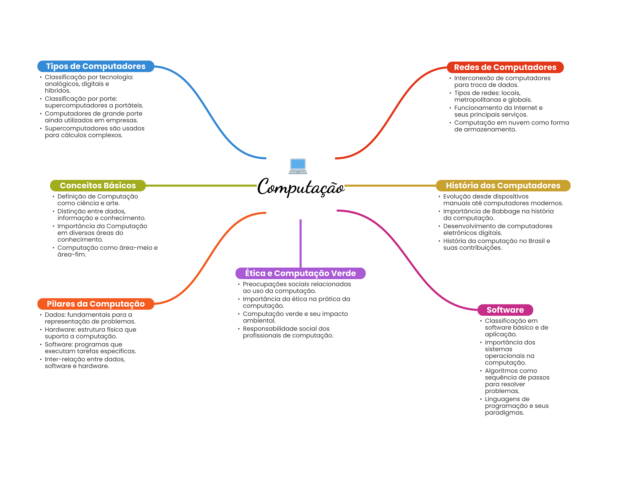 Tipos de Computadores Redes de Computadores Classificação por tecnologia: Interconexão de computadores analógicos, digitais e para troca de dados. híbridos. Tipos de redes: locais, Classificação por porte: metropolitanas e globais. supercomputadores a portáteis. Funcionamento da Internet e Computadores de grande porte seus principais serviços. ainda utilizados em empresas. Computação em nuvem como forma Supercomputadores são usados de armazenamento. para cálculos complexos. Conceitos Básicos Computação História dos Computadores Definição de Computação Evolução desde dispositivos como ciência e arte. manuais até computadores modernos. Distinção entre dados, Importância de Babbage na história informação e conhecimento. da computação. Importância da Computação Desenvolvimento de computadores em diversas áreas do eletrônicos digitais. conhecimento. História da computação no Brasil e Computação como área-meio e suas contribuições. área-fim. Ética e Computação Verde Preocupações sociais relacionadas ao uso da computação. Importância da ética na prática da Pilares da Computação computação. Software Dados: fundamentais para a Computação verde e seu impacto representação de problemas. ambiental. Classificação em Hardware: estrutura física que Responsabilidade social dos software básico e de suporta a computação. profissionais de computação. aplicação. Software: programas que Importância dos executam tarefas específicas. sistemas Inter-relação entre dados, operacionais na software e hardware. computação. Algoritmos como sequência de passos para resolver problemas. Linguagens de programação e seus paradigmas.