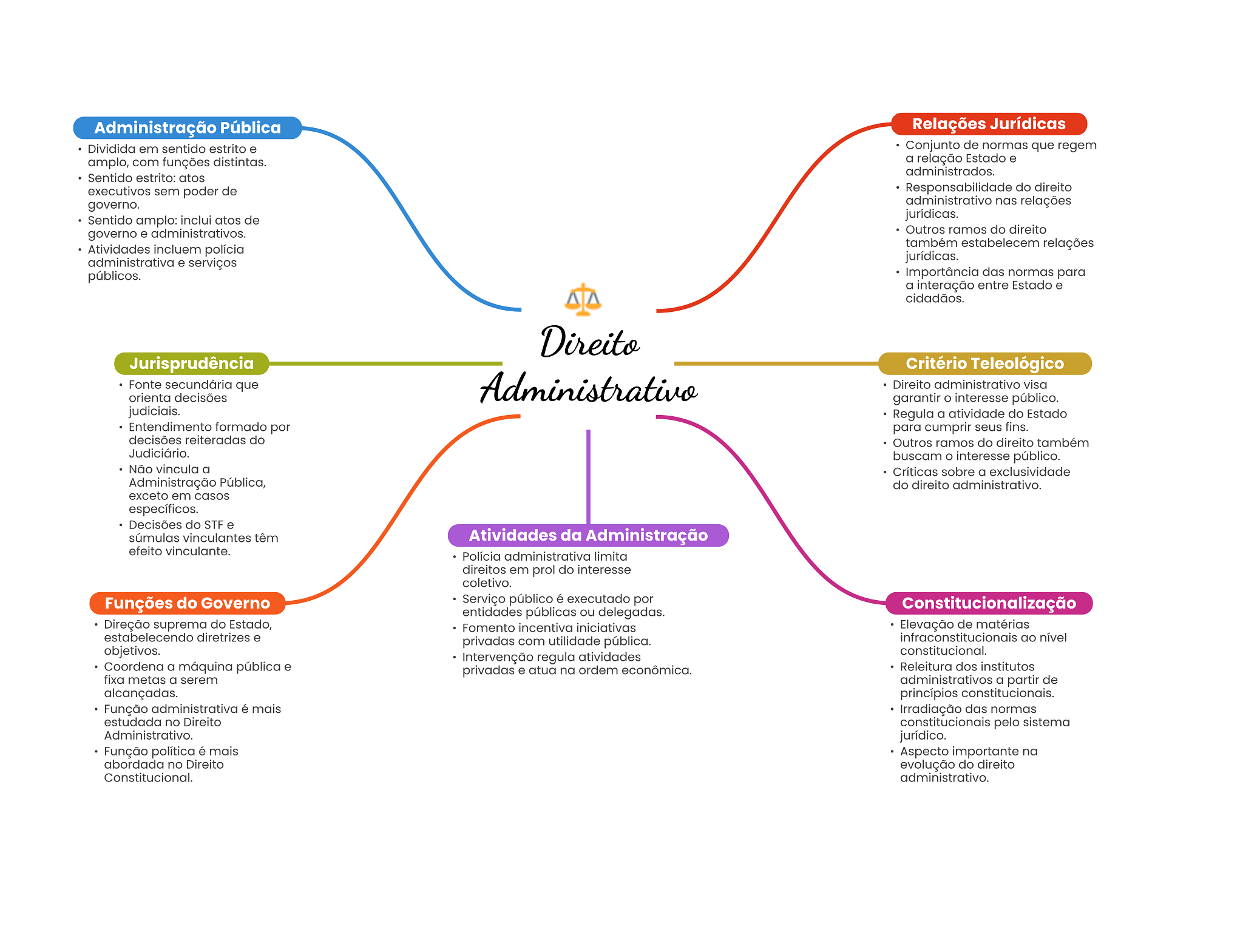 Administração Pública Relações Jurídicas Dividida em sentido estrito e Conjunto de normas que regem amplo, com funções distintas. a relação Estado e administrados. Sentido estrito: atos executivos sem poder de Responsabilidade do direito governo. administrativo nas relações Sentido amplo: inclui atos de jurídicas. governo e administrativos. Outros ramos do direito Atividades incluem polícia também estabelecem relações administrativa e serviços jurídicas. públicos. Importância das normas para a interação entre Estado e cidadãos. Direito Jurisprudência Critério Teleológico Fonte secundária que Administrativo Direito administrativo visa orienta decisões garantir interesse público. judiciais. Regula a atividade do Estado Entendimento formado por para cumprir seus fins. decisões reiteradas do Outros ramos do direito também Judiciário. buscam interesse público. Não vincula a Críticas sobre a exclusividade Administração Pública, do direito administrativo. exceto em casos específicos. Decisões do STF e súmulas vinculantes têm Atividades da Administração efeito vinculante. Polícia administrativa limita direitos em prol do interesse coletivo. Funções do Governo Serviço público é executado por Constitucionalização entidades públicas ou delegadas. Direção suprema do Estado, Fomento incentiva iniciativas Elevação de matérias estabelecendo diretrizes e privadas com utilidade pública. ao nível objetivos. constitucional. Intervenção regula atividades Coordena a máquina pública e privadas e atua na ordem econômica. Releitura dos institutos fixa metas a serem administrativos a partir de alcançadas. princípios constitucionais. Função administrativa é mais Irradiação das normas estudada no Direito constitucionais pelo sistema Administrativo. jurídico. Função política é mais Aspecto importante na abordada no Direito evolução do direito Constitucional. administrativo.