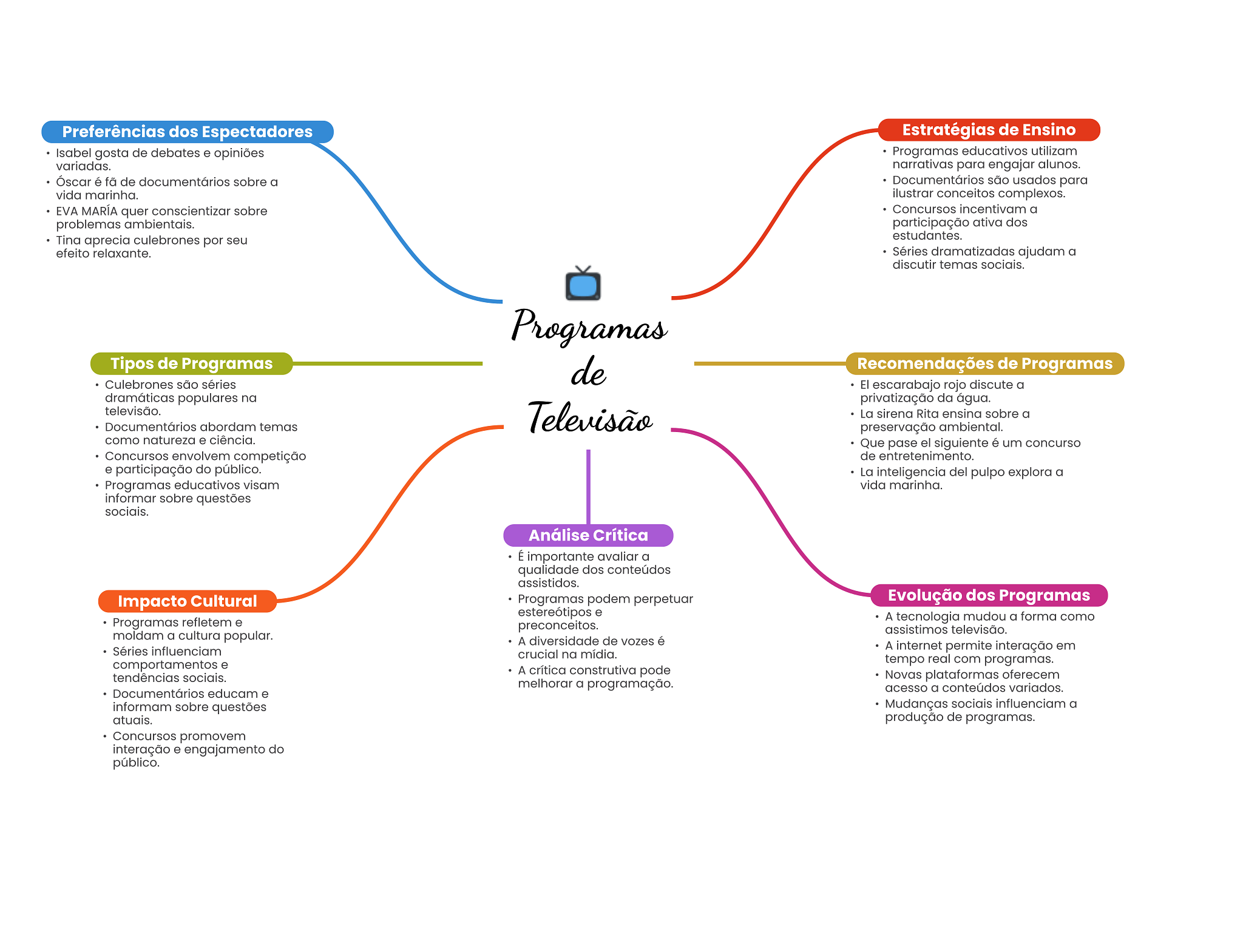 Preferências dos Espectadores Estratégias de Ensino Isabel gosta de debates e opiniões Programas educativos utilizam variadas. narrativas para engajar alunos. Óscar é fã de documentários sobre a Documentários são usados para vida marinha. ilustrar conceitos complexos. EVA MARÍA quer conscientizar sobre Concursos incentivam a problemas ambientais. participação ativa dos Tina aprecia culebrones por seu estudantes. efeito relaxante. Séries dramatizadas ajudam a discutir temas sociais. Programas Tipos de Programas de Recomendações de Programas Culebrones são séries El escarabajo rojo discute a dramáticas populares na privatização da água. televisão. Televisão La sirena Rita ensina sobre a Documentários abordam temas preservação ambiental. como natureza e ciência. Que pase el siguiente é um concurso Concursos envolvem competição de entretenimento. e participação do público. La inteligencia del pulpo explora a Programas educativos visam vida marinha. informar sobre questões sociais. Análise Crítica É importante avaliar a qualidade dos conteúdos assistidos. Impacto Cultural Programas podem perpetuar Evolução dos Programas e Programas refletem e A tecnologia mudou a forma como preconceitos. assistimos televisão. moldam a cultura popular. A diversidade de vozes é Séries influenciam A internet permite interação em crucial na mídia. comportamentos e tempo real com programas. A crítica construtiva pode tendências sociais. Novas plataformas oferecem melhorar a programação. Documentários educam e acesso a conteúdos variados. informam sobre questões Mudanças sociais influenciam a atuais. produção de programas. Concursos promovem interação e engajamento do público.