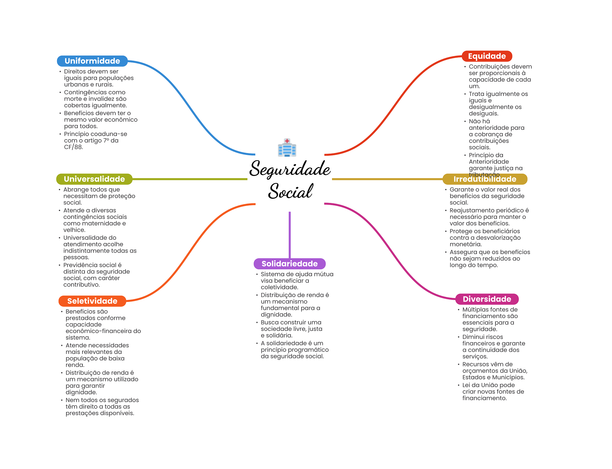 Uniformidade Equidade Contribuições devem Direitos devem ser ser proporcionais à iguais para populações capacidade de cada urbanas e rurais. um. Contingências como Trata igualmente morte e invalidez são iguais e cobertas igualmente. desigualmente os Benefícios devem ter desiguais. mesmo valor econômico Não há para todos. anterioridade para Princípio coaduna-se a cobrança de com artigo 7° da contribuições CF/88. sociais. Princípio da Anterioridade Seguridade garante justiça na tributação Universalidade Irredutibilidade Abrange todos que Social Garante valor real dos necessitam de proteção benefícios da seguridade social. social. Atende a diversas Reajustamento periódico é contingências sociais necessário para manter O como maternidade e valor dos benefícios. velhice. Protege OS beneficiários Universalidade do contra a desvalorização atendimento acolhe monetária. indistintamente todas as Assegura que OS benefícios pessoas. não sejam reduzidos ao Previdência social é Solidariedade longo do tempo. distinta da seguridade Sistema de ajuda mútua social, com caráter visa beneficiar a contributivo. coletividade. Distribuição de renda é Seletividade um mecanismo Diversidade Benefícios são fundamental para a Múltiplas fontes de prestados conforme dignidade. financiamento são capacidade Busca construir uma essenciais para a econômico-financeira do sociedade livre, justa seguridade. sistema. e solidária. Diminui riscos Atende necessidades A solidariedade é um financeiros e garante mais relevantes da princípio programático a continuidade dos população de baixa da seguridade social. serviços. renda. Recursos vêm de Distribuição de renda é orçamentos da União, um mecanismo utilizado Estados e Municípios. para garantir Lei da União pode dignidade. criar novas fontes de Nem todos OS segurados financiamento. têm direito a todas as prestações disponíveis.