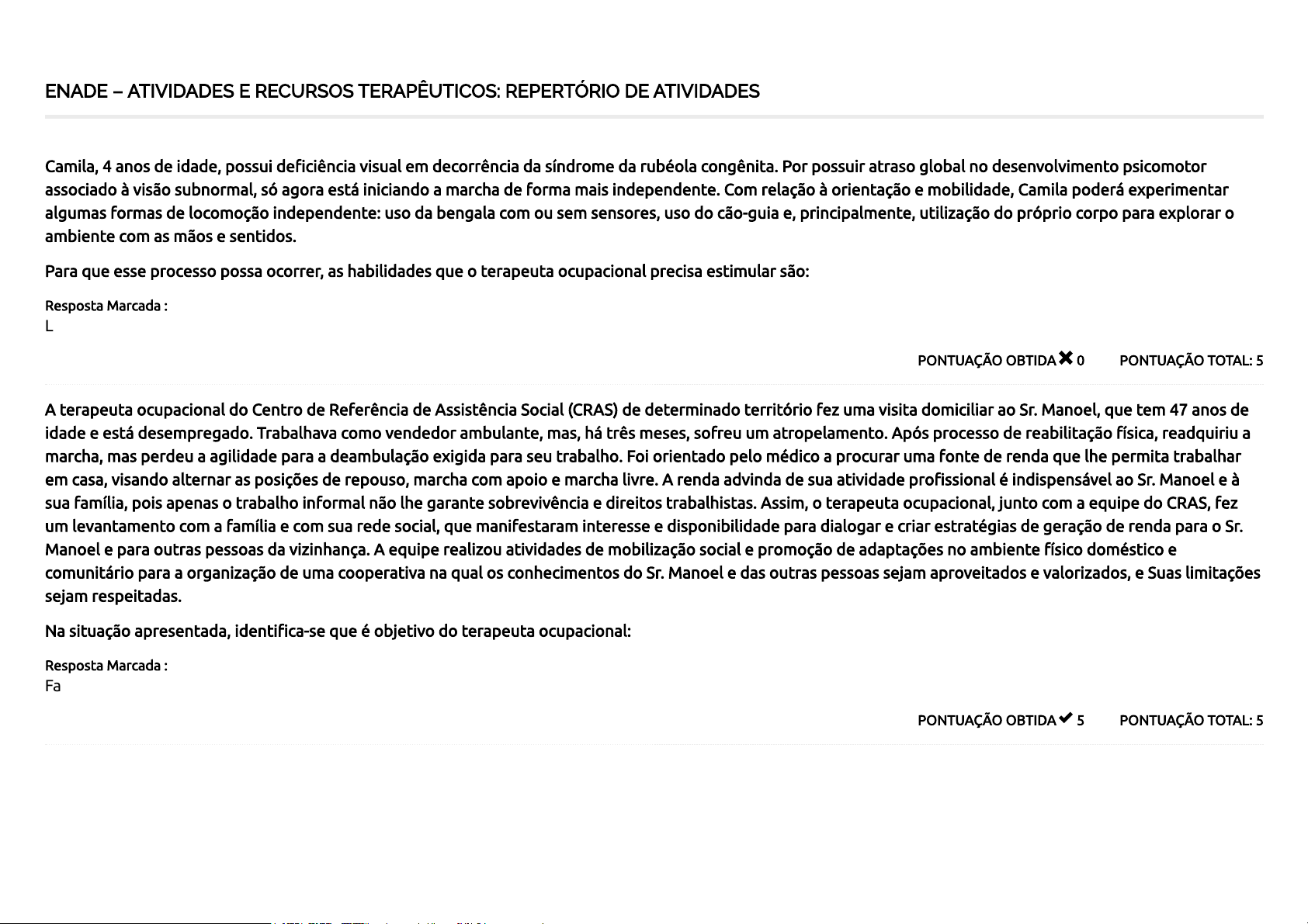 11/08/2025 14:17 Course Status – AVA Saúde Unifaveni https://ava.saude.unifaveni.com.br/course-status/ 1/3 ENADE – ATIVIDADES E RECURSOS TERAPÊUTICOS: REPERTÓRIO DE ATIVIDADES PONTUAÇÃO TOTAL: 5PONTUAÇÃO OBTIDA 0 Camila, 4 anos de idade, possui de�ciência visual em decorrência da síndrome da rubéola congênita. Por possuir atraso global no desenvolvimento psicomotor associado à visão subnormal, só agora está iniciando a marcha de forma mais independente. Com relação à orientação e mobilidade, Camila poderá experimentar algumas formas de locomoção independente: uso da bengala com ou sem sensores, uso do cão-guia e, principalmente, utilização do próprio corpo para explorar o ambiente com as mãos e sentidos. Para que esse processo possa ocorrer, as habilidades que o terapeuta ocupacional precisa estimular são: Resposta Marcada : Lateralidade, ritmo e coordenação motora �na. PONTUAÇÃO TOTAL: 5PONTUAÇÃO OBTIDA 5 A terapeuta ocupacional do Centro de Referência de Assistência Social (CRAS) de determinado território fez uma visita domiciliar ao Sr. Manoel, que tem 47 anos de idade e está desempregado. Trabalhava como vendedor ambulante, mas, há três meses, sofreu um atropelamento. Após processo de reabilitação física, readquiriu a marcha, mas perdeu a agilidade para a deambulação exigida para seu trabalho. Foi orientado pelo médico a procurar uma fonte de renda que lhe permita trabalhar em casa, visando alternar as posições de repouso, marcha com apoio e marcha livre. A renda advinda de sua atividade pro�ssional é indispensável ao Sr. Manoel e à sua família, pois apenas o trabalho informal não lhe garante sobrevivência e direitos trabalhistas. Assim, o terapeuta ocupacional, junto com a equipe do CRAS, fez um levantamento com a família e com sua rede social, que manifestaram interesse e disponibilidade para dialogar e criar estratégias de geração de renda para o Sr. Manoel e para outras pessoas da vizinhança. A equipe realizou atividades de mobilização social e promoção de adaptações no ambiente físico doméstico e comunitário para a organização de uma cooperativa na qual os conhecimentos do Sr. Manoel e das outras pessoas sejam aproveitados e valorizados, e Suas limitações sejam respeitadas. Na situação apresentada, identi�ca-se que é objetivo do terapeuta ocupacional: Resposta Marcada : Favorecer a reinserção do Sr. Manoel no mercado de trabalho, considerando sua necessidade de renda. 11/08/2025 14:17 Course Status – AVA Saúde Unifaveni https://ava.saude.unifaveni.com.br/course-status/ 2/3 PONTUAÇÃO TOTAL: 5PONTUAÇÃO OBTIDA 0 Ester tem 16 anos de idade e, em virtude da prática de ato infracional, foi encaminhada para um serviço que assiste adolescentes e jovens em medida Socioeducativa de liberdade assistida. Ester reside com a mãe, o padrasto e o �lho de 1 ano e 4 meses de idade, em um bairro popular de um grande centro urbano, com condições habitacionais bastante precárias. Interrompeu os estudos no 6.º ano e está à procura de emprego, mas alega di�culdade por não ter com quem deixar seu �lho. Considerando a situação hipotética apresentada, avalie as a�rmativas que se seguem: I. A prática de ato infracional empreitada por Ester deve ser compreendida a partir da situação de pobreza, considerando que a baixa renda familiar determina a violência. II. A situação de vulnerabilidade e risco vivenciada por Ester é exempli�cada na interrupção dos estudos e, consequentemente, na baixa escolaridade, o que tem di�cultado a sua inserção no mercado de trabalho. III. Cabe ao terapeuta ocupacional do serviço acolher as demandas de Ester e propor estratégias de inserção social, como o retorno à escola, a inclusão de seu �lho na rede municipal de educação infantil e a sua inserção em cursos pro�ssionalizantes. IV. A adolescente e a terapeuta ocupacional têm autonomia para decidirem sobre a obrigatoriedade do cumprimento da medida socioeducativa. V. Ester, no período em que se encontra em liberdade assistida, deve ter seus direitos fundamentais — assegurados, cabendo ao terapeuta ocupacional acompanhá-la e orientá-la nas suas escolhas e fazeres ocupacionais. É correto apenas o que se a�rma em: Resposta Marcada : II, III e IV 11/08/2025 14:17 Course Status – AVA Saúde Unifaveni https://ava.saude.unifaveni.com.br/course-status/ 3/3 10 / 20 PONTUAÇÃO TOTAL: 5PONTUAÇÃO OBTIDA 5 Antônio, com 40 anos de idade, trabalha como bancário desde os 25 anos. Há aproximadamente 4 anos, Antônio referiu início de sintomas de dor, cansaço e diminuição de sensibilidade no antebraço e nas mãos, com predomínio no membro superior direito (MSD). Ao consultar o médico do trabalho, devido ao aumento dos sintomas e à di�culdade em realizar as atividades pro�ssionais, foi diagnosticado com quadro referente à Doença Osteomuscular Relacionada ao Trabalho (DORT) e encaminhado para o terapeuta ocupacional de um centro de referência em saúde do trabalhador. A partir da situação descrita, avalie as seguintes estratégias de intervenção desenvolvidas pelo terapeuta ocupacional nesse serviço: I. Avaliar as condições clinicas de edema com a utilização de volúmetro, as condições de sensibilidade com uso de estesiômetro e de força com provas de funções musculares, para a identi�cação e conscientização das alterações por parte do trabalhador e dar início ao tratamento. II. Realizar atendimentos grupais com pessoas com sintomas e incapacidades provenientes de DORT com foco no aprendizado do autocuidado, a partir de abordagens terapêuticas corporais para melhor percepção e consciência do próprio corpo e diminuição dos sintomas. III. Solicitar junto ao INSS o afastamento do trabalhador para a realização do tratamento, tendo em vista a gravidade do quadro, com sintomas que já são crônicos e que podem ser agravados com a manutenção d