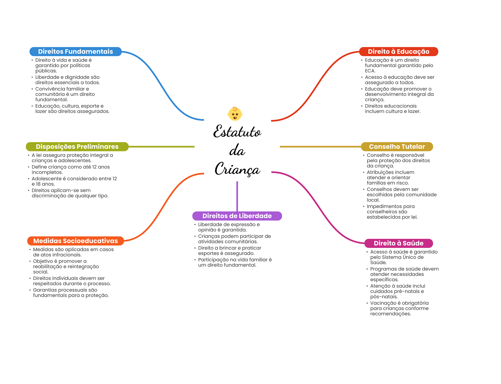Direitos Fundamentais Direito à Educação Direito à vida e saúde é Educação é um direito garantido por políticas fundamental garantido pelo públicas. ECA. Liberdade e dignidade são Acesso à educação deve ser direitos essenciais a todos. assegurado a todos. Convivência familiar e Educação deve promover comunitária é um direito desenvolvimento integral da fundamental. criança. Educação, cultura, esporte e Direitos educacionais lazer são direitos assegurados. incluem cultura e lazer. Estatuto Disposições Preliminares da Conselho Tutelar A lei assegura proteção integral a Conselho é responsável crianças e adolescentes. pela proteção dos direitos Define criança como até 12 anos incompletos. Criança da criança. Atribuições incluem Adolescente é considerado entre 12 atender e orientar e 18 anos. famílias em risco. Direitos aplicam-se sem Conselhos devem ser discriminação de qualquer tipo. escolhidos pela comunidade local. Impedimentos para conselheiros são Direitos de Liberdade estabelecidos por lei. Liberdade de expressão e opinião é garantida. Crianças podem participar de Medidas Socioeducativas atividades comunitárias. Direito à Saúde Medidas são aplicadas em casos Direito a brincar e praticar de atos infracionais. esportes é assegurado. Acesso à saúde é garantido Objetivo é promover a Participação na vida familiar é pelo Sistema Único de Saúde. reabilitação e reintegração um direito fundamental. social. Programas de saúde devem atender necessidades Direitos individuais devem ser específicas. respeitados durante processo. Atenção à saúde inclui Garantias processuais são cuidados pré-natais e fundamentais para a proteção. pós-natais. Vacinação é obrigatória para crianças conforme recomendações.