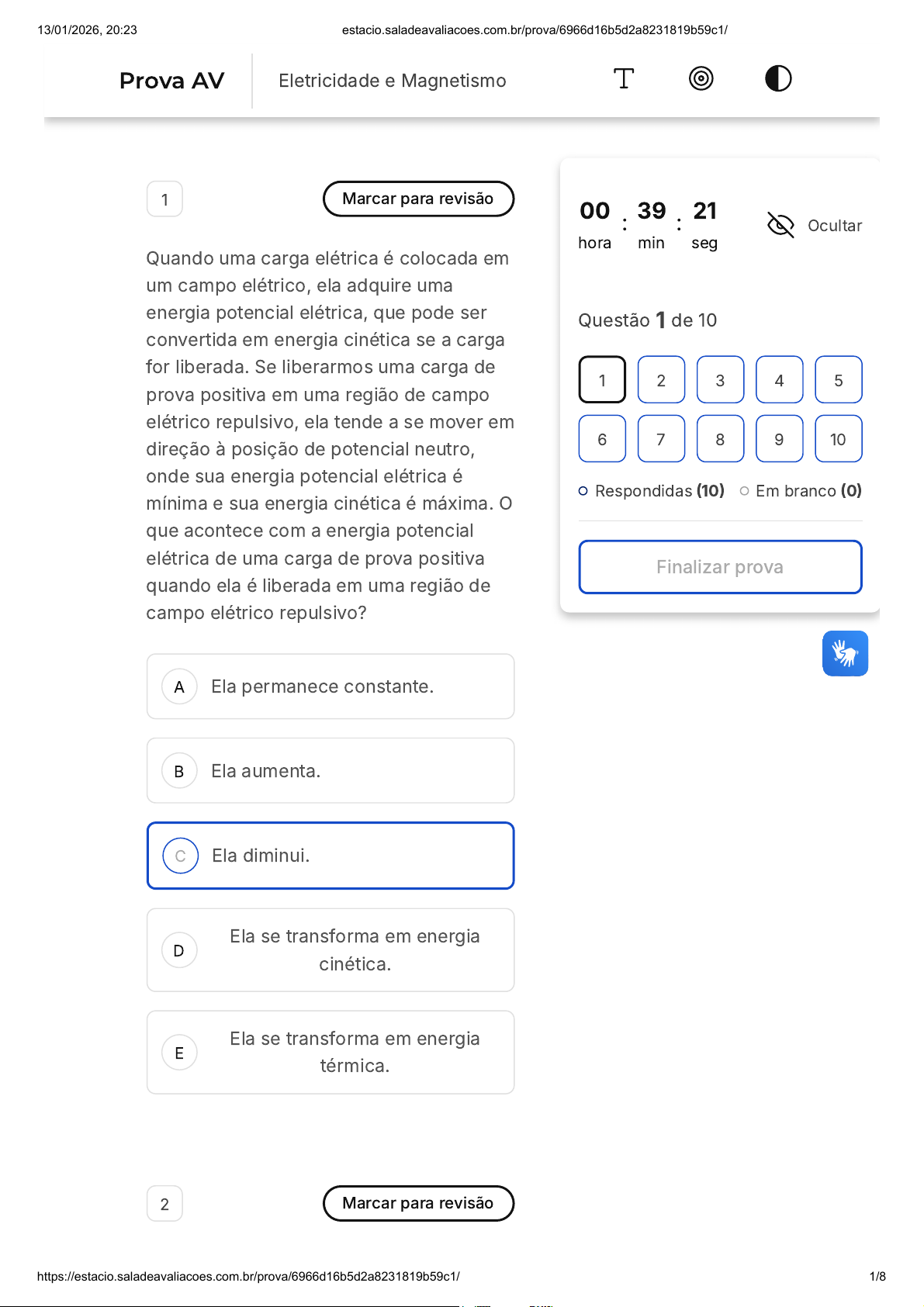 A B C D E 1 Marcar para revisão Quando uma carga elétrica é colocada em um campo elétrico, ela adquire uma energia potencial elétrica, que pode ser convertida em energia cinética se a carga for liberada. Se liberarmos uma carga de prova positiva em uma região de campo elétrico repulsivo, ela tende a se mover em direção à posição de potencial neutro, onde sua energia potencial elétrica é mínima e sua energia cinética é máxima. O que acontece com a energia potencial elétrica de uma carga de prova positiva quando ela é liberada em uma região de campo elétrico repulsivo? Ela permanece constante. Ela aumenta. Ela diminui. Ela se transforma em energia cinética. Ela se transforma em energia térmica. 2 Marcar para revisão 00 hora : 39 min : 21 seg Ocultar Questão 1 de 10 Respondidas (10) Em branco (0) Finalizar prova 1 2 3 4 5 6 7 8 9 10 Prova AV Eletricidade e Magnetismo 13/01/2026, 20:23 estacio.saladeavaliacoes.com.br/prova/6966d16b5d2a8231819b59c1/ https://estacio.saladeavaliacoes.com.br/prova/6966d16b5d2a8231819b59c1/ 1/8 A B C D E Um circuito elétrico simples, possui uma f.e.m. ideal (resistência interna zero) de 8 V e um resistor ôhmico de . Sua corrente elétrica, com esse resistor elétrico de , é de I = 2 A. A potência consumida por esse resistor é P = 16 W. Mas se substituirmos o resistor de por outro resistor com , qual será a potência de consumo do novo resistor elétrico de ? 4Ω 4Ω 4Ω 8Ω 8Ω P = 16 W P = 0 W P = 8 W P = 10 W P = 4 W 3 Marcar para revisão Considere uma espira condutora, que é um fio enrolado em forma de uma única volta. Quando uma corrente elétrica passa por essa espira, ela gera um campo magnético ao seu redor. Uma espira condutora percorrida por uma corrente elétrica produz um campo magnético que: 13/01/2026, 20:23 estacio.saladeavaliacoes.com.br/prova/6966d16b5d2a8231819b59c1/ https://estacio.saladeavaliacoes.com.br/prova/6966d16b5d2a8231819b59c1/ 2/8 A B C D E A B Possui linhas de campo simétricas em relação ao centro da espira Tem linhas de campo que se estendem indefinidamente no espaço Forma um padrão de linhas de campo paralelas ao plano da espira Não se fecha em um grande arco Não produz campo magnético ao redor da espira 4 Marcar para revisão Na eletricidade, é comum associarmos a direção da corrente elétrica à diferença de potencial elétrico existente entre os pontos do circuito. Qual é a direção da corrente elétrica em um circuito que apresenta uma diferença de potencial elétrico de 12V, em que o ponto de maior potencial é o ponto A e o ponto de menor potencial é o ponto B? A -> B B -> A 13/01/2026, 20:23 estacio.saladeavaliacoes.com.br/prova/6966d16b5d2a8231819b59c1/ https://estacio.saladeavaliacoes.com.br/prova/6966d16b5d2a8231819b59c1/ 3/8 C D E A B C D E A B Não é possível determinar a direção da corrente elétrica a partir das informações fornecidas. A corrente elétrica não flui em circuitos com diferença de potencial elétrico. 5 Marcar para revisão Um anel circular, de raio R, foi homogeneamente carregado com carga total Q. Calcule seu campo elétrico na direção axial z, no centro do anel. 13/01/2026, 20:23 estacio.saladeavaliacoes.com.br/prova/6966d16b5d2a8231819b59c1/ https://estacio.saladeavaliacoes.com.br/prova/6966d16b5d2a8231819b59c1/ 4/8 A B C D E 6 Marcar para revisão Em uma associação em série com 1.000 resistores ôhmicos de cada, qual é a resistência equivalente total dessa associação? 10 Ω Req = 104 Ω Req = 103 Ω Req = 102 Ω Req = 101 Ω Req = 100 Ω 7 Marcar para revisão Imagine um anel condutor circular percorrido por uma corrente elétrica. Esse anel pode ser comparado a uma bobina circular, com uma única volta. Quando a corrente elétrica percorre o anel, ela cria um campo magnético ao seu redor. Nesse anel condutor circular percorrido por uma corrente elétrica, o campo magnético gerado apresenta um padrão de linhas de campo que: 13/01/2026, 20:23 estacio.saladeavaliacoes.com.br/prova/6966d16b5d2a8231819b59c1/ https://estacio.saladeavaliacoes.com.br/prova/6966d16b5d2a8231819b59c1/ 5/8 A B C D E A B C São simétricas em relação ao elemento de corrente Se estendem apenas ao longo do eixo do anel Formam um único arco que se fecha no centro do anel São perpendiculares ao plano do anel condutor Não se fecham em um grande arco 8 Marcar para revisão Um capacitor de placas planas e paralelas, com área de cada placa A=10 cm , afastamento entre as placas, d=0,1 cm , e capacitância, C=150 μF, é alimentado com uma f.e.m. variável V(t)=127 sen(120 π t) Volts . Calcule o valor máximo da corrente de deslocamento de Maxwell I entre as placas do capacitor e escolha a opção que melhor represente esse cálculo. 2 dMax IdMax = 3, 19A IdMax = 15, 24A IdMax = 0, 056A 13/01/2026, 20:23 estacio.saladeavaliacoes.com.br/prova/6966d16b5d2a8231819b59c1/ https://estacio.saladeavaliacoes.com.br/prova/6966d16b5d2a8231819b59c1/ 6/8 D E A B C D E IdMax = 19, 1A IdMax = 7, 18A 9 Marcar para revisão Duas cargas elétricas estão alinhadas na direção de x, estando a carga na origem x = 0 e a carga em x = 10 cm. O vetor campo elétrico em um ponto P=5, 12cm, do plano xy, localizado perpendicularmente à linha que conecta as cargas e equidistante destas, é: (q1 = 12nC e q2 = 12nC) q1 q2 →Er = 0 →Er = 1, 8 × 104N/C (ι̂ + ȷ̂) →Er = 1, 8 × 104N/C ȷ̂ →Er = 1, 8 × 104N/C ι̂ →Er = 1, 8 × 104N/C 10 Marcar para revisão Considere uma casca esférica de raio e densidade superficial de cargas elétricas . Obtenha o Potencial Elétrico desta R σ 13/01/2026, 20:23 estacio.saladeavaliacoes.com.br/prova/6966d16b5d2a8231819b59c1/ https://estacio.saladeavaliacoes.com.br/prova/6966d16b5d2a8231819b59c1/ 7/8 A B C D E casca, a uma distância , do centro da casca, em função da densidade superficial de cargas e da constante de Coulomb k, de tal maneira que . r ≫ R σ r → ∞ V (r) = k σ 4πR2/r V (r) = k σ 4πR V (r) = k Q/r V (r) = k σ 4