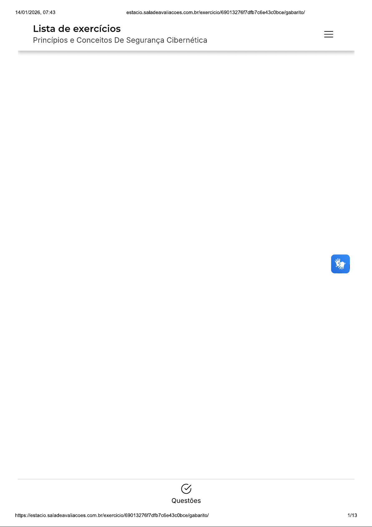 14/01/2026, 07:43 Lista de exercícios Princípios e Conceitos De Segurança Cibernética Questões 1/1314/01/2026, 07:43 Você acertou 6 de 10 questões Verifique seu desempenho e continue treinando! Você pode refazer exercício quantas vezes quiser. Verificar Desempenho 1 Marcar para revisão Em uma entidade pública, um funcionário notou que havia várias ações necessárias para a correta classificação da informação, visando seu melhor uso. Em uma dessas ações, percebeu que era preciso designar apenas os indivíduos que participassem diretamente do processo de aquisição de novos equipamentos eletrônicos. Feito isso, esses indivíduos poderiam então ter acesso às informações sobre os processos de aquisição de equipamentos novos. Essa etapa se enquadra em qual dos procedimentos de Classificação do Grau de Sensibilidade da Informação? A Categorizar a informação. Etiquetar as informações. c Atribuir dono para ativo de TI. D Atribuir detentor para o ativo de TI. E Relacionar a informação com o ativo. 2/1314/01/2026, 07:43 Gabarito Comentado Identifica-se, em relação ao enunciado da questão, a etapa do processo de classificação de sensibilidade da informação denominada "Categorizar a informação". Nesse procedimento, é definido quais indivíduos podem ter acesso às informações inseridas nos ativos de uma organização, de acordo com a relação desses indivíduos com assunto dessas informações ou com a necessidade da organização em conceder acesso a indivíduos de acordo com sua função. "Etiquetar as informações" é o procedimento utilizado para atribuir graus de sensibilidade como secreto ou confidencial, por exemplo. "Atribuir dono para ativo de TI" ocorre quando precisa-se designar alguém para ter responsabilidade pelo acesso de outros usuários às informações dos ativos de interesse. "Atribuir detentor para o ativo de TI" refere-se à ação de designar alguém para que preserve a integridade física do ativo e "Relacionar a informação com ativo" é uma ação que não faz parte do escopo dos procedimentos para Classificação do Grau de Sensibilidade da Informação. 2 Marcar para revisão Para a implementação de redes seguras em uma empresa, um técnico pode valer-se de medidas como segmentação e segregação das redes corporativa e de visitantes, bem como adotar soluções como adoção de sistema de log para auditoria de atividades em rede. A implementação dessas medidas é documentada em qual fase da estruturação do Plano de Cibersegurança? A Identificação. Recuperação. c Resposta. D 3/1314/01/2026, 07:43 E Proteção. Resposta correta Parabéns, você selecionou a alternativa correta. Confira gabarito comentado! Gabarito Comentado A fase de Proteção no Plano de Cibersegurança é onde são documentadas as medidas adotadas para minimizar ou anular impacto de um incidente cibernético. Nessa fase, são incluídas ações como a segregação e segmentação de redes, que visam separar as redes de visitantes e corporativa para evitar acesso não autorizado à rede corporativa. Além disso, a adoção de um sistema de log para auditoria de atividades em rede também é uma medida de proteção, pois permite registro de ações anômalas e a notificação de possíveis incidentes. Portanto, as ações descritas no enunciado estão vinculadas à fase de Proteção do Plano de Cibersegurança. 3 Marcar para revisão Uma firma de advocacia necessita atribuir valor de seus dados para que possa contratar um seguro contra eventos da natureza, como enchentes. Para isso, a firma procederá com uma análise de riscos para viabilizar a contratação de uma apólice que cubra todos os riscos aos quais está exposta. Diante disso, primeiro procedimento será avaliar quais os valores de todos os equipamentos eletrônicos em sua sede. Em qual dos seguintes objetivos da Análise de Riscos se enquadra esse procedimento? A Determinar as ameaças relevantes. Determinar as vulnerabilidades. 4/1314/01/2026, 07:43 D Implementar as contramedidas de mitigação do risco. Estabelecer um equilíbrio entre os custos de um incidente e os custos E de uma medida de segurança. Resposta correta Parabéns, você selecionou a alternativa correta. Confira gabarito comentado! Gabarito Comentado procedimento descrito no enunciado se enquadra no objetivo de "Identificar ativos e seus valores" na Análise de Riscos. Nesta etapa, todos os ativos de interesse para a organização são listados e seus respectivos valores são mensurados, de acordo com os critérios adotados pela própria organização. Não houve menção à determinação de ameaças ou vulnerabilidades nos equipamentos eletrônicos, nem ao estabelecimento de um equilíbrio entre os custos dos equipamentos eletrônicos e os custos de medidas de segurança para esses equipamentos. Além disso, a implementação de contramedidas de mitigação do risco não é um objetivo da Análise de Riscos. 4 Marcar para revisão Uma empresa pode realizar a classificação das informações que são criadas, obtidas, processadas e armazenadas em seus ativos de forma a potencializar o uso de informações relevantes nas transações de negócios. Em determinada organização, percebeu-se que uma informação importante, relativa aos produtos mais consumidos de seu catálogo de vendas, não era conhecida, causando maiores custos para produção de itens menos populares e, consequentemente, menores taxas de lucro. Qual princípio da Classificação da Importância da Informação possui relação nesse contexto? A Princípio da Ausência. 5/1314/01/2026, 07:43 c Princípio da Presença. D Princípio da Disponibilidade e Princípio da Oportunidade. E Princípio da Sensibilidade e Princípio da Presença. Resposta correta Parabéns, você selecionou a alternativa correta. Confira gabarito comentado! Gabarito Comentado A Classificação da Importância da Informação é aferida por dois princípios: Princípi