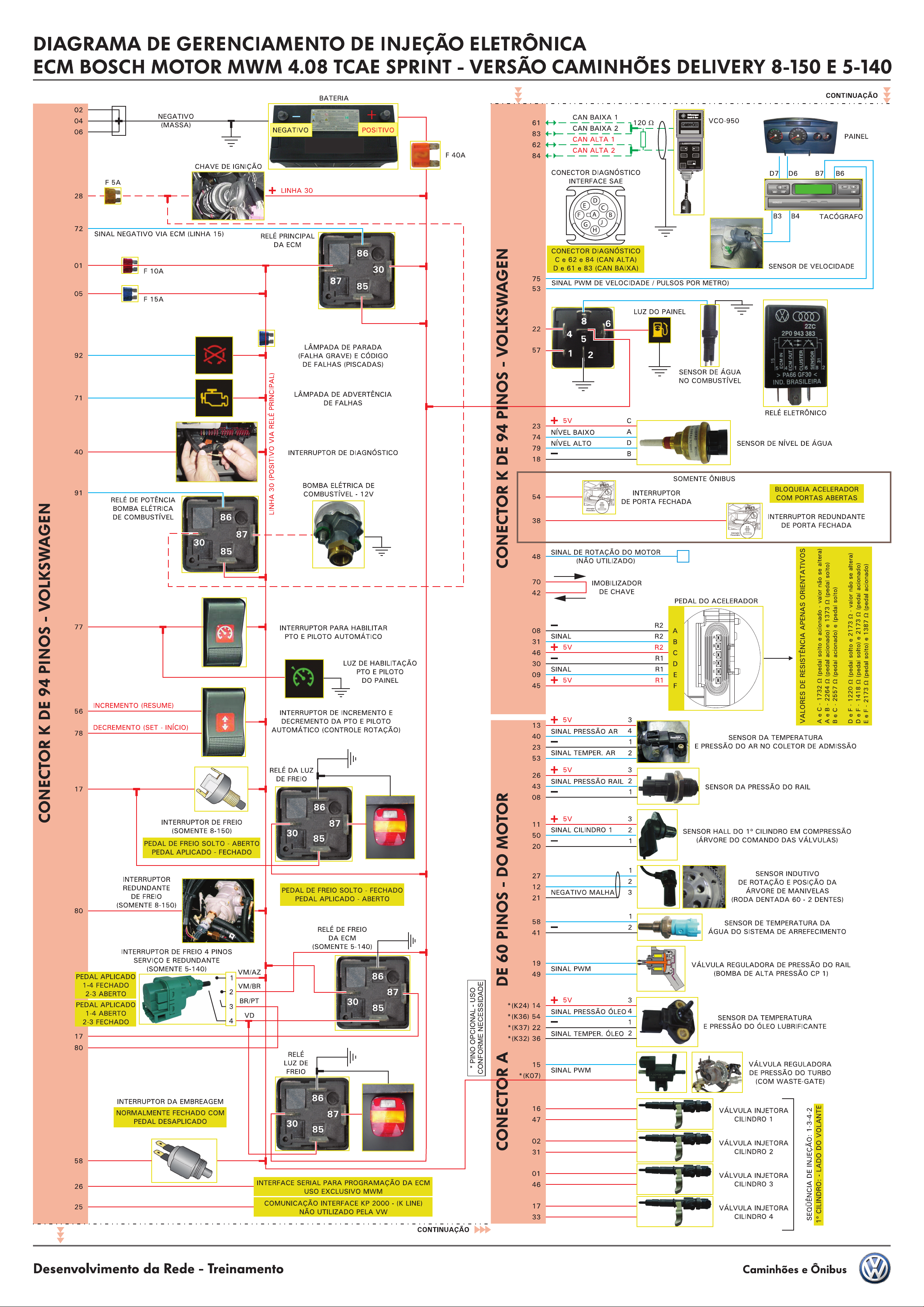 DIAGRAMA DE GERENCIAMENTO DE INJEÇÃO ELETRÔNICA ECM BOSCH MOTOR MWM 4.08 TCAE SPRINT VERSÃO CAMINHÕES DELIVERY 8-150 E 5-140 BATERIA CONTINUAÇÃO 02 NEGATIVO CAN BAIXA 04 (MASSA) 61 VCO-950 06 NEGATIVO POSITIVO CAN BAIXA 2 83 CAN ALTA PAINEL 62 CAN ALTA 84 CHAVE DE CONECTOR DIAGNÓSTICO D7 D6 B7 B6 5A INTERFACE SAE + LINHA 30 28 B4 TACÓGRAFO 72 SINAL NEGATIVO VIA ECM (LINHA 15) RELÉ PRINCIPAL DA ECM 86 CONECTOR DIAGNÓSTICO 62 84 (CAN ALTA) 01 30 D 61 83 (CAN BAIXA) SENSOR DE VELOCIDADE 10A 87 75 85 SINAL PWM DE VELOCIDADE PULSOS POR METRO) 53 05 15A LUZ DO PAINEL CONECTOR DE 94 PINOS VOLKSWAGEN 8 22 2ZC 4 383 5 LÂMPADA DE PARADA 57 92 (FALHA GRAVE) CÓDIGO 1 2 DE FALHAS (PISCADAS) SENSOR DE ÁGUA PA66 GF30 NO COMBUSTÍVEL IND BRASILEIRA LÂMPADA DE ADVERTÊNCIA 71 LINHA 30 (POSITIVO VIA RELÉ PRINCIPAL) DE FALHAS RELÉ ELETRÔNICO 5V C 23 NÍVEL BAIXO A 74 NÍVEL ALTO D SENSOR DE NÍVEL DE ÁGUA 79 40 INTERRUPTOR DE DIAGNÓSTICO B 18 SOMENTE ÔNIBUS BOMBA ELÉTRICA DE BLOQUEIA ACELERADOR 91 COMBUSTÍVEL 12V INTERRUPTOR RELÉ DE POTÊNCIA 54 COM PORTAS ABERTAS DE PORTA FECHADA BOMBA ELÉTRICA DE COMBUSTÍVEL 86 INTERRUPTOR REDUNDANTE 38 DE PORTA FECHADA 87 30 85 SINAL DE ROTAÇÃO DO MOTOR 48 (NÃO UTILIZADO) CONECTOR DE 94 PINOS VOLKSWAGEN 70 IMOBILIZADOR 42 DE CHAVE PEDAL DO ACELERADOR 77 INTERRUPTOR PARA HABILITAR R2 08 A PTO E PILOTO AUTOMÁTICO SINAL R2 31 + 5V R2 46 R1 LUZ DE HABILITAÇÃO 30 D PTO PILOTO SINAL R1 VALORES DE RESISTÊNCIA APENAS ORIENTATIVOS solto e acionado valor não se altera) 2264 2 (pedal acionado) e 1373 (pedal solto) 1220 (pedal solto e 2173 valor não se altera) 09 E 2557 Ω (pedal acionado) (pedal solto) 1418 solto) 1 (pedal acionado) 2173 (pedal solto) 1387 Ω (pedal acionado) DO PAINEL 5V R1 45 INCREMENTO (RESUME) 56 INTERRUPTOR DE INCREMENTO E DECREMENTO DA PTO E PILOTO 5V 3 A D DECREMENTO (SET INÍCIO) 13 78 AUTOMÁTICO (CONTROLE ROTAÇÃO) SINAL PRESSÃO AR 4 40 SENSOR DA TEMPERATURA 1 23 E PRESSÃO DO AR NO COLETOR DE ADMISSÃO SINAL TEMPER. AR 2 53 RELÉ DA LUZ 5V 3 26 DE FREIO SINAL PRESSÃO RAIL 2 17 43 SENSOR DA PRESSÃO DO RAIL 1 08 86 INTERRUPTOR DE FREIO 5V 3 87 11 (SOMENTE 8-150) 30 SINAL CILINDRO 1 2 SENSOR HALL DO CILINDRO EM COMPRESSÃO 85 50 PEDAL DE FREIO SOLTO ABERTO 1 (ÁRVORE DO COMANDO DAS VÁLVULAS) 20 PEDAL APLICADO FECHADO 1 27 SENSOR INDUTIVO INTERRUPTOR 2 DE ROTAÇÃO POSIÇÃO DA REDUNDANTE PEDAL DE FREIO SOLTO FECHADO DE 60 PINOS DO MOTOR 12 NEGATIVO MALHA 3 ÁRVORE DE MANIVELAS DE FREIO PEDAL APLICADO ABERTO 21 (RODA DENTADA 60 2 DENTES) (SOMENTE 8-150) 80 1 58 SENSOR DE TEMPERATURA DA DE FREIO 2 41 ÁGUA DO SISTEMA DE ARREFECIMENTO DA ECM (SOMENTE 5-140) INTERRUPTOR DE FREIO PINOS SERVICO REDUNDANTE 19 VÁLVULA REGULADORA DE PRESSÃO DO RAIL (SOMENTE 5-140) SINAL PWM VM/AZ PEDAL APLICADO 1 86 49 (BOMBA DE ALTA PRESSÃO CP 1) 1-4 FECHADO VM/BR 2-3 ABERTO 2 87 BR/PT 30 3 PEDAL APLICADO 3 85 1-4 ABERTO VD 2-3 FECHADO 4 PINO OPCIONAL USO CONFORME NECESSIDADE + 5V *(K24) 14 SINAL PRESSÃO ÓLEO 4 *(K36) 54 SENSOR DA TEMPERATURA - 1 E PRESSÃO DO ÓLEO LUBRIFICANTE 17 SINAL TEMPER. ÓLEO 2 80 RELÉ LUZ DE 15 VÁLVULA REGULADORA FREIO SINAL PWM CONECTOR A DE PRESSÃO DO TURBO *(K07) (COM INTERRUPTOR DA EMBREAGEM 86 16 NORMALMENTE FECHADO COM VÁLVULA INJETORA 87 PEDAL DESAPLICADO 47 CILINDRO 30 85 02 VÁLVULA INJETORA 31 CILINDRO 2 58 01 VÁLVULA INJETORA INTERFACE SERIAL PARA PROGRAMAÇÃO DA ECM 26 46 CILINDRO 3 USO EXCLUSIVO MWM SEQÜÊNCIA DE 1-3-4-2 CILINDRO: LADO DO VOLANTE COMUNICAÇÃO INTERFACE 2000 LINE) 25 17 VÁLVULA INJETORA NÃO UTILIZADO PELA VW 33 CILINDRO 4 CONTINUAÇÃO Desenvolvimento da Rede Treinamento Caminhões e Ônibus