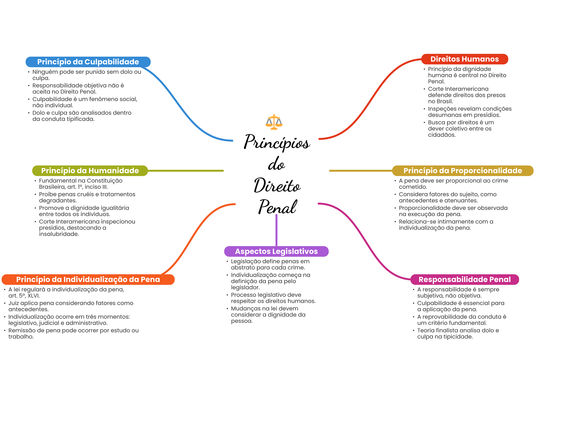 Princípio da Culpabilidade Direitos Humanos Ninguém pode ser punido sem dolo ou Princípio da dignidade humana é central no Direito culpa. Penal. Responsabilidade objetiva não é Corte Interamericana aceita no Direito Penal. defende direitos dos presos Culpabilidade é um fenômeno social, no Brasil. não individual. Inspeções revelam condições Dolo e culpa são analisados dentro desumanas em presídios. da conduta tipificada. Busca por direitos é um dever coletivo entre cidadãos. do Princípio da Humanidade Princípio da Proporcionalidade Fundamental na Constituição Direito A pena deve ser proporcional ao crime Brasileira, art. 1°, inciso III. cometido. Proíbe penas cruéis e tratamentos Considera fatores do sujeito, como degradantes. antecedentes e atenuantes. Promove a dignidade igualitária Penal Proporcionalidade deve ser observada entre todos OS indivíduos. na execução da pena. Corte Interamericana inspecionou Relaciona-se intimamente com a presídios, destacando a individualização da pena. insalubridade. Aspectos Legislativos Legislação define penas em abstrato para cada crime. Individualização começa na Princípio da Individualização da Pena definição da pena pelo Responsabilidade Penal A lei regulará a individualização da pena, legislador. A responsabilidade é sempre art. 5°, XLVI. Processo legislativo deve subjetiva, não objetiva. Juiz aplica pena considerando fatores como respeitar OS direitos humanos. Culpabilidade é essencial para antecedentes. Mudanças na lei devem a aplicação da pena. Individualização ocorre em três momentos: considerar a dignidade da A reprovabilidade da conduta é legislativo, judicial e administrativo. pessoa. um critério fundamental. Remissão de pena pode ocorrer por estudo ou Teoria finalista analisa dolo e trabalho. culpa na tipicidade.