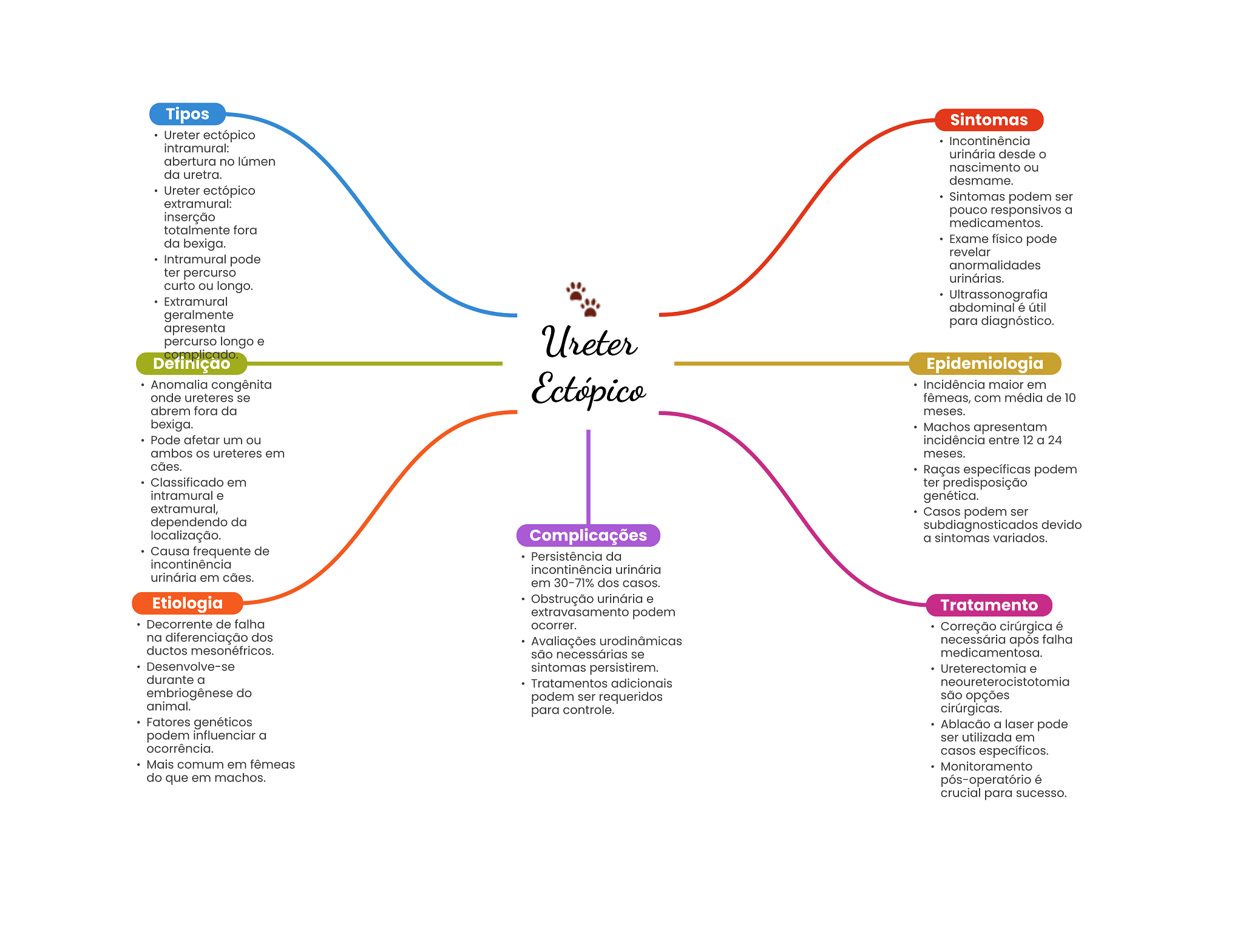 Tipos Sintomas Ureter ectópico Incontinência intramural: urinária desde abertura no lúmen nascimento ou da uretra. desmame. Ureter ectópico extramural: Sintomas podem ser inserção pouco responsivos a medicamentos. totalmente fora da bexiga. Exame físico pode revelar Intramural pode anormalidades ter percurso urinárias. curto ou longo. Extramural Ultrassonografia abdominal é útil geralmente para diagnóstico. apresenta percurso longo e Ureter complicado. Definíção Epidemiologia Anomalia congênita Ectópico Incidência maior em onde ureteres se fêmeas, com média de 10 abrem fora da meses. bexiga. Machos apresentam Pode afetar um ou incidência entre 12 a 24 ambos ureteres em meses. cães. Raças específicas podem Classificado em ter predisposição intramural e genética. extramural, Casos podem ser dependendo da subdiagnosticados devido localização. Complicações a sintomas variados. Causa frequente de Persistência da incontinência incontinência urinária urinária em cães. em 30-71% dos casos. Etiologia Obstrução urinária e Tratamento extravasamento podem Decorrente de falha ocorrer. Correção cirúrgica é na diferenciação dos Avaliações urodinâmicas necessária após falha ductos mesonéfricos. são necessárias se medicamentosa. Desenvolve-se sintomas persistirem. Ureterectomia e durante a Tratamentos adicionais neoureterocistotomia embriogênese do podem ser requeridos são opções animal. para controle. cirúrgicas. Fatores genéticos Ablação a laser pode podem influenciar a ser utilizada em ocorrência. casos específicos. Mais comum em fêmeas Monitoramento do que em machos. pós-operatório é crucial para sucesso.