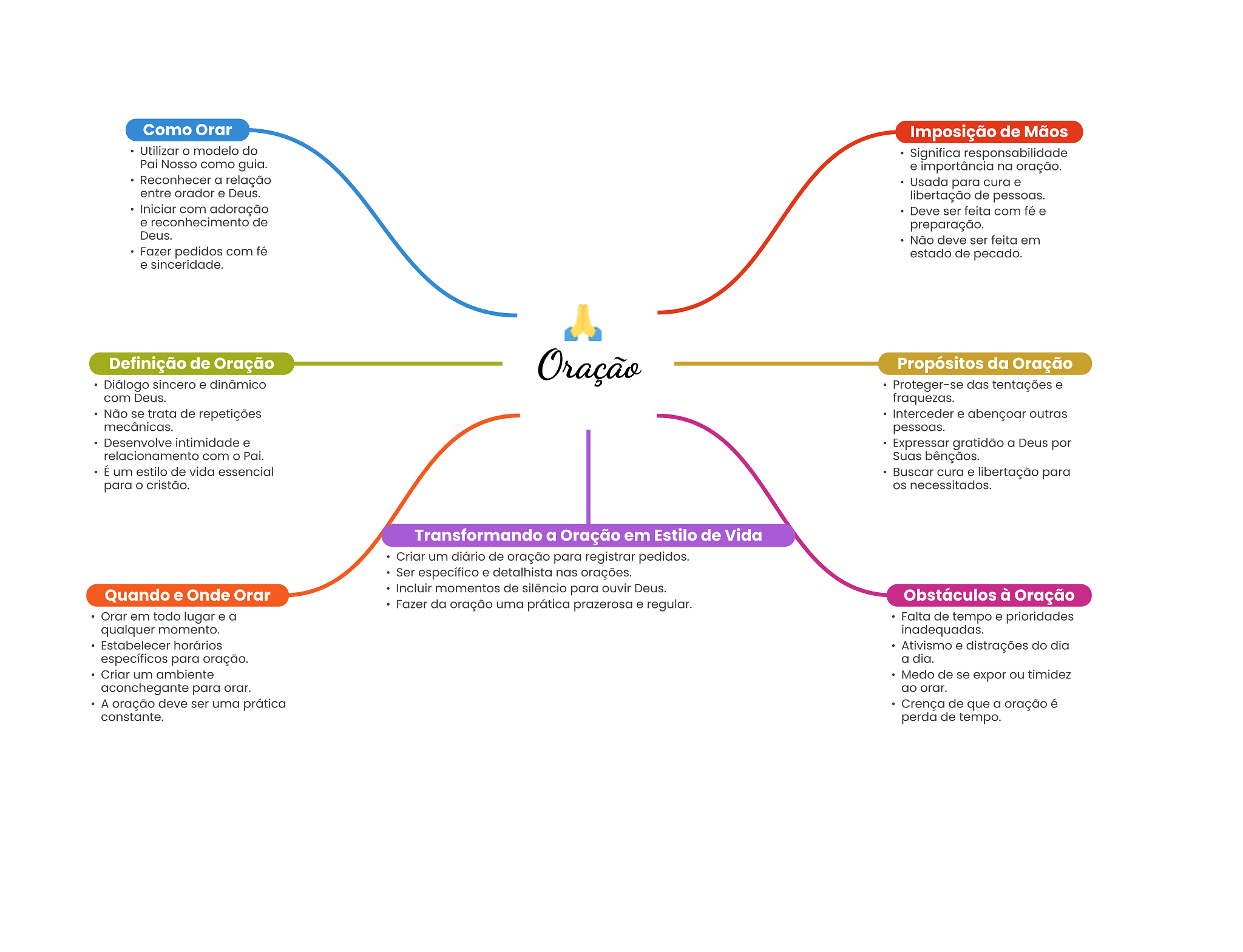 Como Orar Imposição de Mãos Utilizar modelo do Significa responsabilidade Pai Nosso como guia. e importância na oração. Reconhecer a relação Usada para cura e entre orador e Deus. libertação de pessoas. Iniciar com adoração Deve ser feita com fé e e reconhecimento de preparação. Deus. Não deve ser feita em Fazer pedidos com fé estado de pecado. e sinceridade. Definição de Oração Oração Propósitos da Oração Diálogo sincero e dinâmico Proteger-se das tentações e com Deus. fraquezas. Não se trata de repetições Interceder e abençoar outras mecânicas. pessoas. Desenvolve intimidade e Expressar gratidão a Deus por relacionamento com Pai. Suas bênçãos. É um estilo de vida essencial Buscar cura e libertação para para cristão. OS necessitados. Transformando a Oração em Estilo de Vida Criar um diário de oração para registrar pedidos. Ser específico e detalhista nas orações. Quando e Onde Orar Incluir momentos de silêncio para ouvir Deus. Obstáculos à Oração Fazer da oração uma prática prazerosa e regular. Orar em todo lugar e a Falta de tempo e prioridades qualquer momento. inadequadas. Estabelecer horários Ativismo e distrações do dia específicos para oração. a dia. Criar um ambiente Medo de se expor ou timidez aconchegante para orar. ao orar. A oração deve ser uma prática Crença de que a oração é constante. perda de tempo.